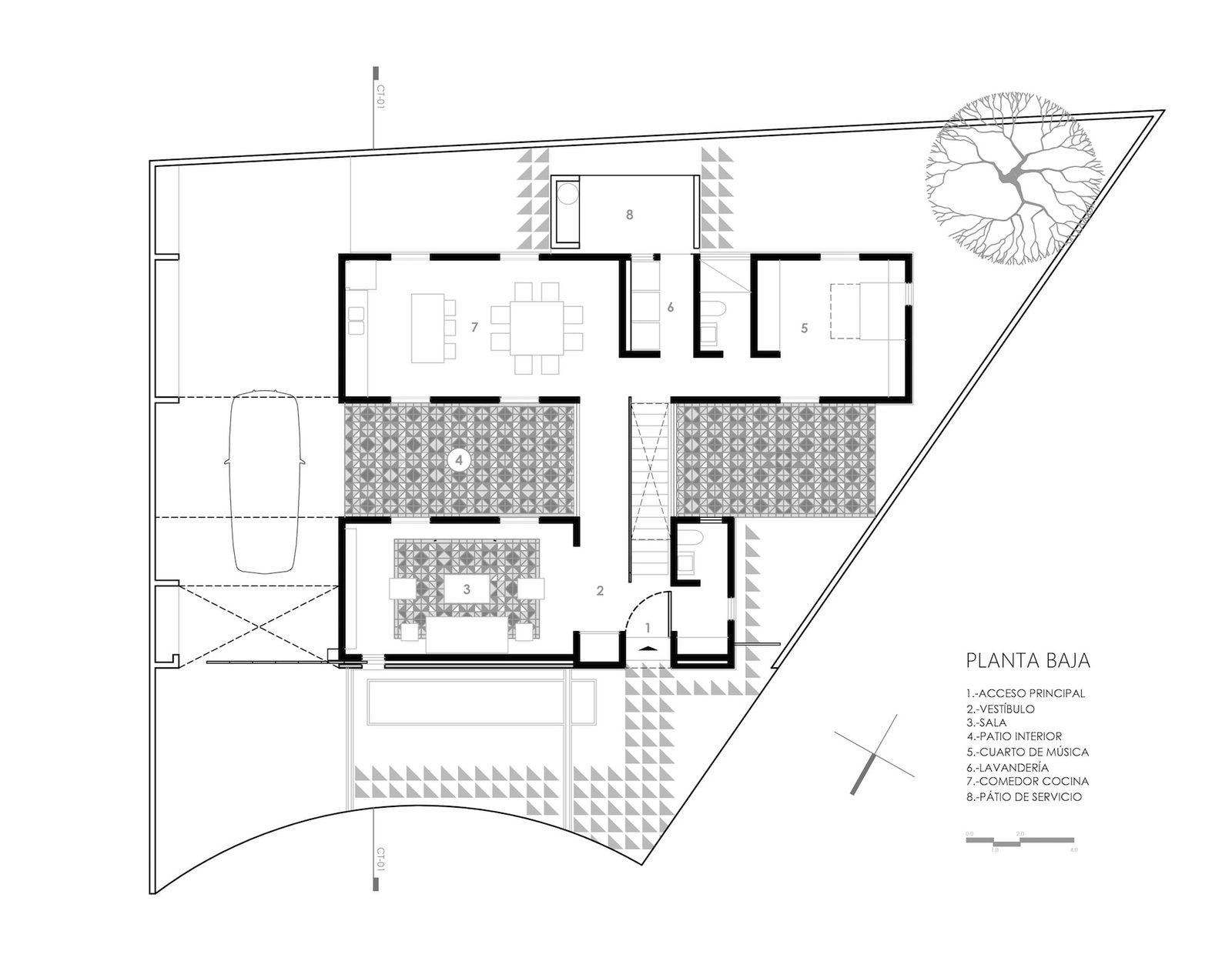 Se compone de dos volúmenes antepuestos que solventan en su interior las necesidades y requerimientos de sus usuarios dando como resultado un partido arquitectónico simple que contiene una sucesión de tres patios dispuestos en sentido longitudinal.
