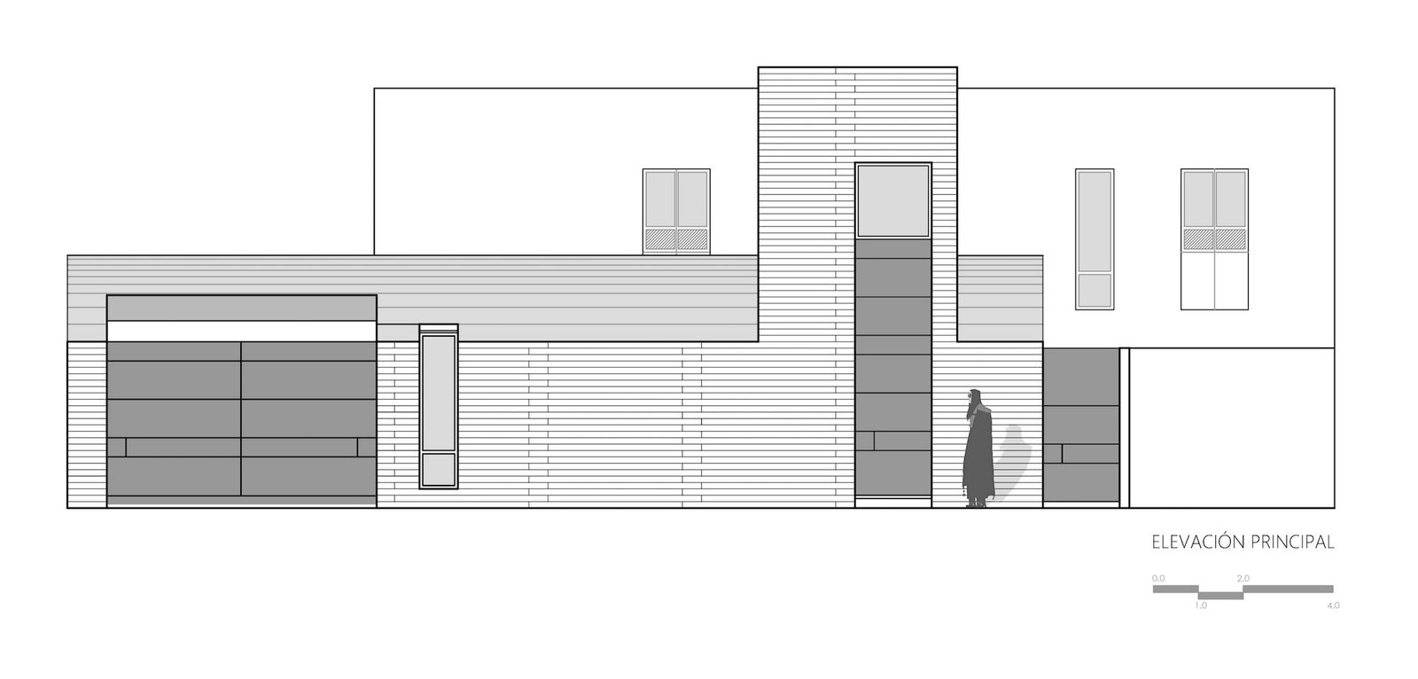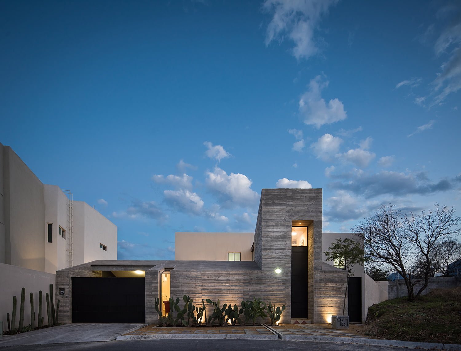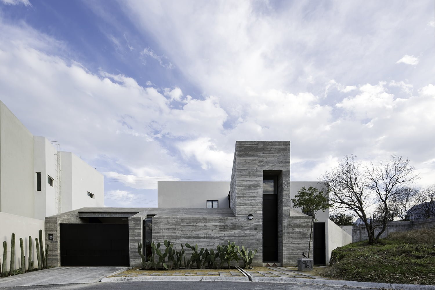 El volumen frontal se resuelve en un solo nivel remarcando únicamente el acceso principal a doble altura para rematar la fachada y a la cual se consigue accesar a través de una disposición de huellas de concreto en forma triangular descansadas en un atrio de tierra compactada de la región que ceden continuidad a la calle y a la banqueta del fraccionamiento.