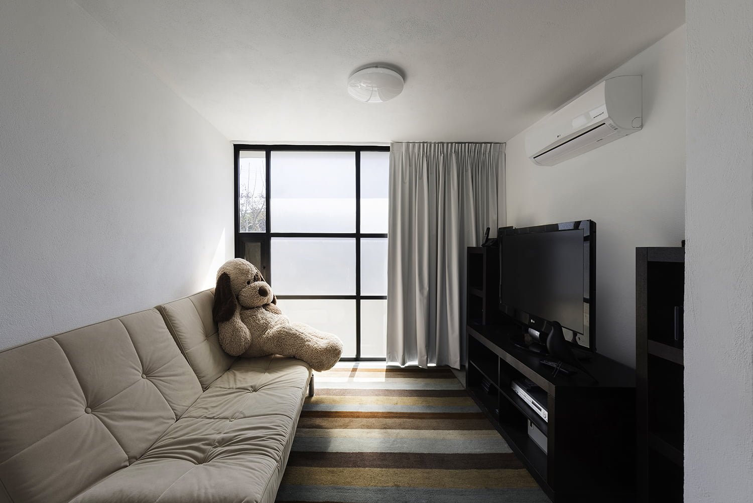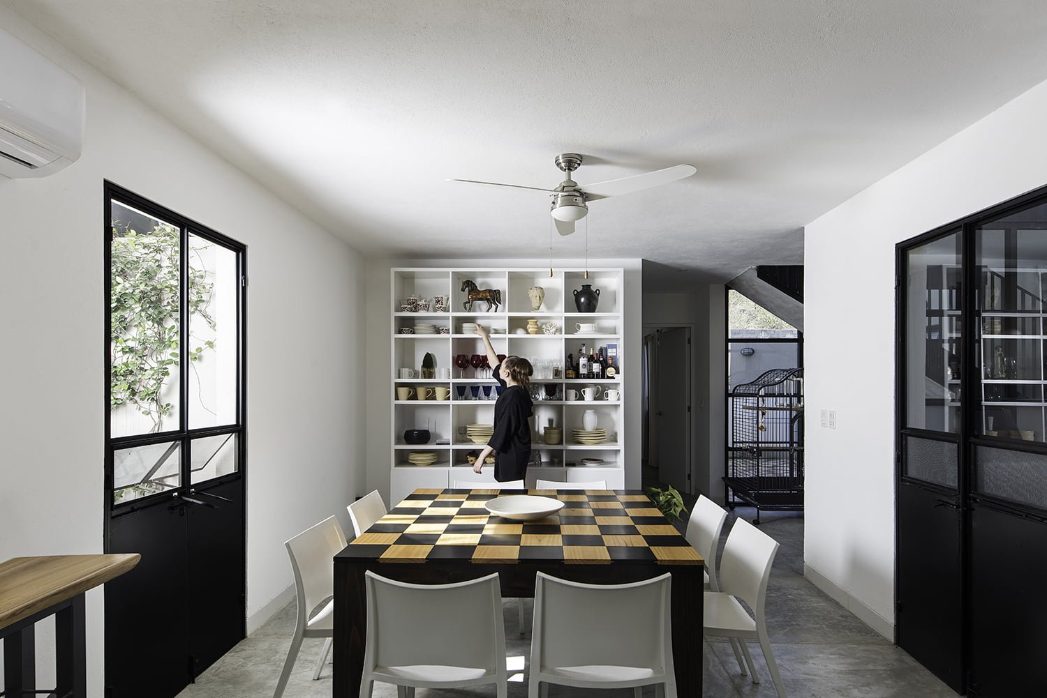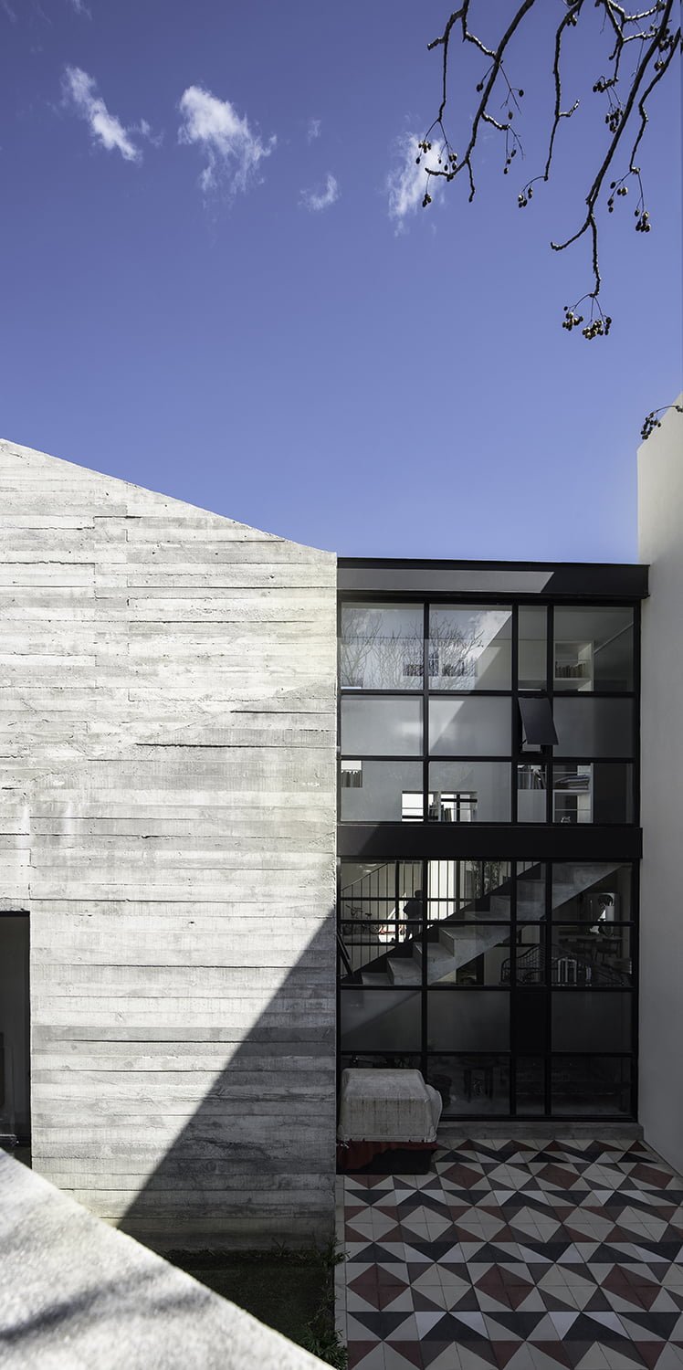 El volumen posterior es de dos niveles y se separa del volumen frontal por un patio central corrido que funciona como una extensión de las áreas sociales , cocina y de estudio en planta baja y que además facilita la ventilación, las vistas y el asoleamiento del conjunto, este patio es seccionado en dos por una escalera dentro de un tercer volumen acristalado que integra las conexiones vertical y horizontal de la vivienda. El patio posterior tiene dos áreas jardinadas que envuelven la zona de patio de servicio y lavandería y que permiten la continuidad de las vistas desde la casa.