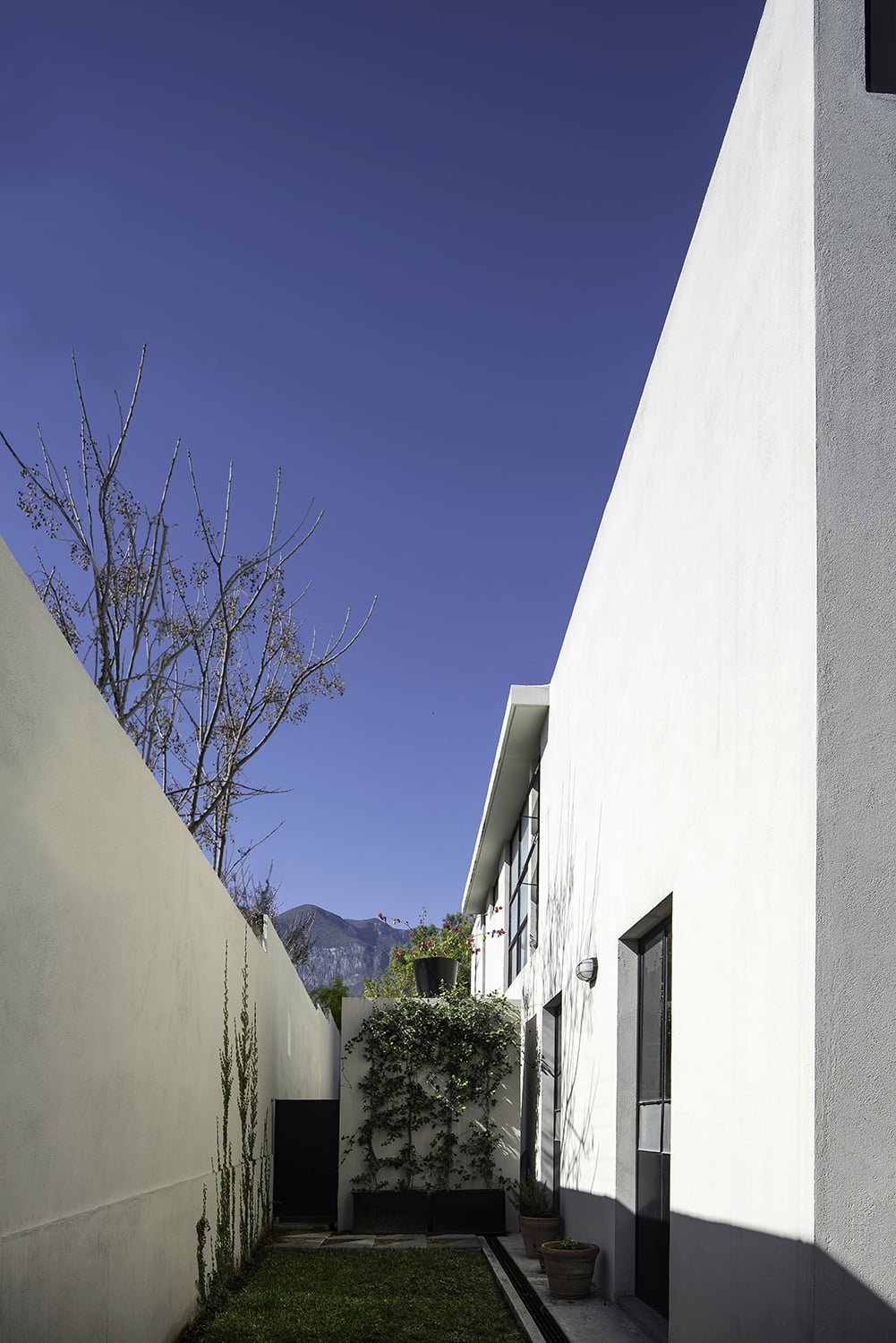 En la vivienda se contempló el uso de plantas endémicas y/o de bajo mantenimiento. En el acceso se utilizaron cactáceas como el nopal y el órgano, así como la hierba de potro, un árbol estilizado que provoca sombra pero que también permite seguir viendo la geometría de la casa. En el patio central se utilizó una enredadera de jazmín de la India a manera de parra para tamizar la luz y en el patio posterior se remató el jardín con un olmo.