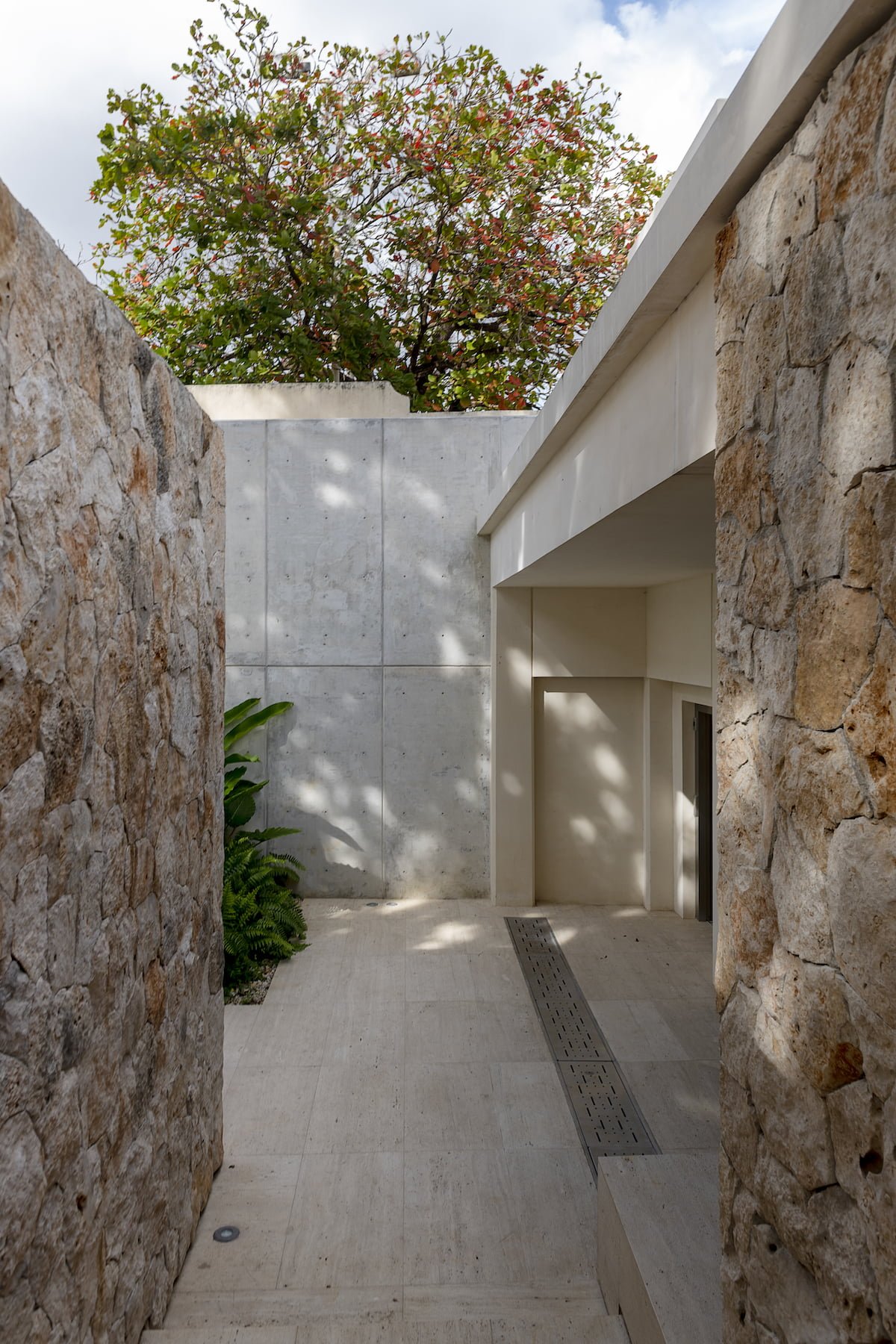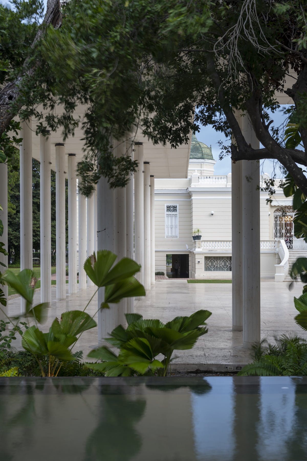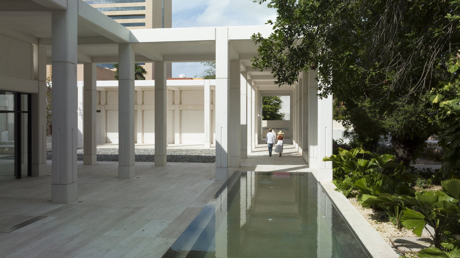 De este modo, el diseño propone una serie de pórticos que generan recorridos y envuelven espacios públicos exteriores y armónicos. Las columnas y cerramientos enmarcan vistas hacia la casa, los jardines y el pabellón, integrando visualmente todos los elementos. El proyecto busca generar un espacio público, entendiendo la arquitectura como lienzo material y espacial, para atestiguar su paso en el tiempo, así como el abrazo de las sombras que regalan la luz y el cielo yucateco en las superficies construidas.