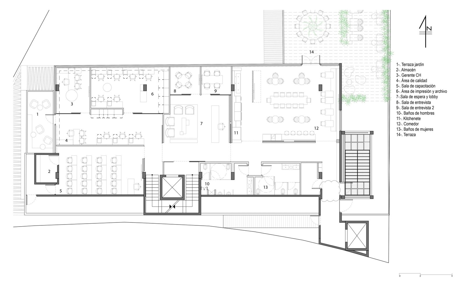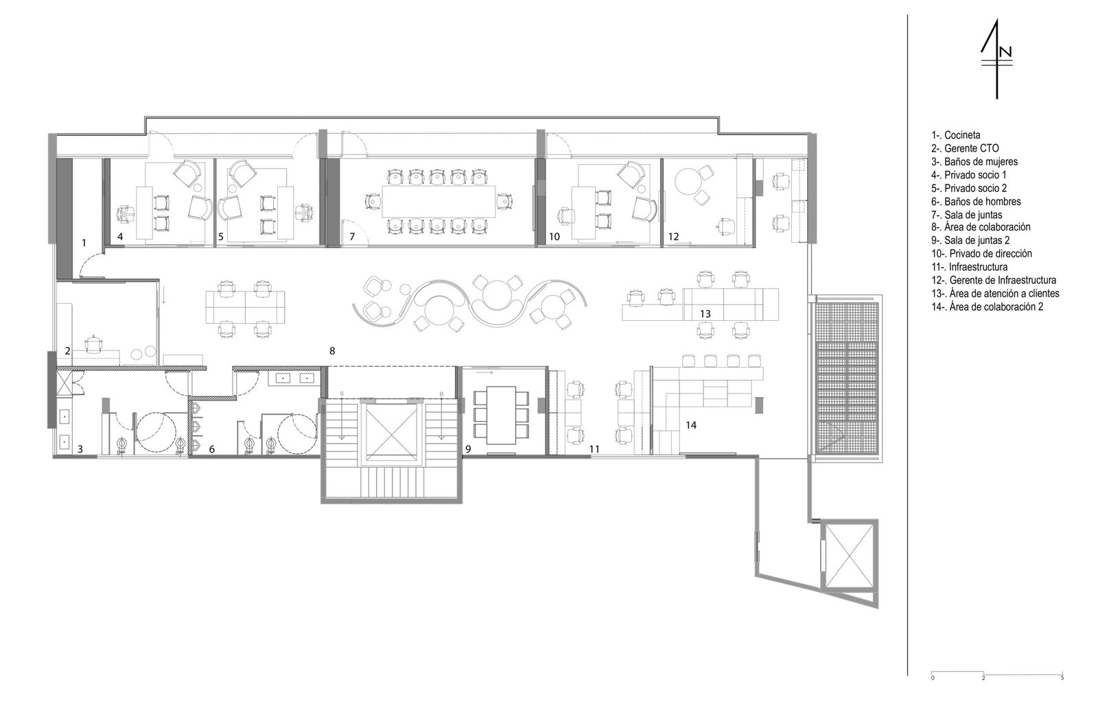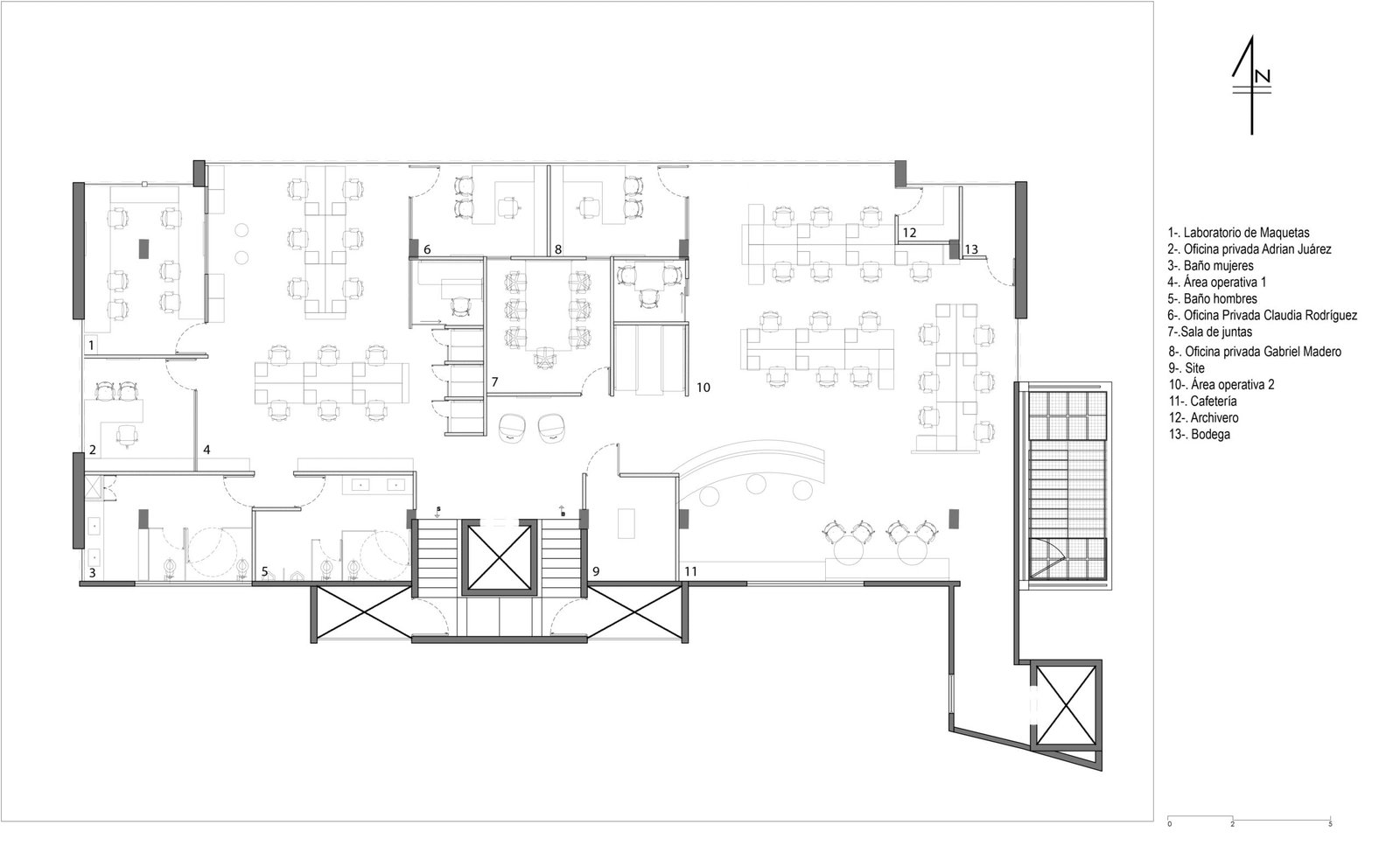 La distribución de las plantas está diseñada con el concepto Open Space, en donde las oficinas cerradas, asignadas a los directores de la empresa, se ubican al centro de la planta, mientras que todo el espacio de trabajo colaborativo se ubica alrededor de esta oficina, pegándose hacia las fachadas del edificio y obteniendo la mayor cantidad de luz natural.