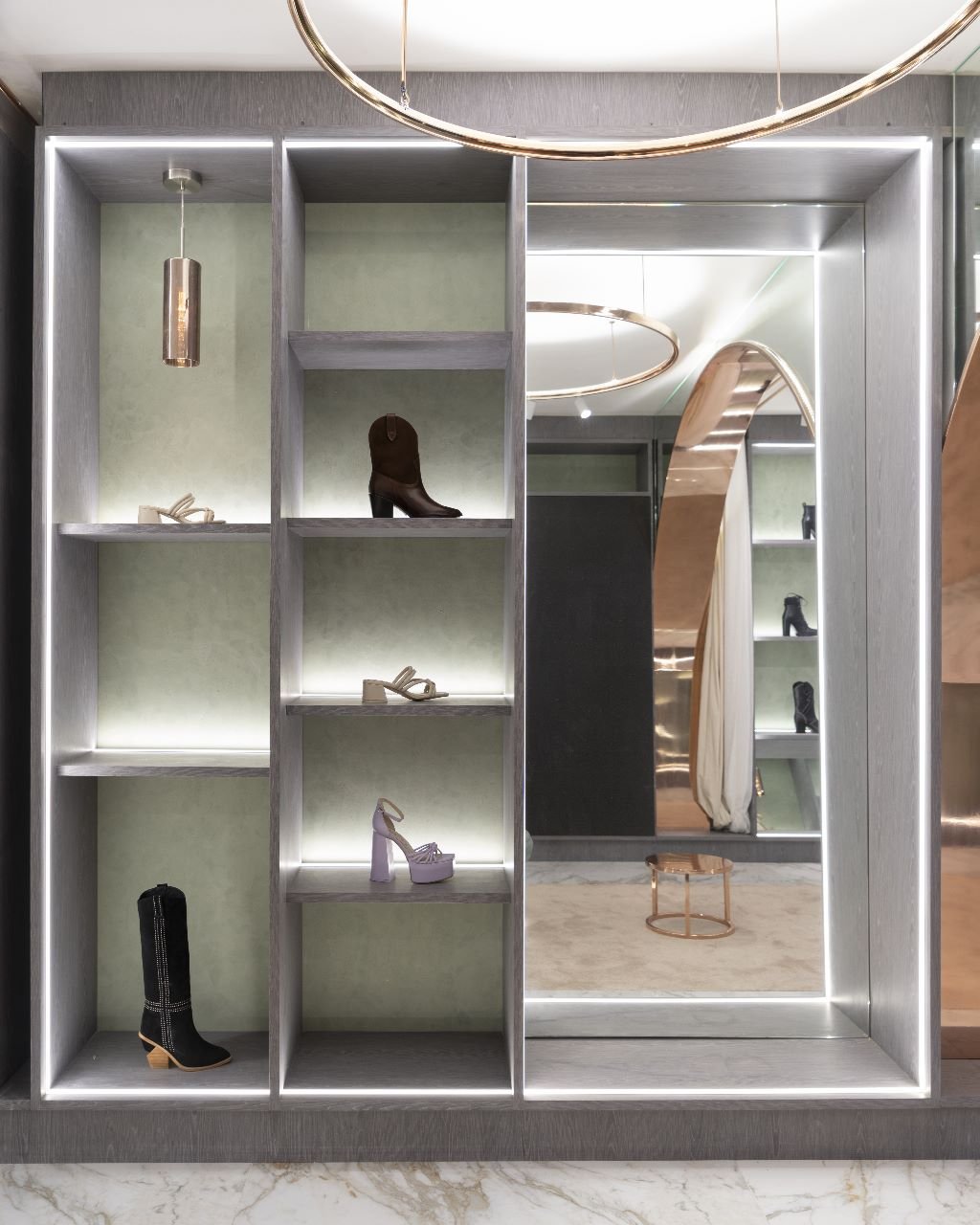 Se buscó que la presencia de lo artesanal acompañe durante todo el recorrido al comprador, ya que es una cualidad que comparte con la manufactura del calzado, es por ello que la composición de todos los elementos resalta la mano de obra mexicana y a su vez, rematan en un muro de hoja de oro (haciendo un claro homenaje a Mathias Goeritz).
