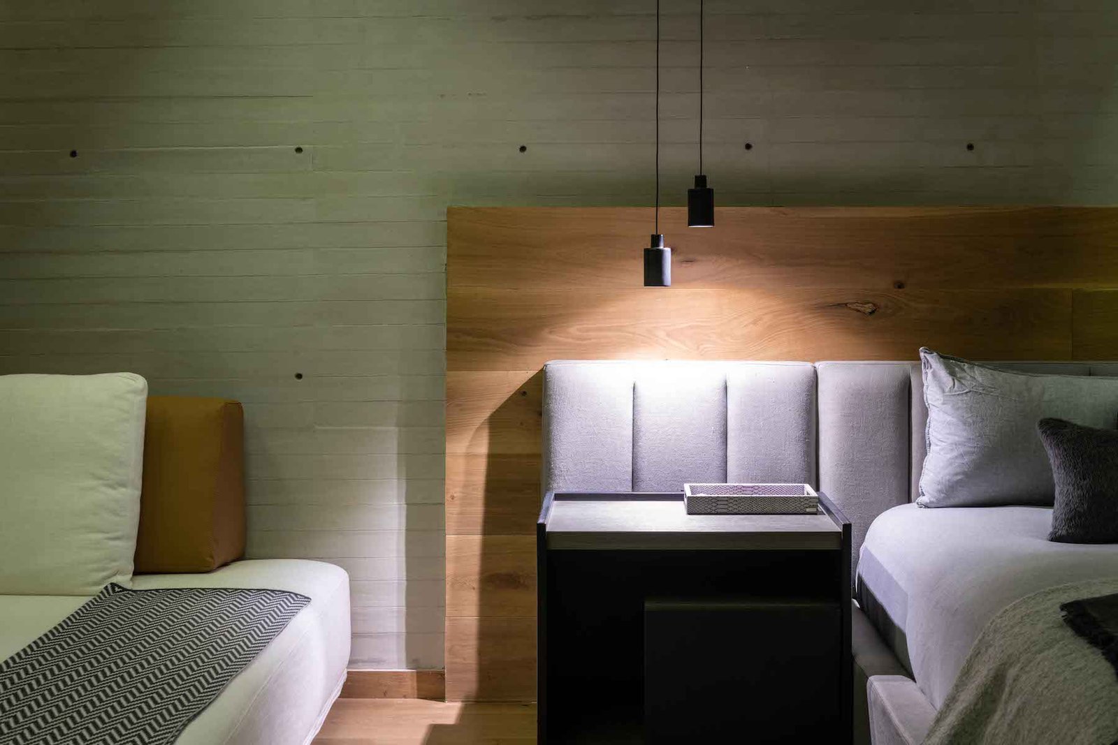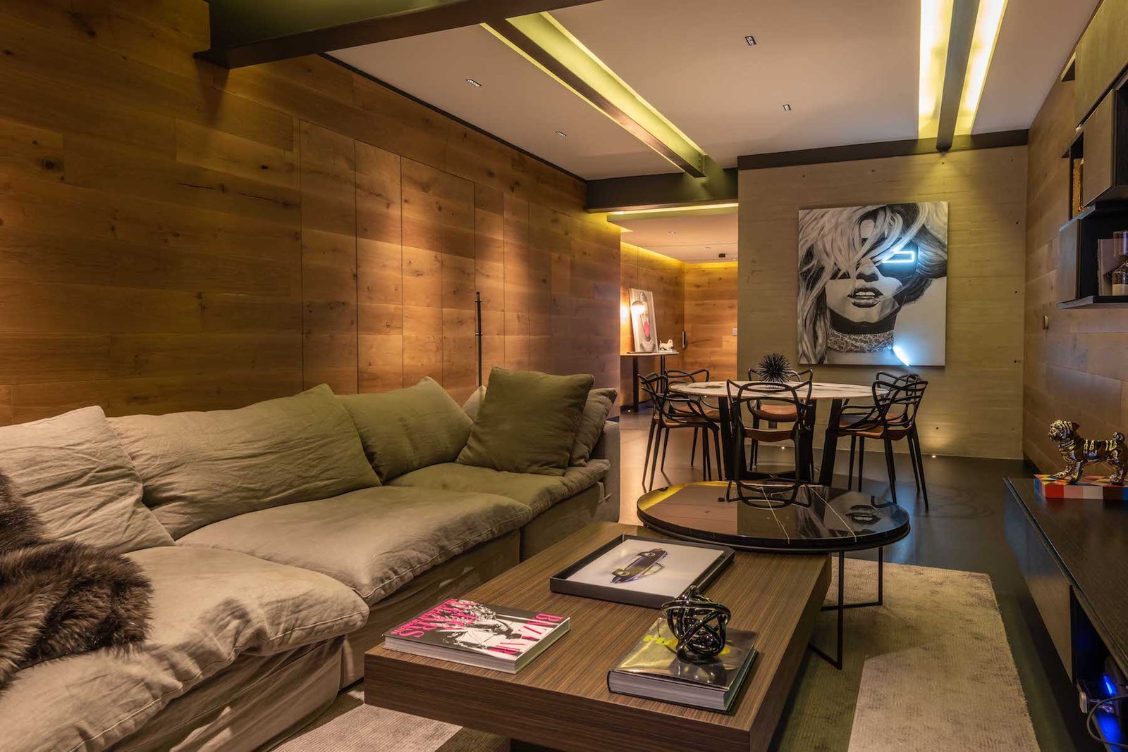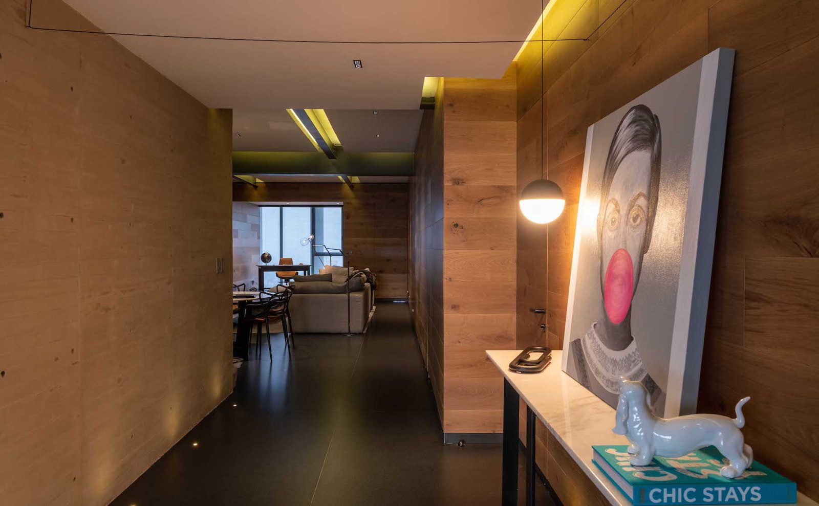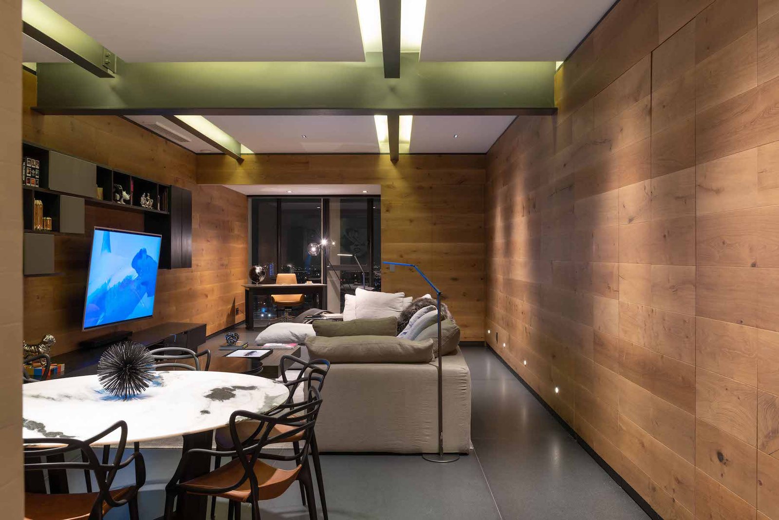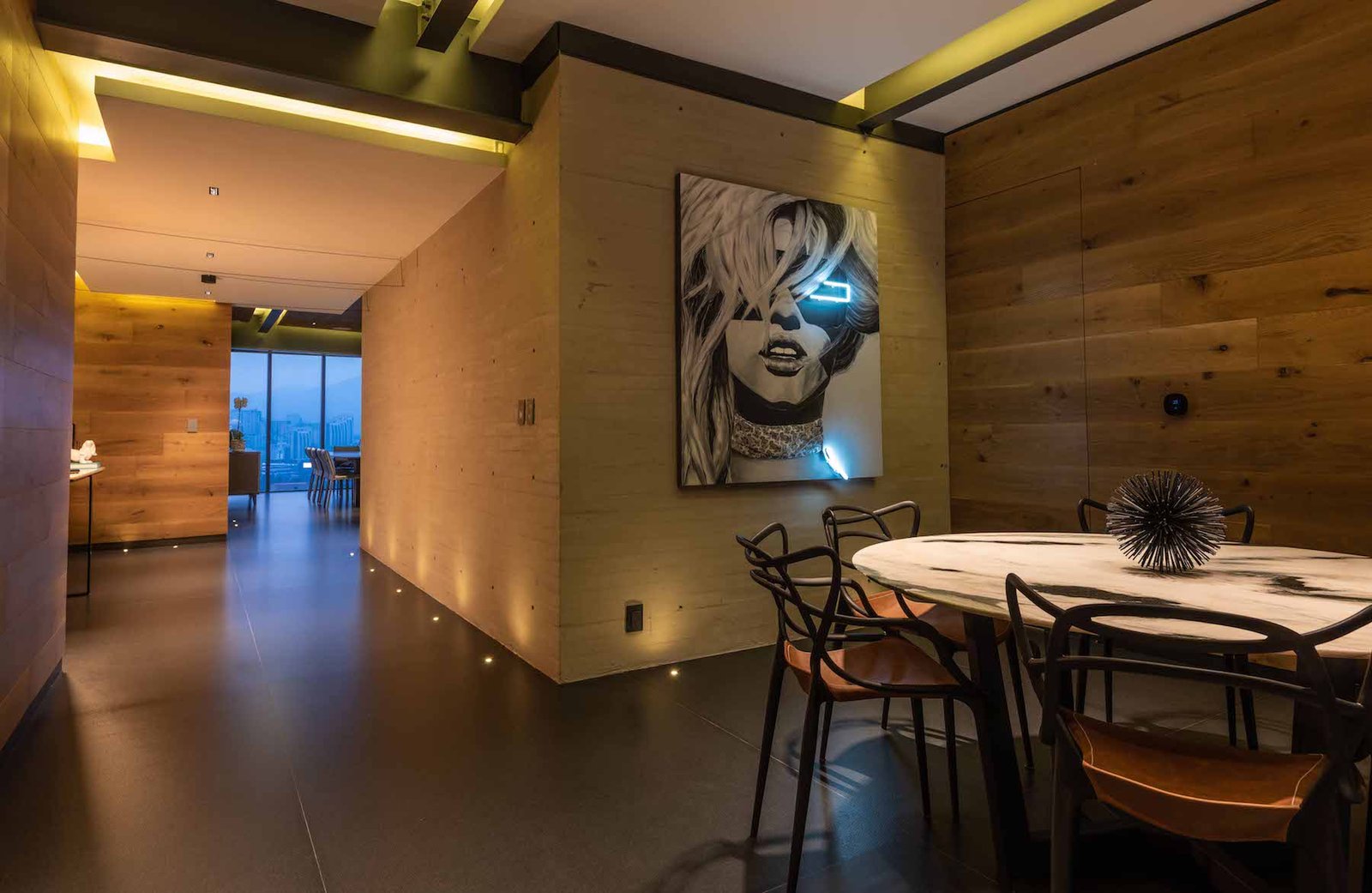 La propuesta del departamento es abierta en el área común, pero delimitada por cajillos de luz y mobiliario ligero, que permite la conexión visual dentro de todos los espacios, donde destaca un muro de concreto aparente que va desde la sala hasta la recamara y que contrasta con un lambrin de madera que envuelve todo el departamento.