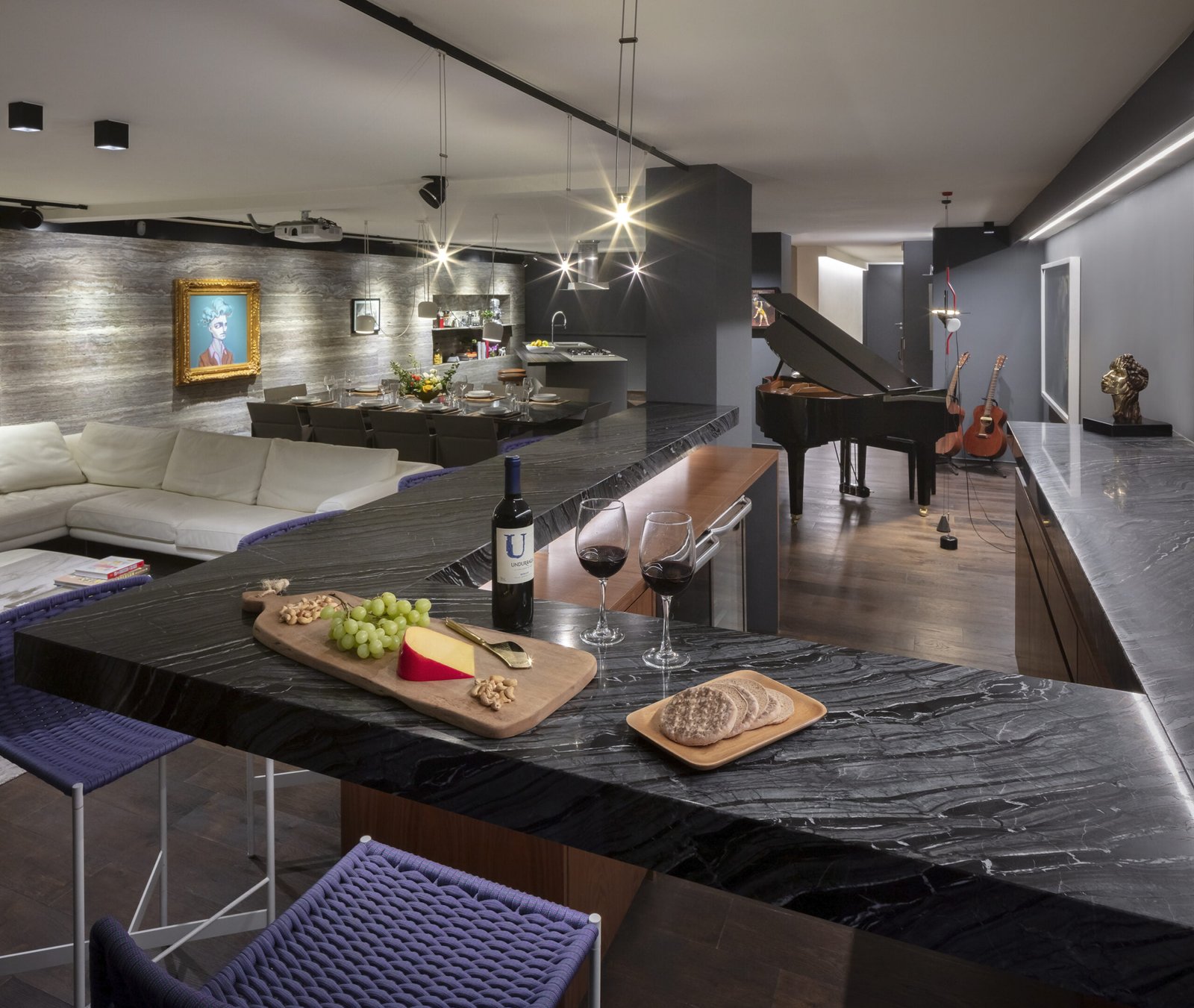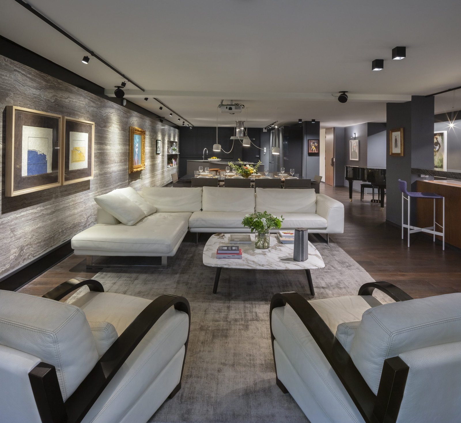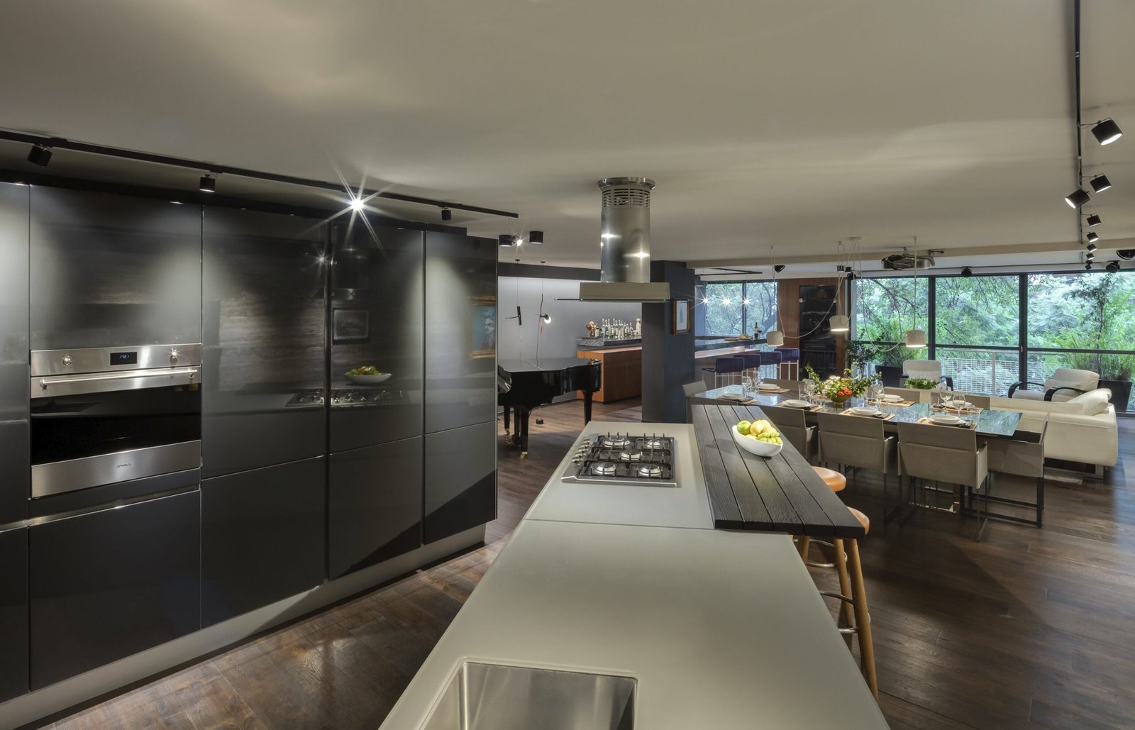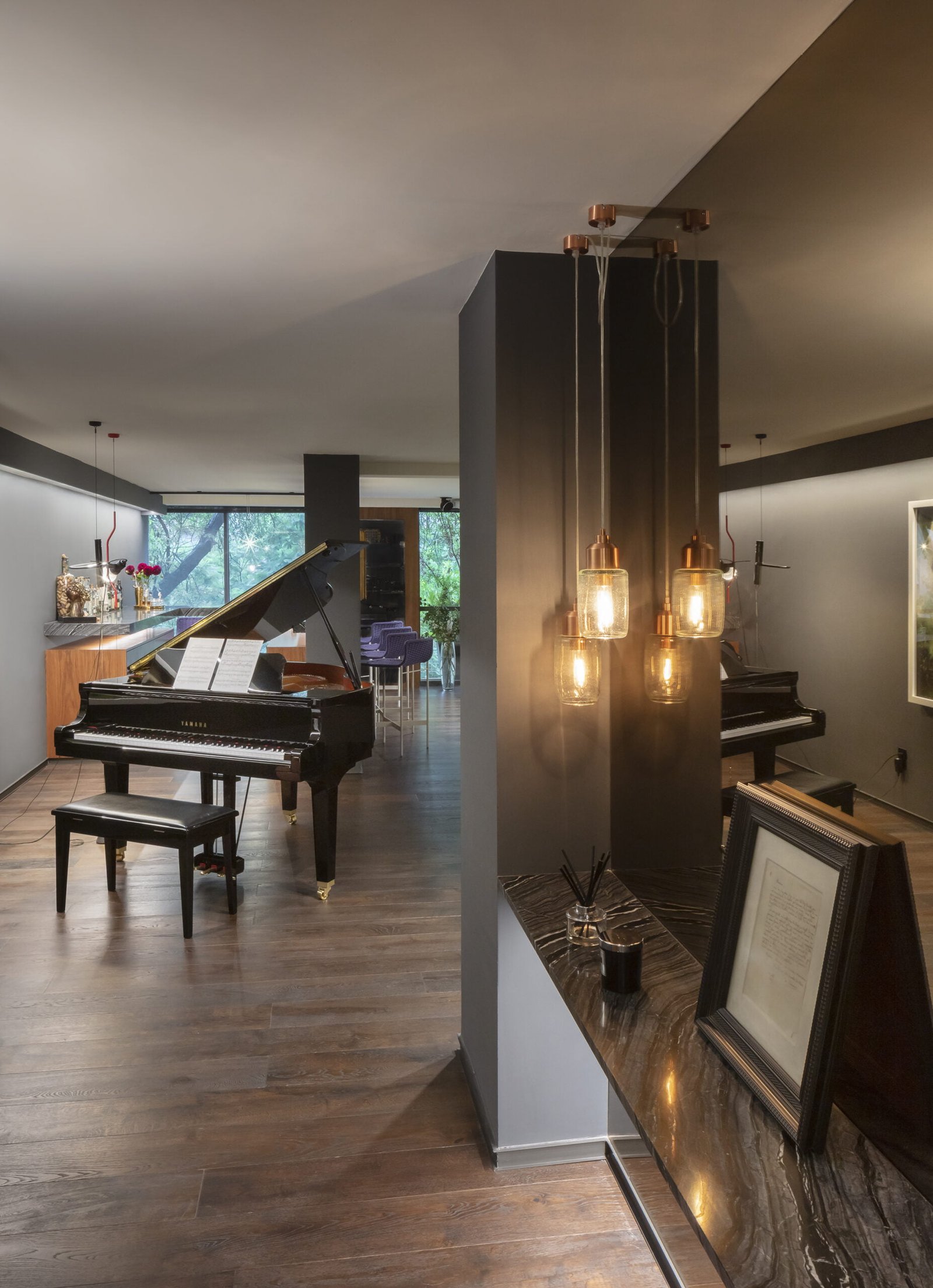 El departamento es un espacio muy alargado que claramente divide la zona social de las habitaciones por un patio al centro. El espacio frontal hacia la calle, es como un gran loft totalmente abierto, la cocina Italiana Modulnova de cristal es un gran mueble que se colocó girado para dar movimiento al espacio y salir un poco de la rigidez. La estancia se convierte en un cine con una gran pantalla y sonido envolvente, el bar tiene una barra larga abierta a la sala y el espacio para el Piano como gran protagonista del lugar.