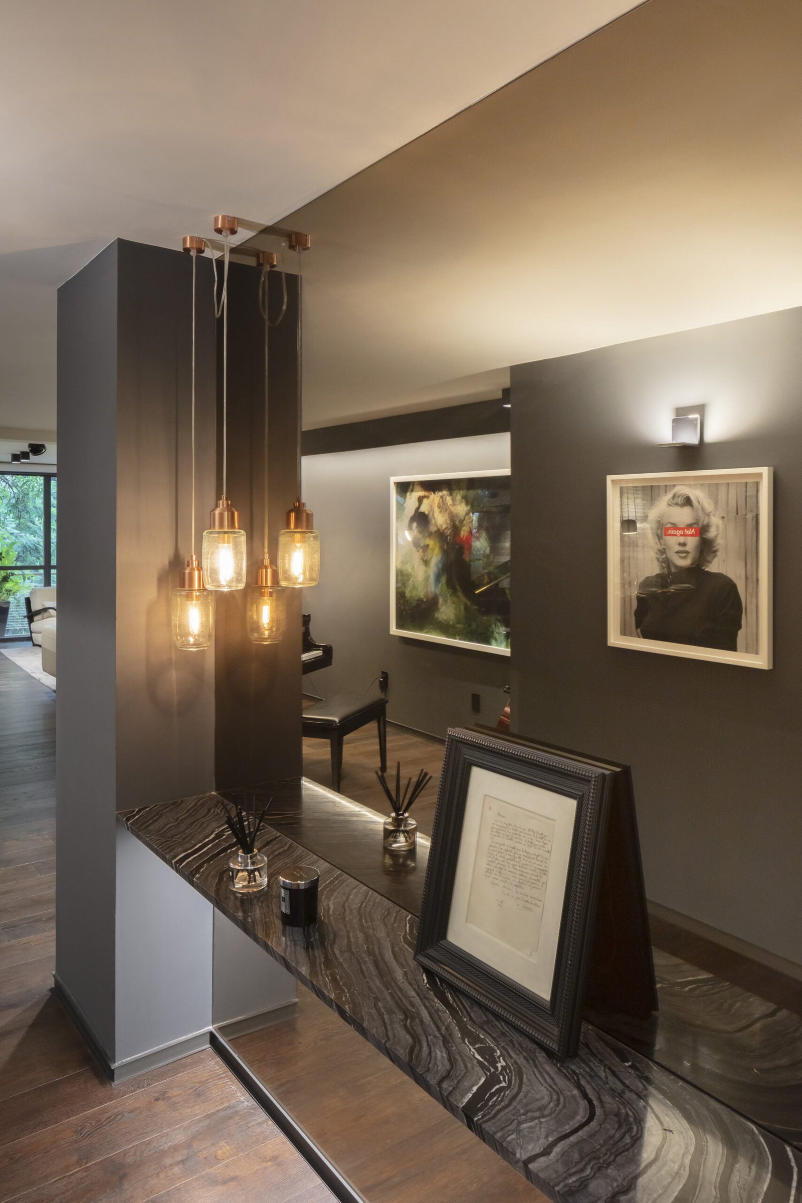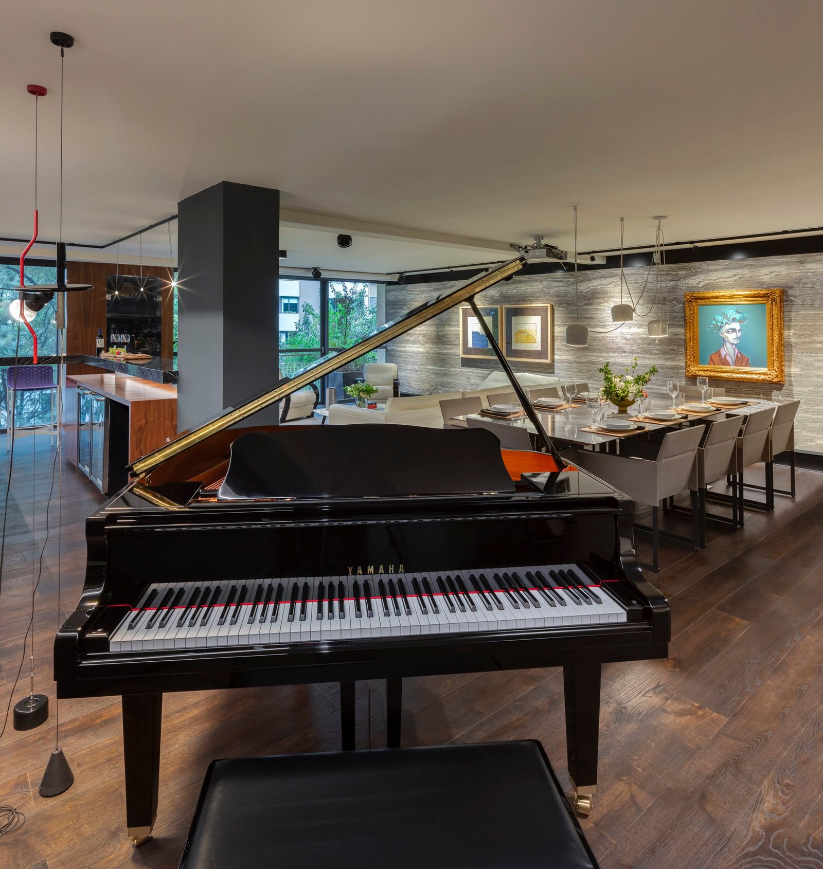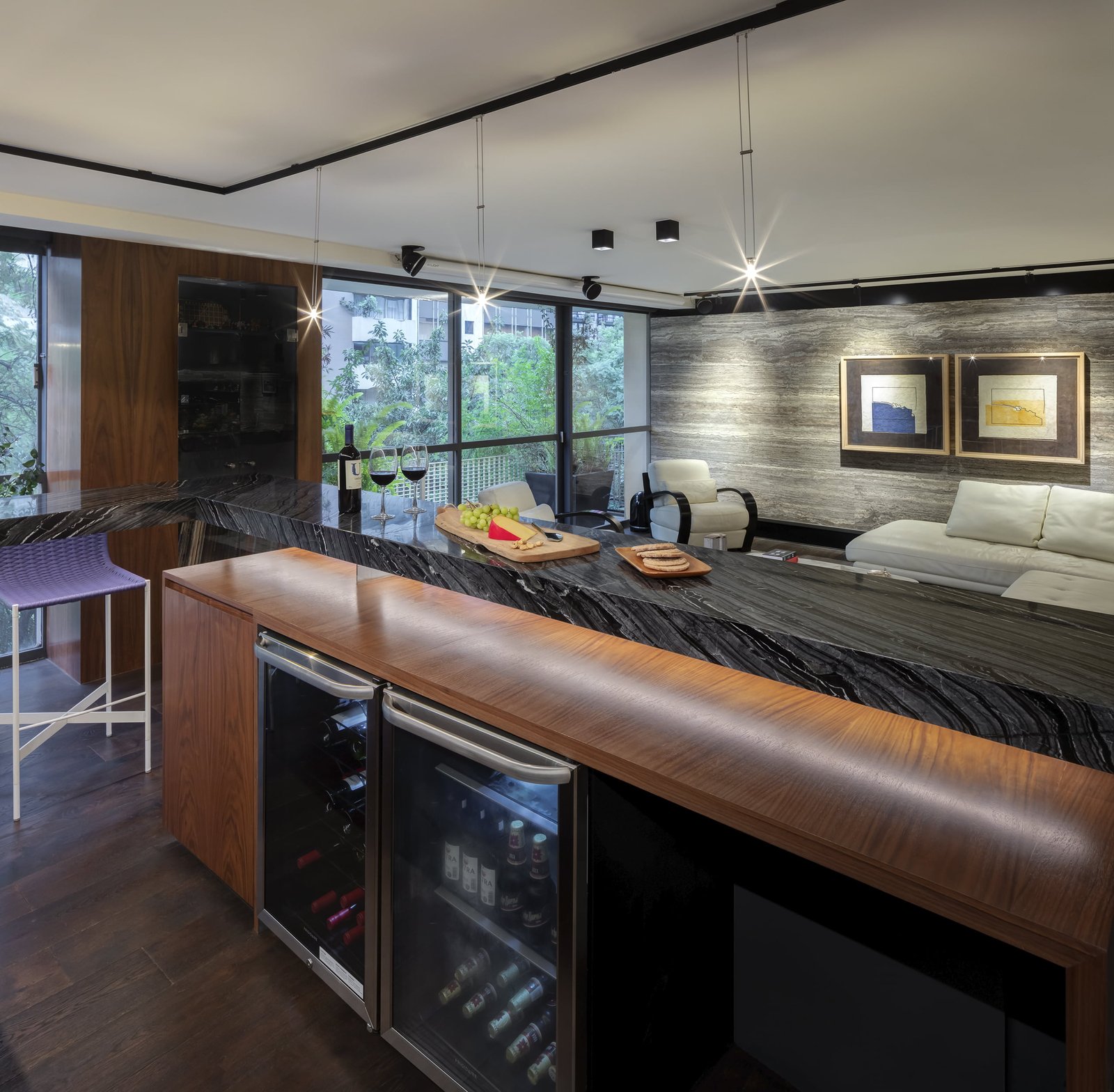 El departamento es un espacio muy alargado que claramente divide la zona social de las habitaciones por un patio al centro. El espacio frontal hacia la calle, es como un gran loft totalmente abierto, la cocina Italiana Modulnova de cristal es un gran mueble que se colocó girado para dar movimiento al espacio y salir un poco de la rigidez. La estancia se convierte en un cine con una gran pantalla y sonido envolvente, el bar tiene una barra larga abierta a la sala y el espacio para el Piano como gran protagonista del lugar.