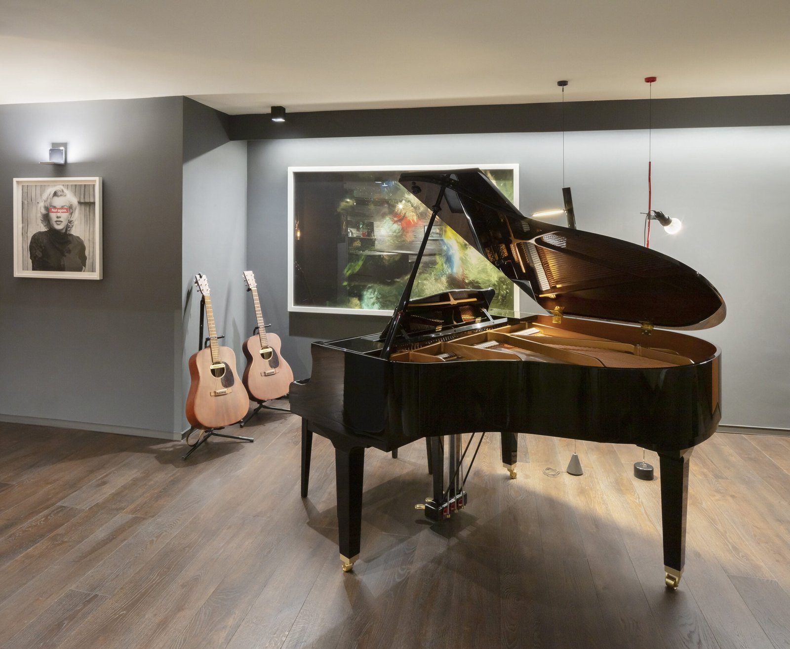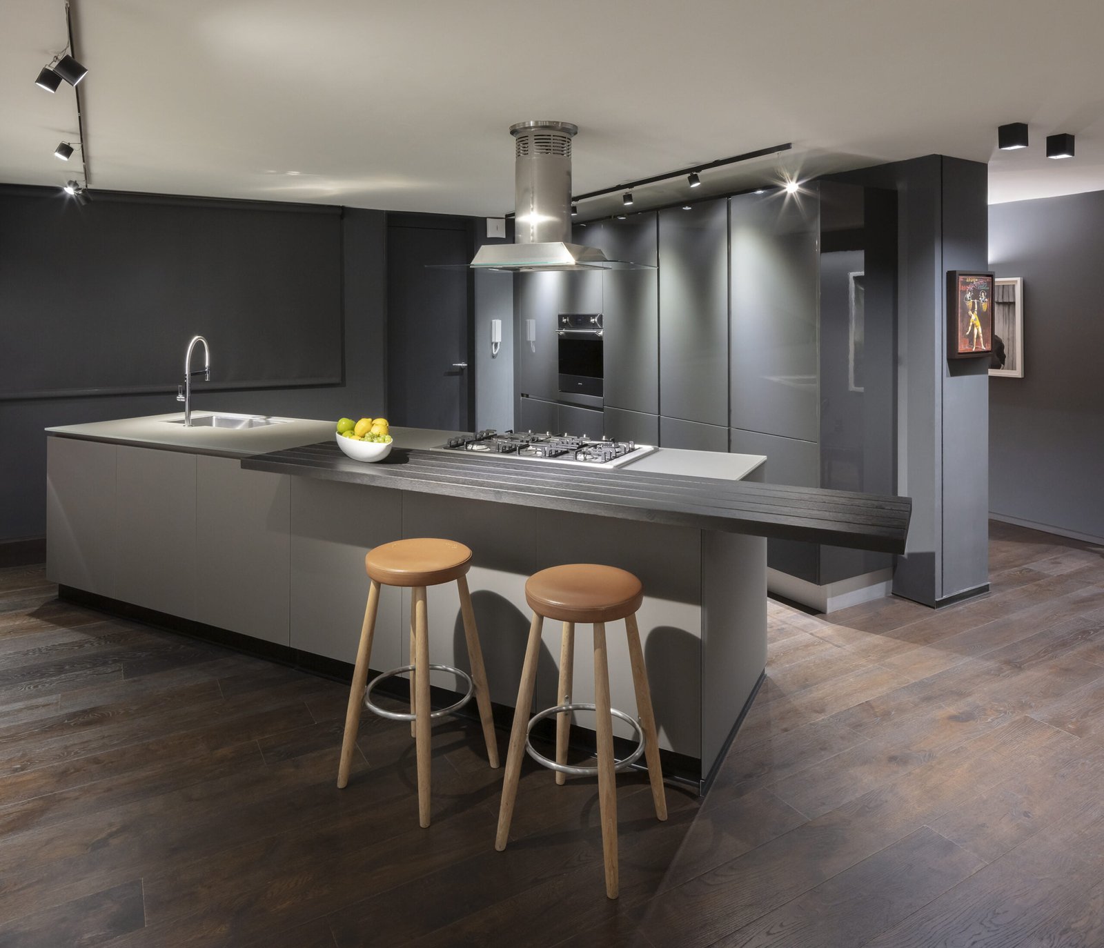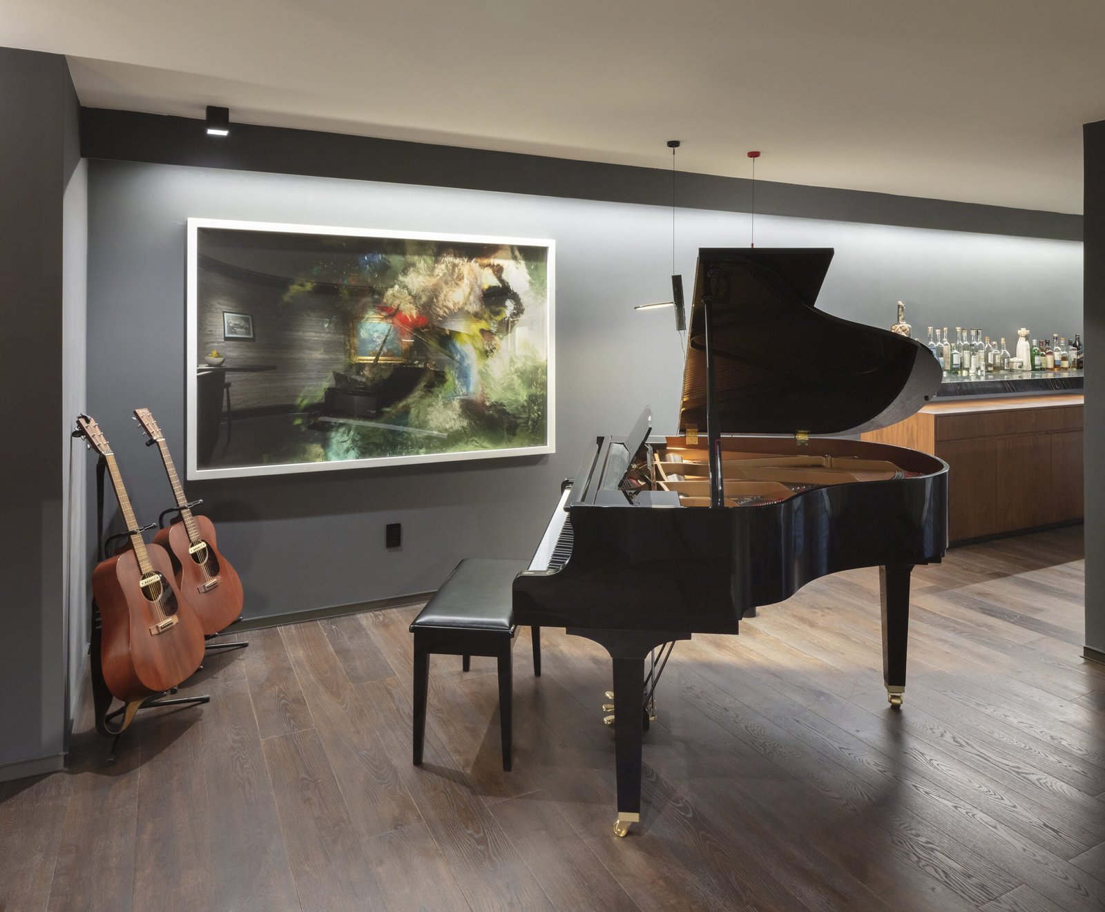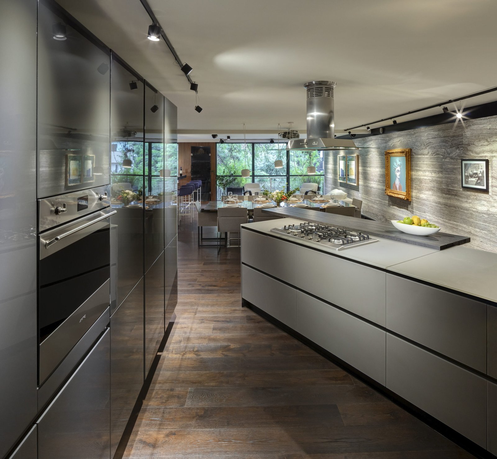 El departamento es un espacio muy alargado que claramente divide la zona social de las habitaciones por un patio al centro. El espacio frontal hacia la calle, es como un gran loft totalmente abierto, la cocina Italiana Modulnova de cristal es un gran mueble que se colocó girado para dar movimiento al espacio y salir un poco de la rigidez. La estancia se convierte en un cine con una gran pantalla y sonido envolvente, el bar tiene una barra larga abierta a la sala y el espacio para el Piano como gran protagonista del lugar.