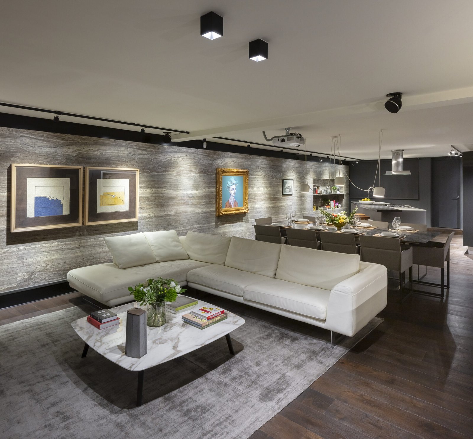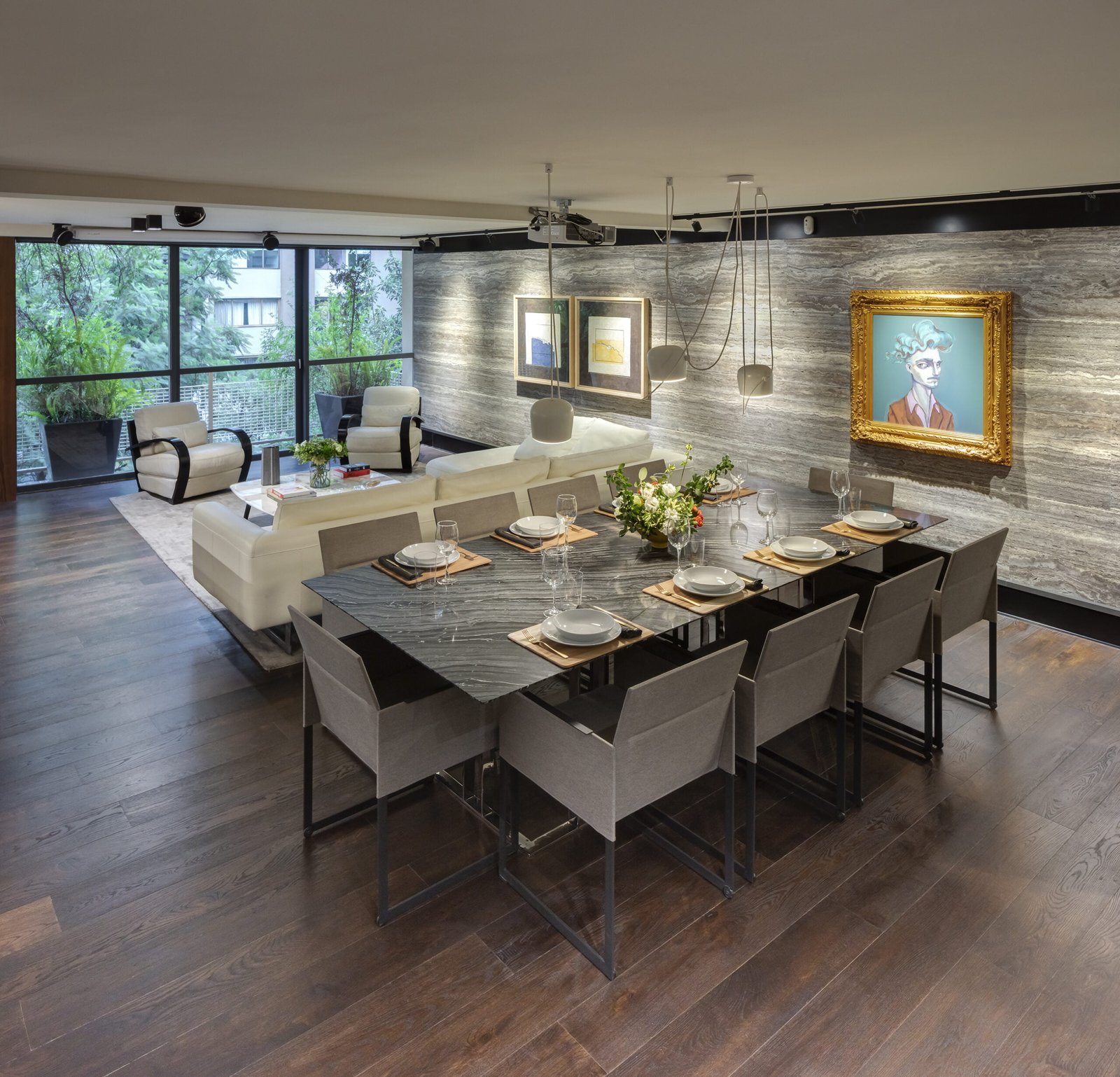 El mobiliario es de Minotti, Roche Bobois, Paola Lenti, Manutti y Poltrona Frau. La iluminación es de FLOS y el sistema de automatización es lutron. La cocina es de Modulnova.