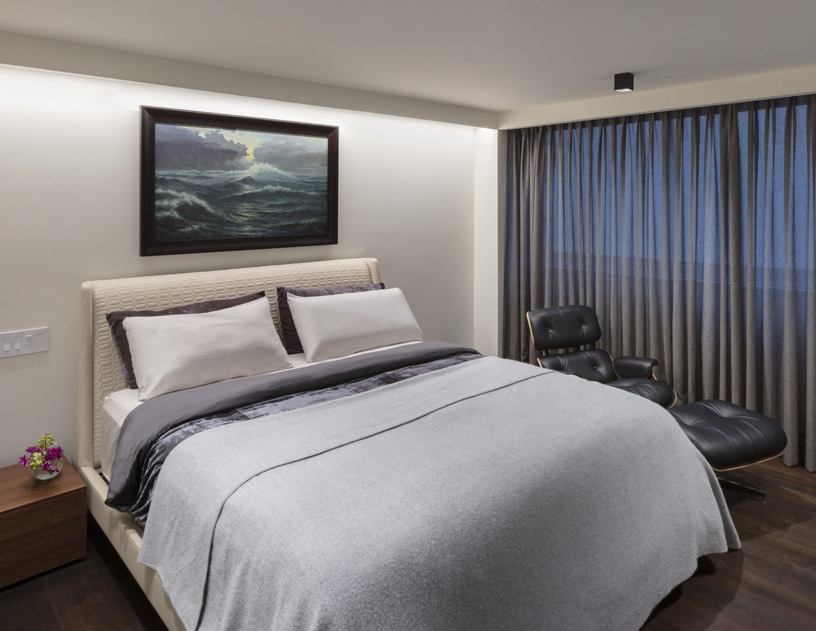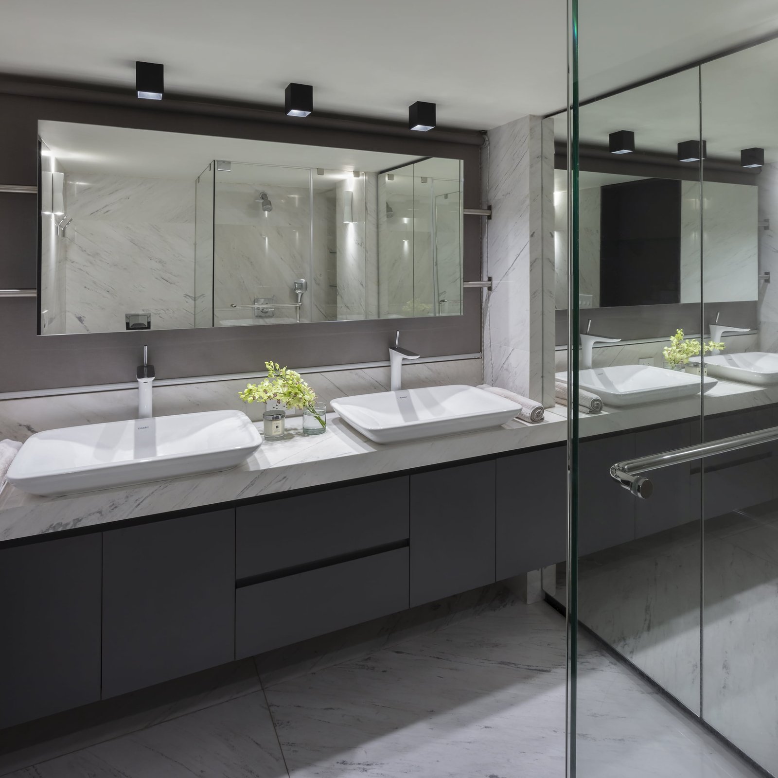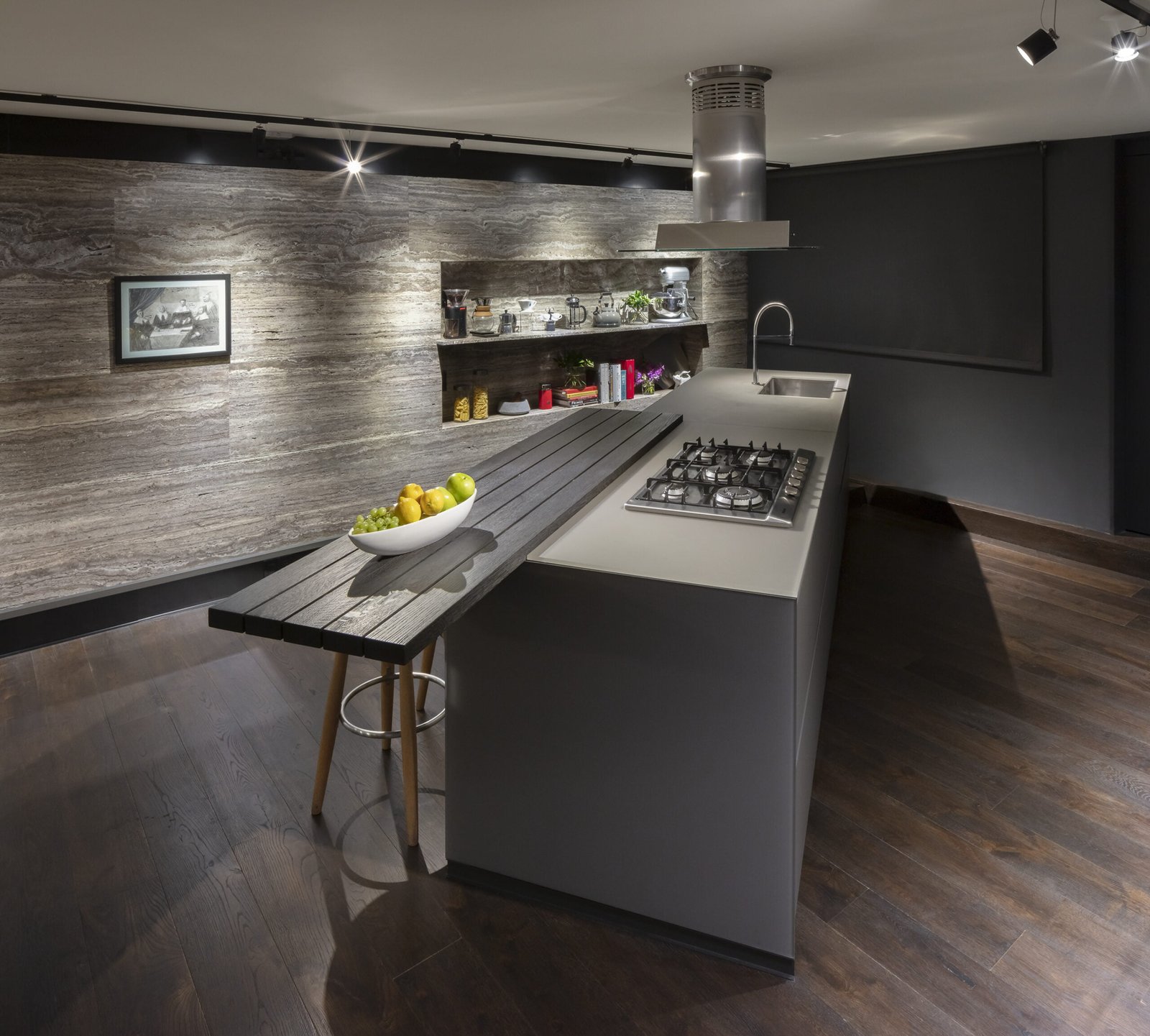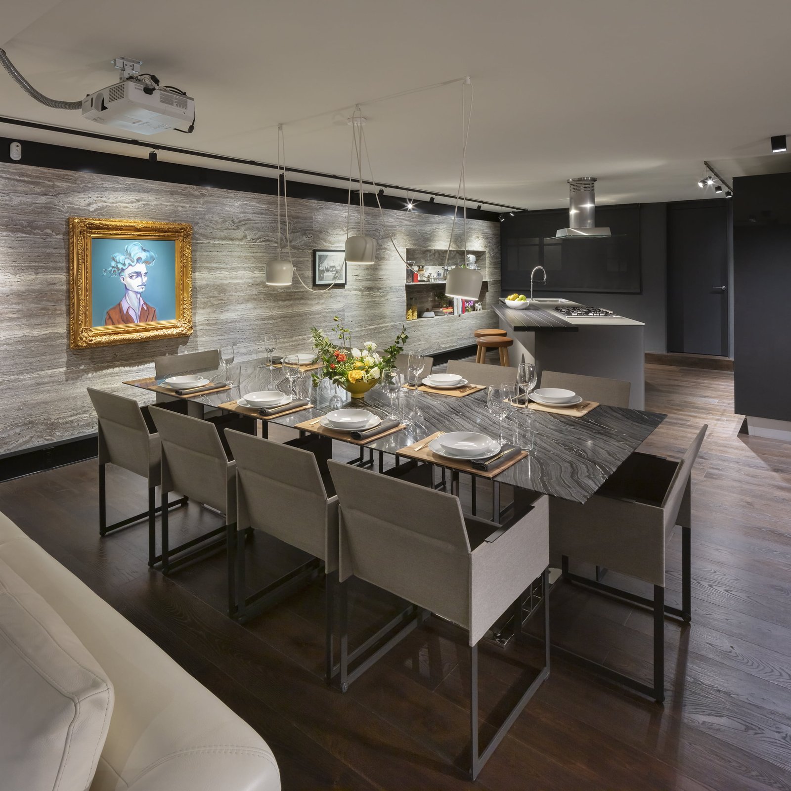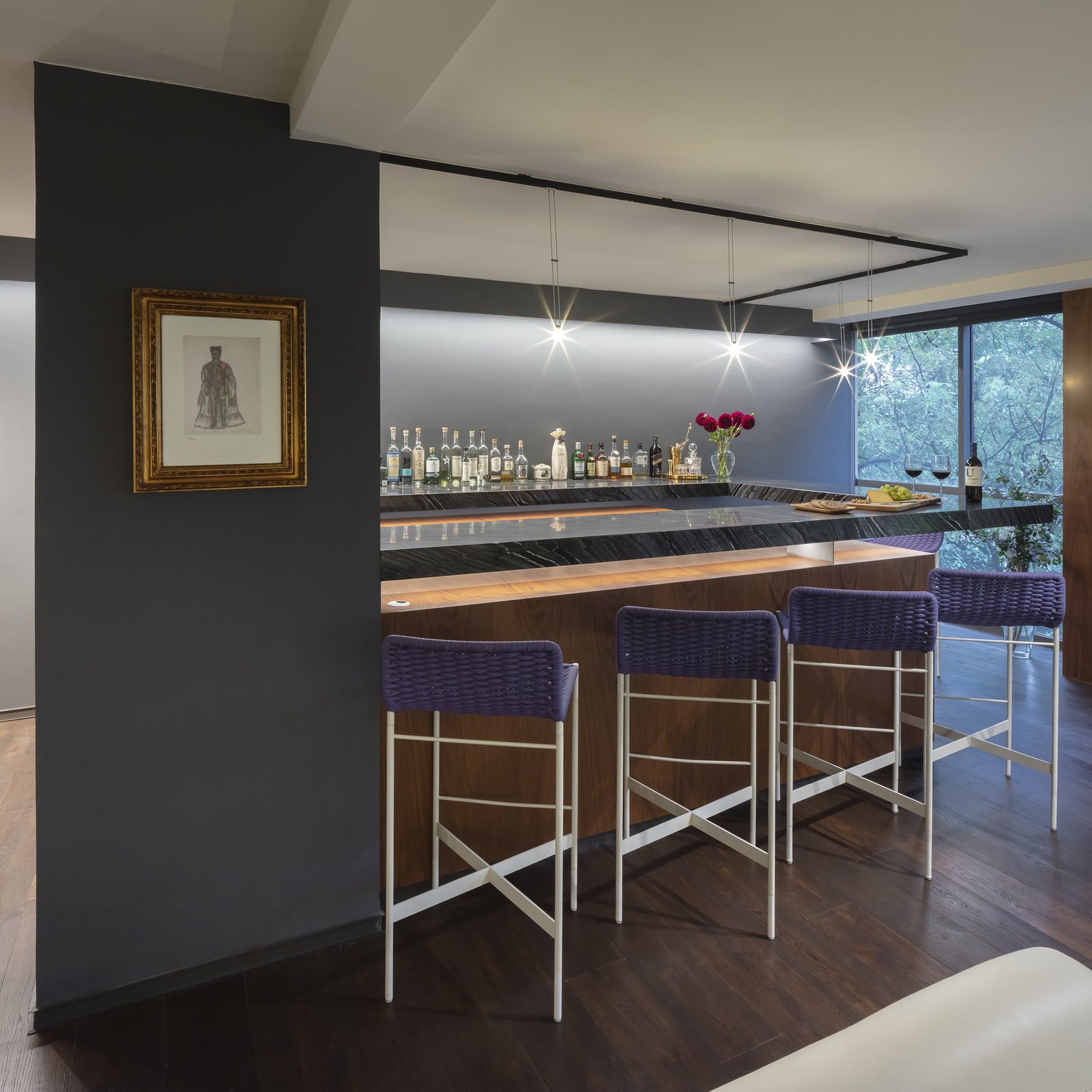 Todos los pisos del departamento son de madera de Roble obscuro y dentro del espacio Principal contrastando con la madera de Roble, un muro corre a lo largo de todo el espacio forrado de Travertino Silver Iraní.  Para los baños utilizamos un mármol blanco de origen Griego. La mesa y toda la barra del bar son de un granito que se conoce como Wooden Black.