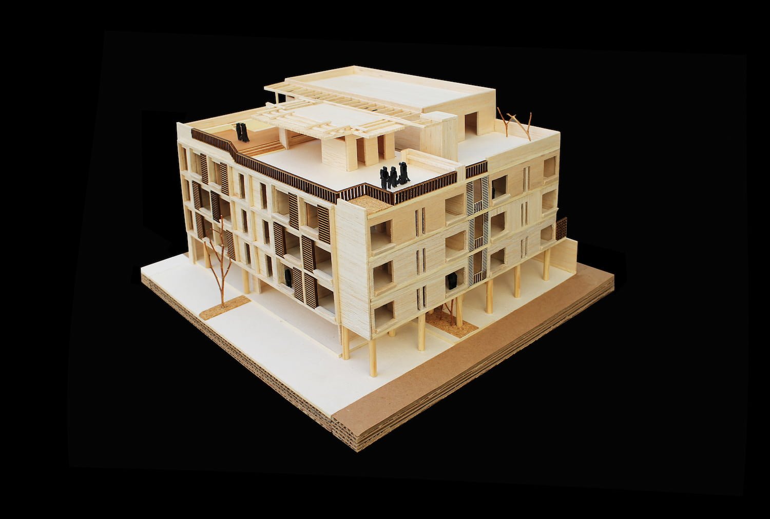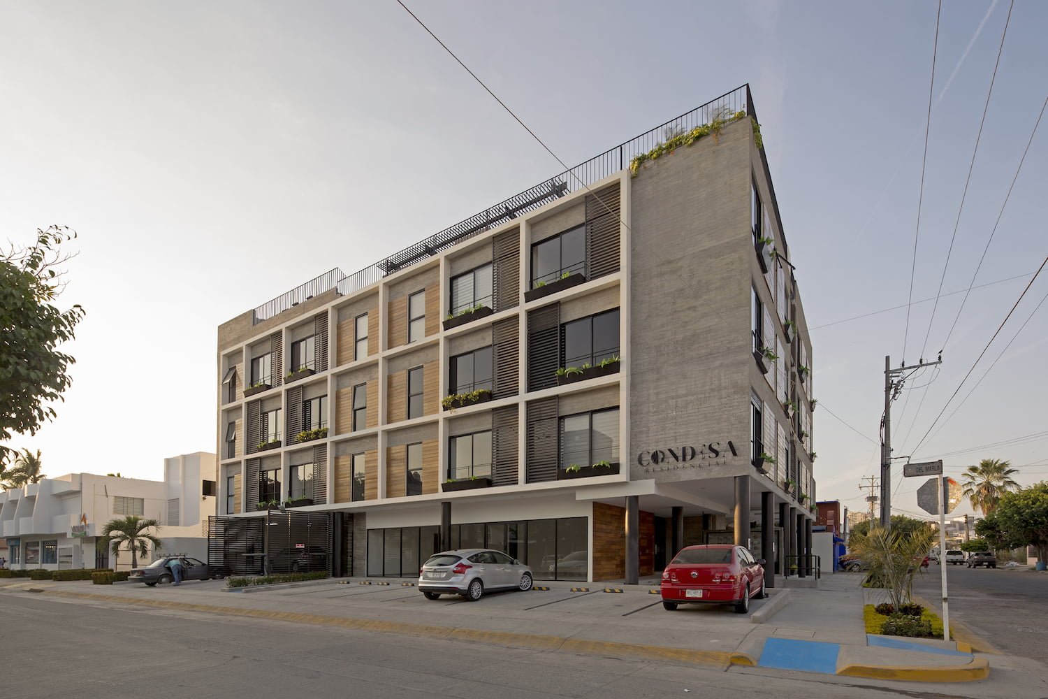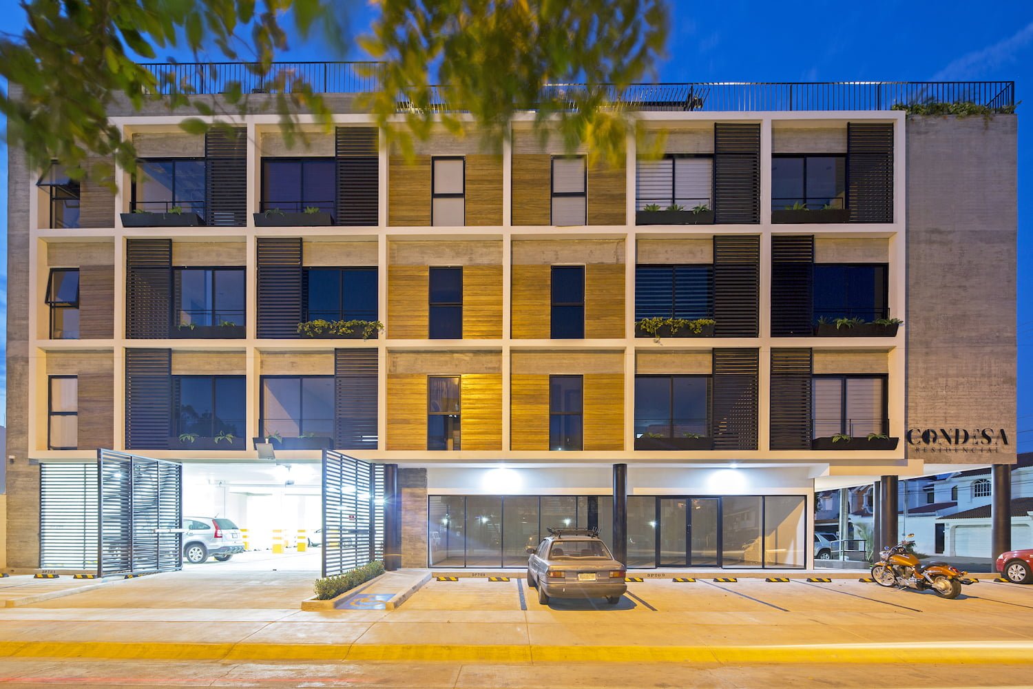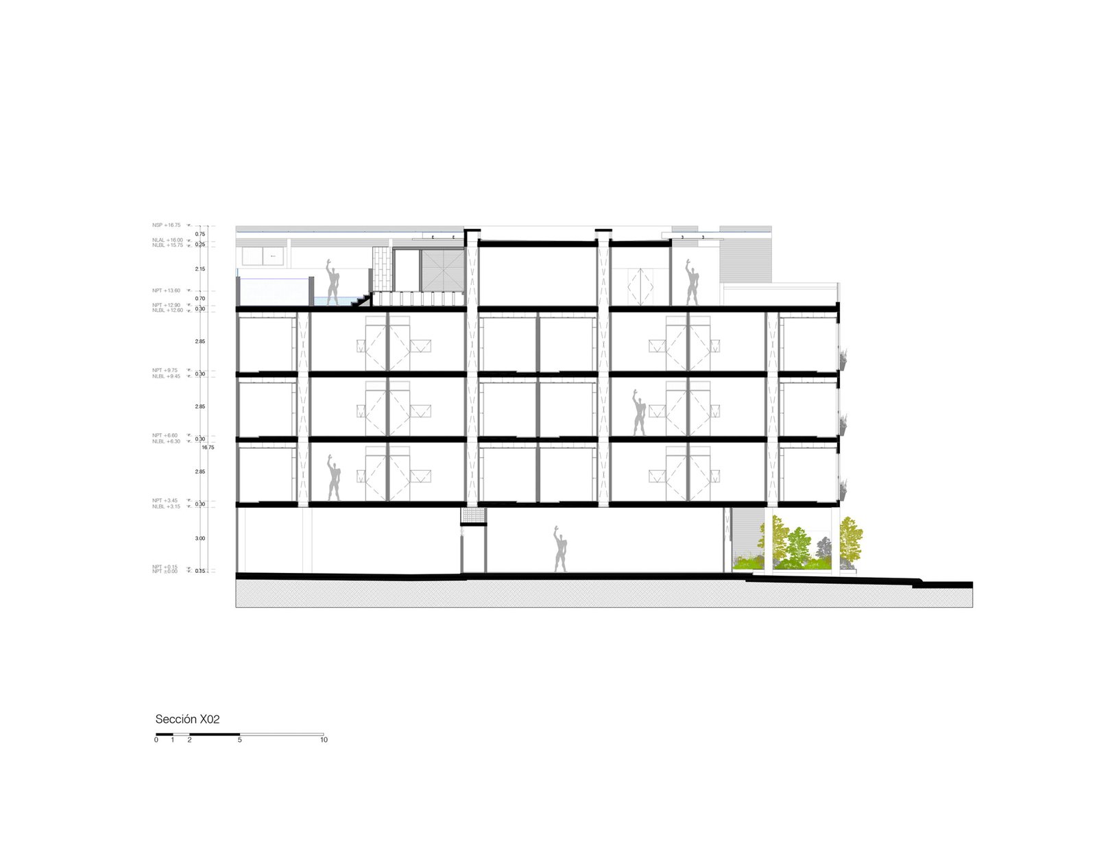 Los 24 departamentos de los niveles tipo son de aprox. 80m² con dos habitaciones mientras que los 2 penthouses son de 3 habitaciones con un área aproximada de 120m². Las amenidades quedan remetidas y contenidas hacia las circulaciones enmarcando el cuerpo de los 3 niveles en fachada y generando que se liberen las vistas perimetrales, además de ser elevadas poco menos del medio nivel permitiendo que la alberca no obstruya la vista desde cualquier área exterior.