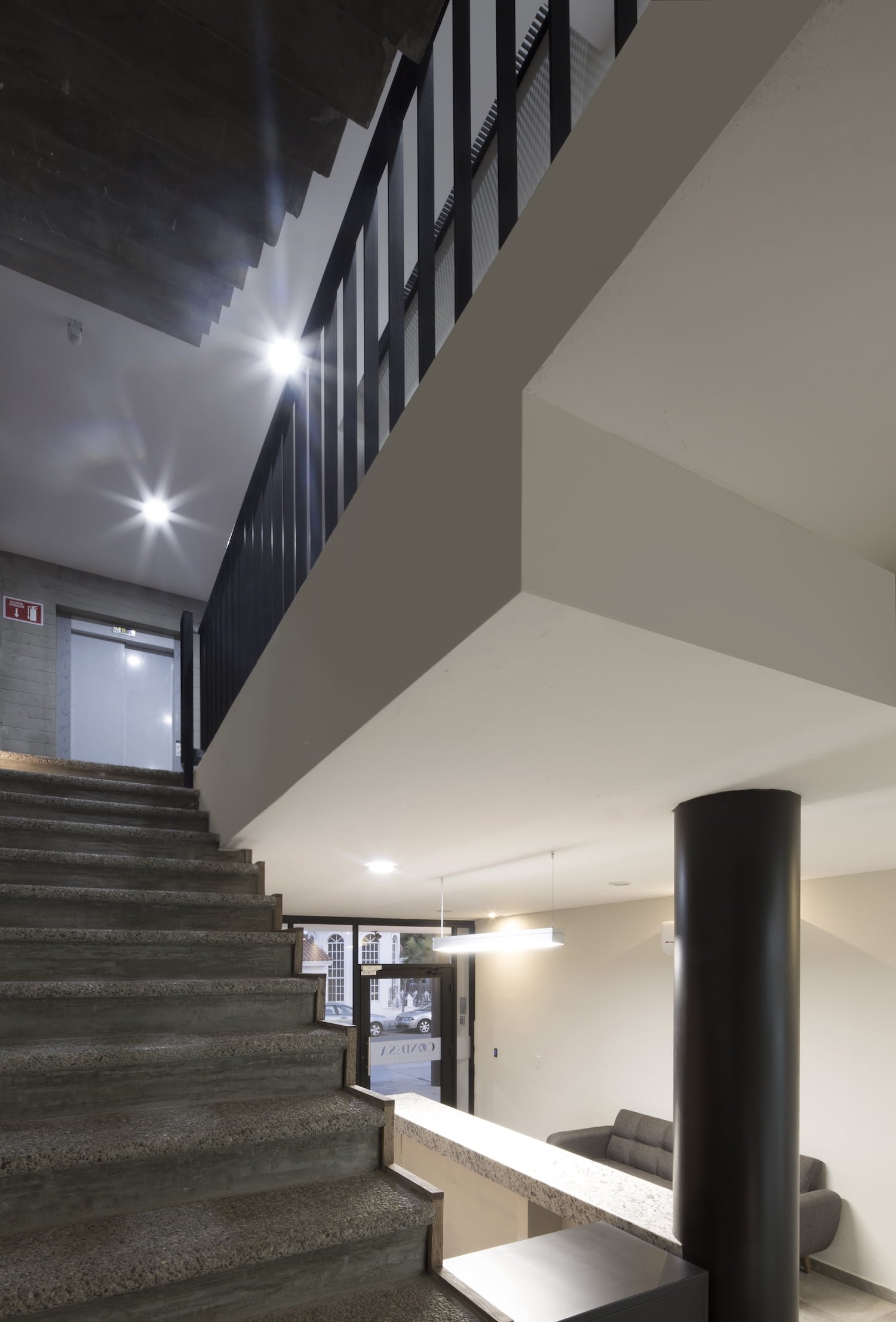 La geometría del proyecto, se genera a partir de elevar y seccionar un prisma cuadrangular para insertar el núcleo de circulaciones verticales y horizontales, dando como resultado dos bloques rectangulares de iguales proporciones. La separación de ambos bloques permite liberar más fachada con vista hacia el exterior y permite jerarquizar la esquina elevándola del suelo.