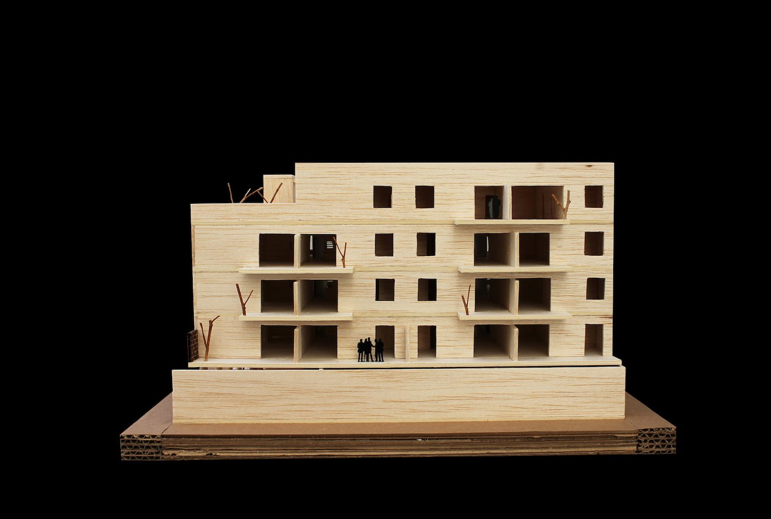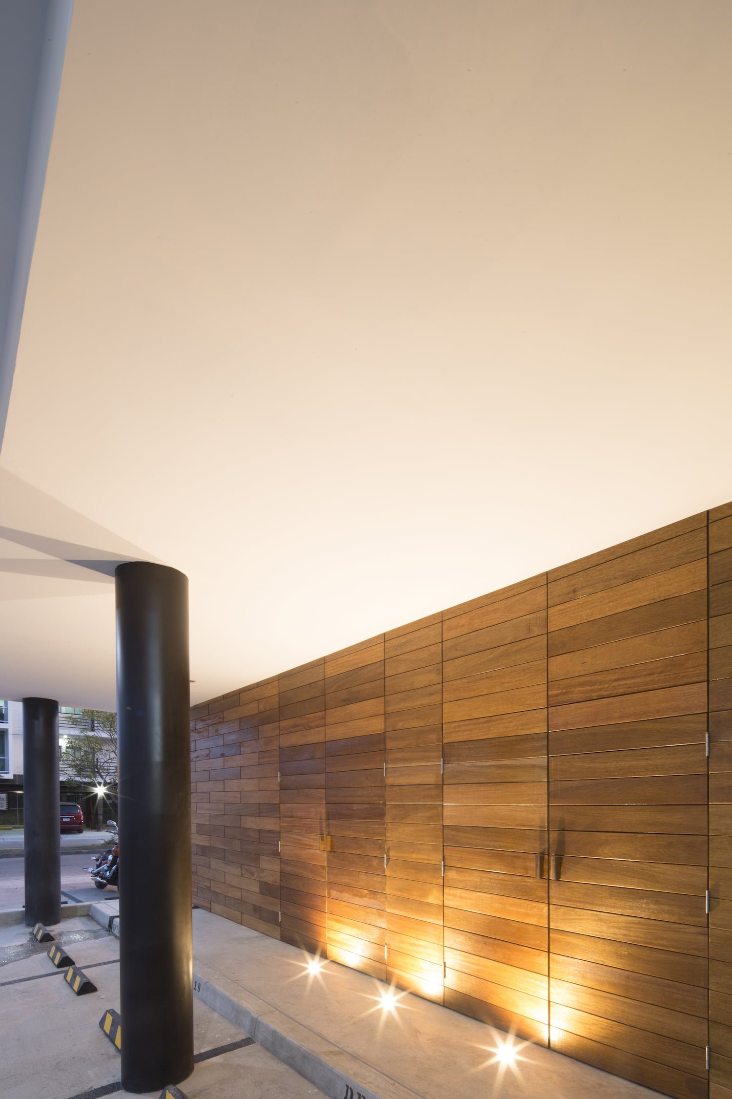 Las fachadas transmiten y son el reflejo del uso de cada módulo del departamento, permitiendo por completo la vista en el espacio público y haciendo más íntimo el espacio privado, en el bloque sur (hacia el eje verde) las salas cuentan con jardineras y celosías de acero que protege el sol mientras que las habitaciones se recubren de madera al exterior y una ventana vertical para iluminación y ventilación natural.