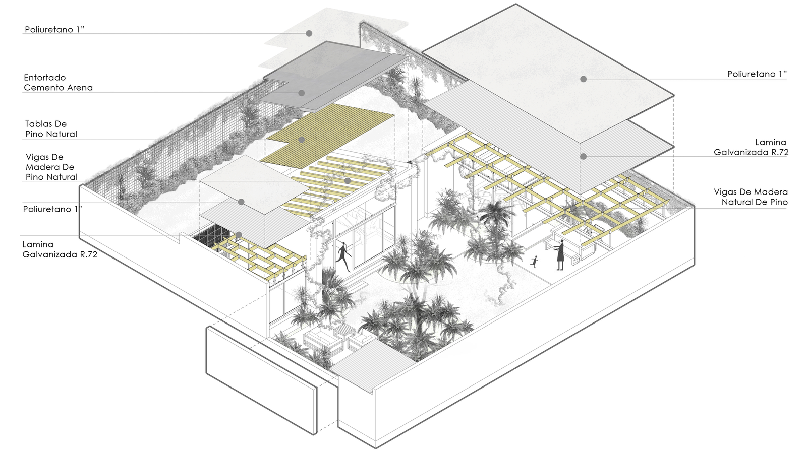 Este proyecto incorpora prácticas sostenibles como la reutilización de aguas grises de la cocina, lavabos y regaderas para el riego de jardines, mientras que la orientación y el diseño permiten aprovechar al máximo la iluminación natural durante el día, eliminando la necesidad de luminarias encendidas. La combinación de cubiertas de madera y sistemas constructivos eficientes mantiene un clima interior agradable, reduciendo la dependencia del aire acondicionado y optimizando su uso cuando es necesario. Pensada para vivirse al exterior, la casa privilegia la conexión con la naturaleza, transformando cada rincón en un espacio de contemplación y tranquilidad.