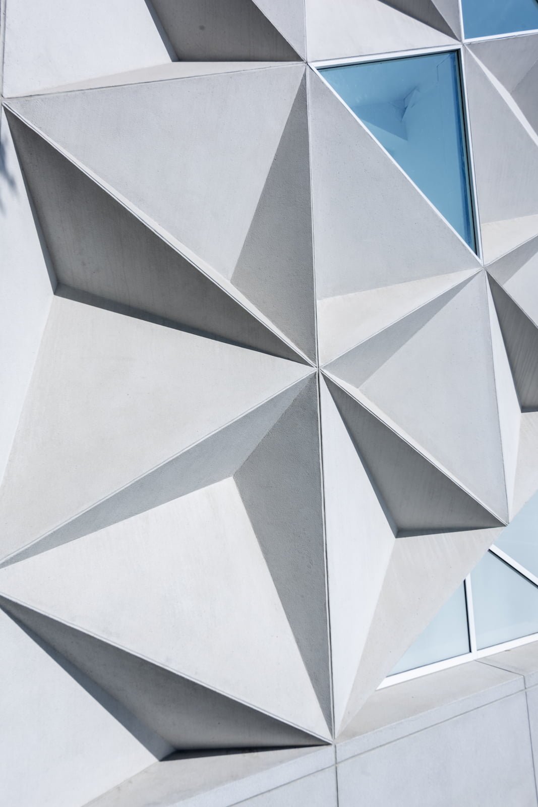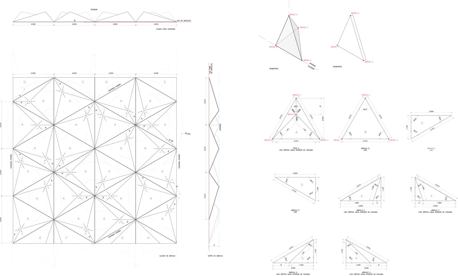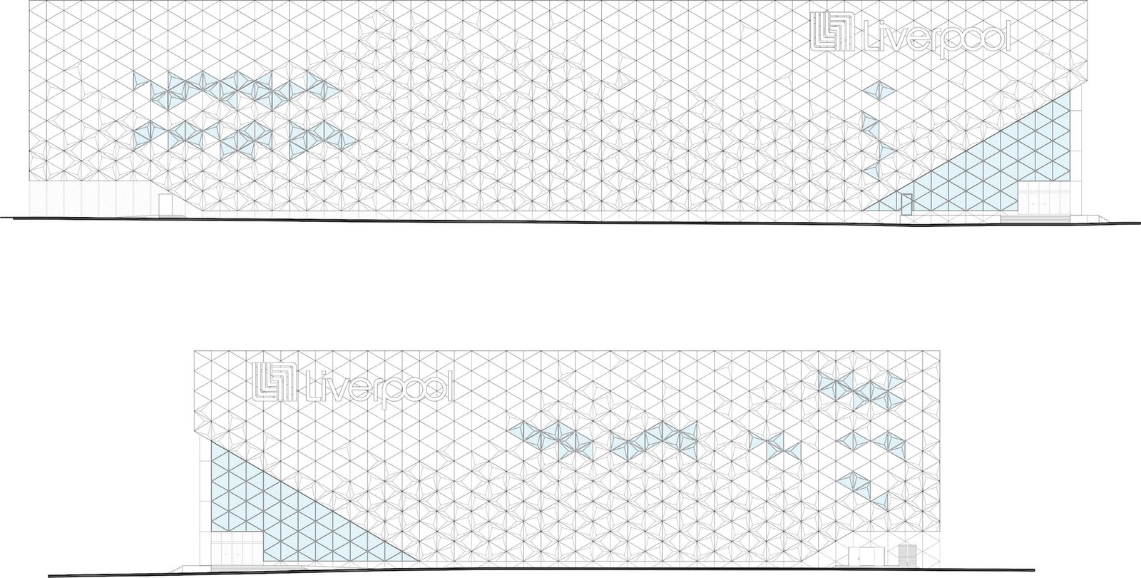 La intención de esta fachada, es que conforme pasa el día, las distintas iluminaciones solares generen juegos de sombras y reflejos. Por lo tanto, la fachada siempre se ve distinta, incluso de noche, gracias al diseño de iluminación. Es importante apuntar que la escala del proyecto fue determinante para la modulación, la composición responde al gran lienzo de la envolvente, sin perder de cuenta al usuario, es interesante observar en una vista abierta cómo la figura humana es abrazada por los juegos de líneas y sus propias sombras.