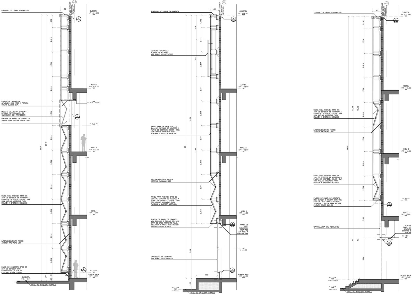 La construcción de fachada está realizada a base de prefabricados de concreto blanco sobre bastidores metálicos, el material permite que el mantenimiento mínimo y al ser una pieza diseñada permite el menor número de ajustes en la colocación.