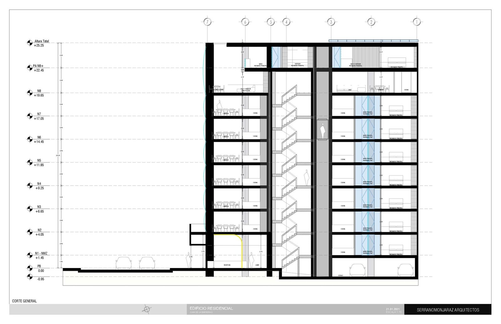 El proyecto consta de un lobby, estacionamiento, mezzaniene, 15 residencias en las cuales las plantas tipo pueden variar de una recamara con vestidor y 1.5 baños, otra opción con 2 recamaras y 1.5 baños y otra de 2 recamaras y 2 baños por departamento. Para que de esta forma el usuario pueda elegir el diseño que mejor se acople a sus necesidades. Y finalmente los PH de dos niveles.