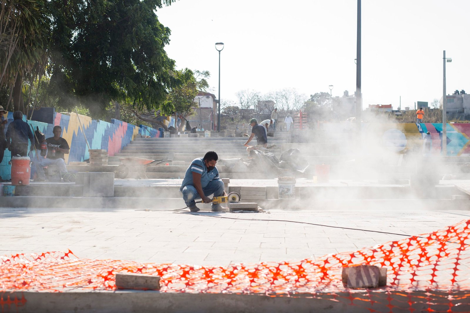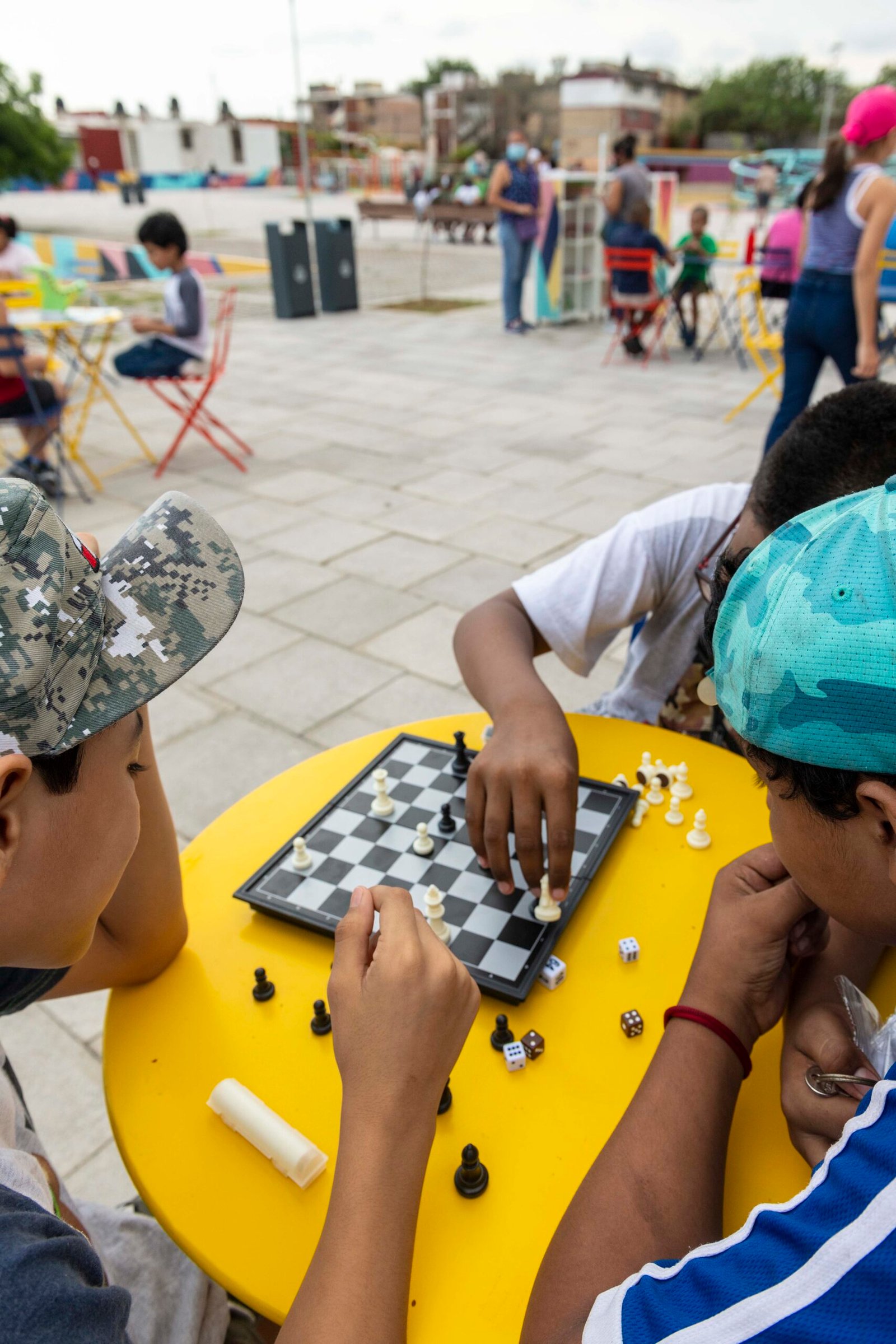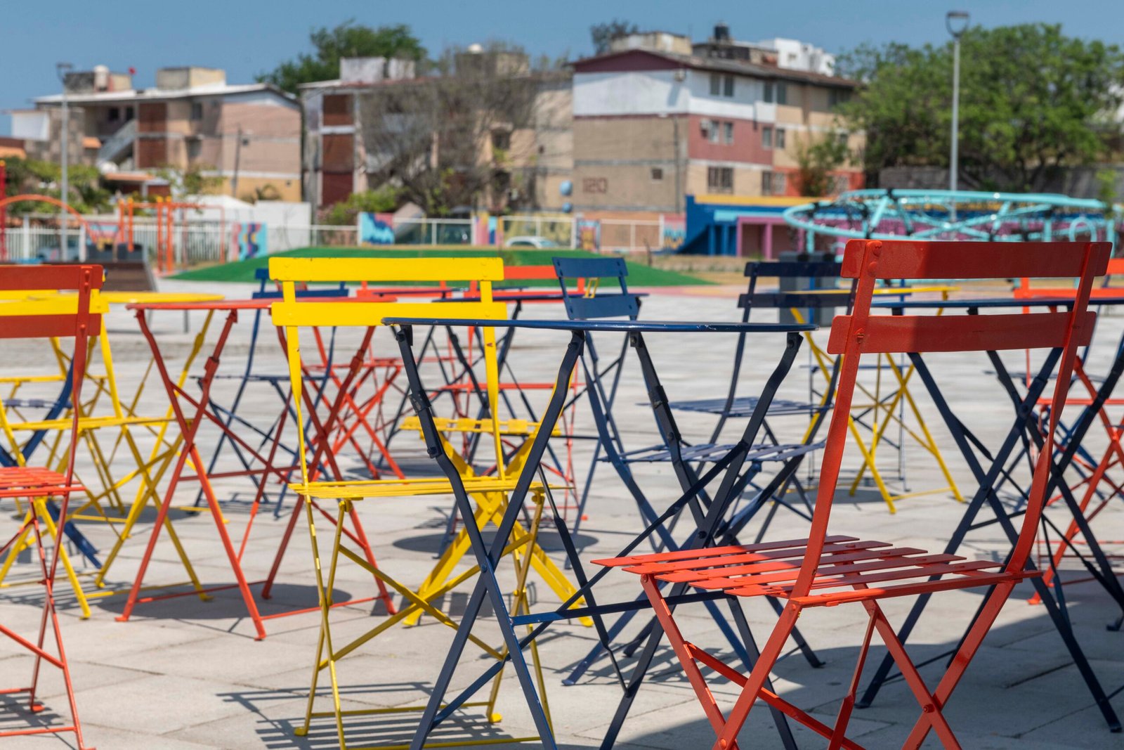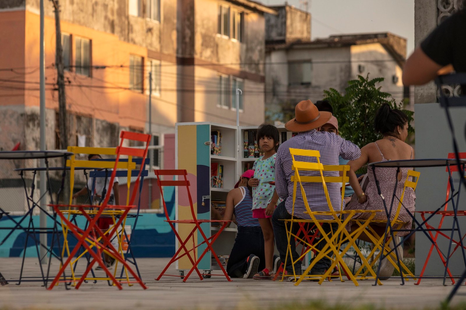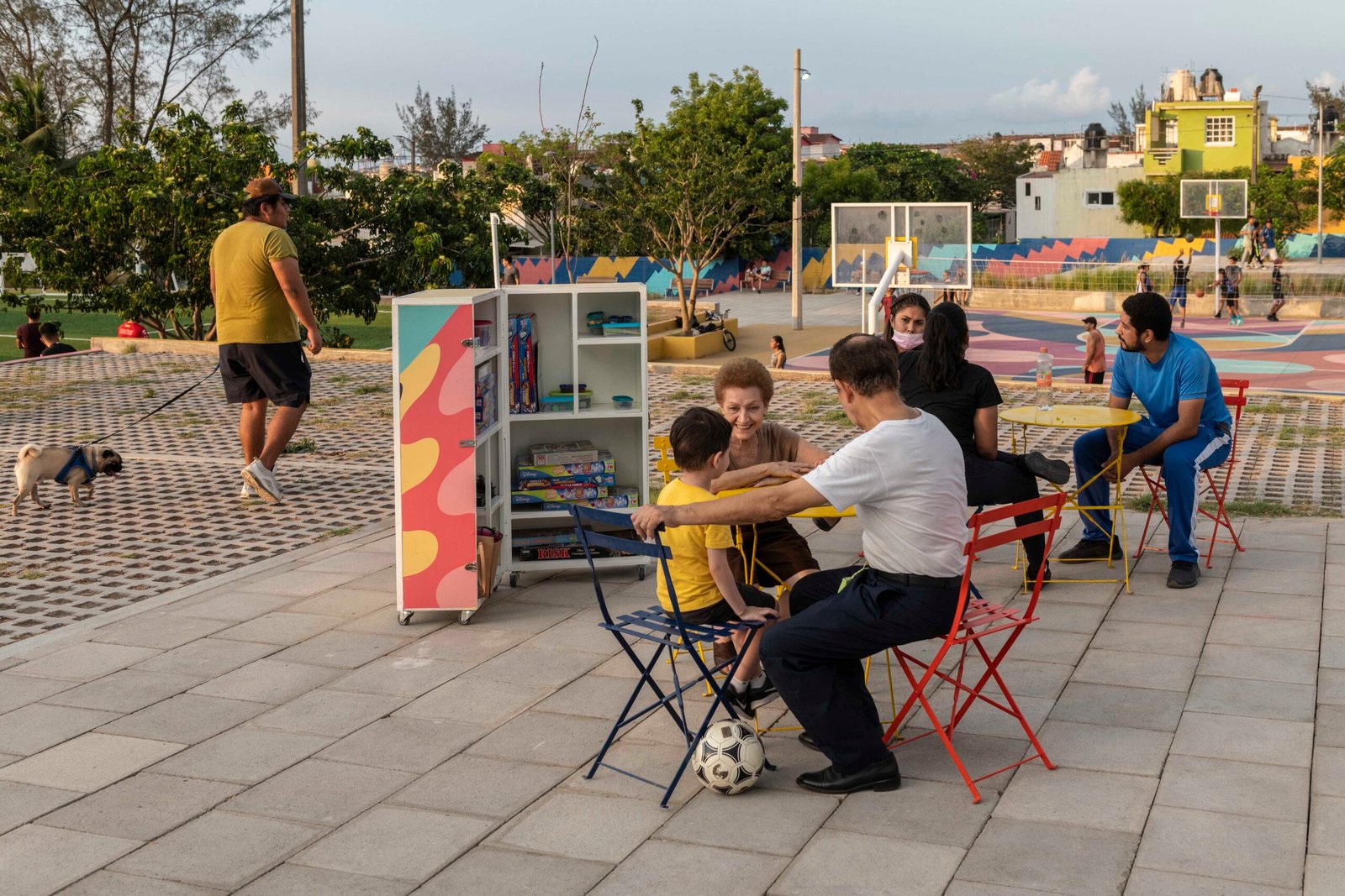 – Colocación de mobiliario urbano: botes de basura, bancas colectivas, mesas con sillas para actividades diversas, tres módulos móviles con juegos de mesa, material didáctico y libros para el círculo de lectores.
