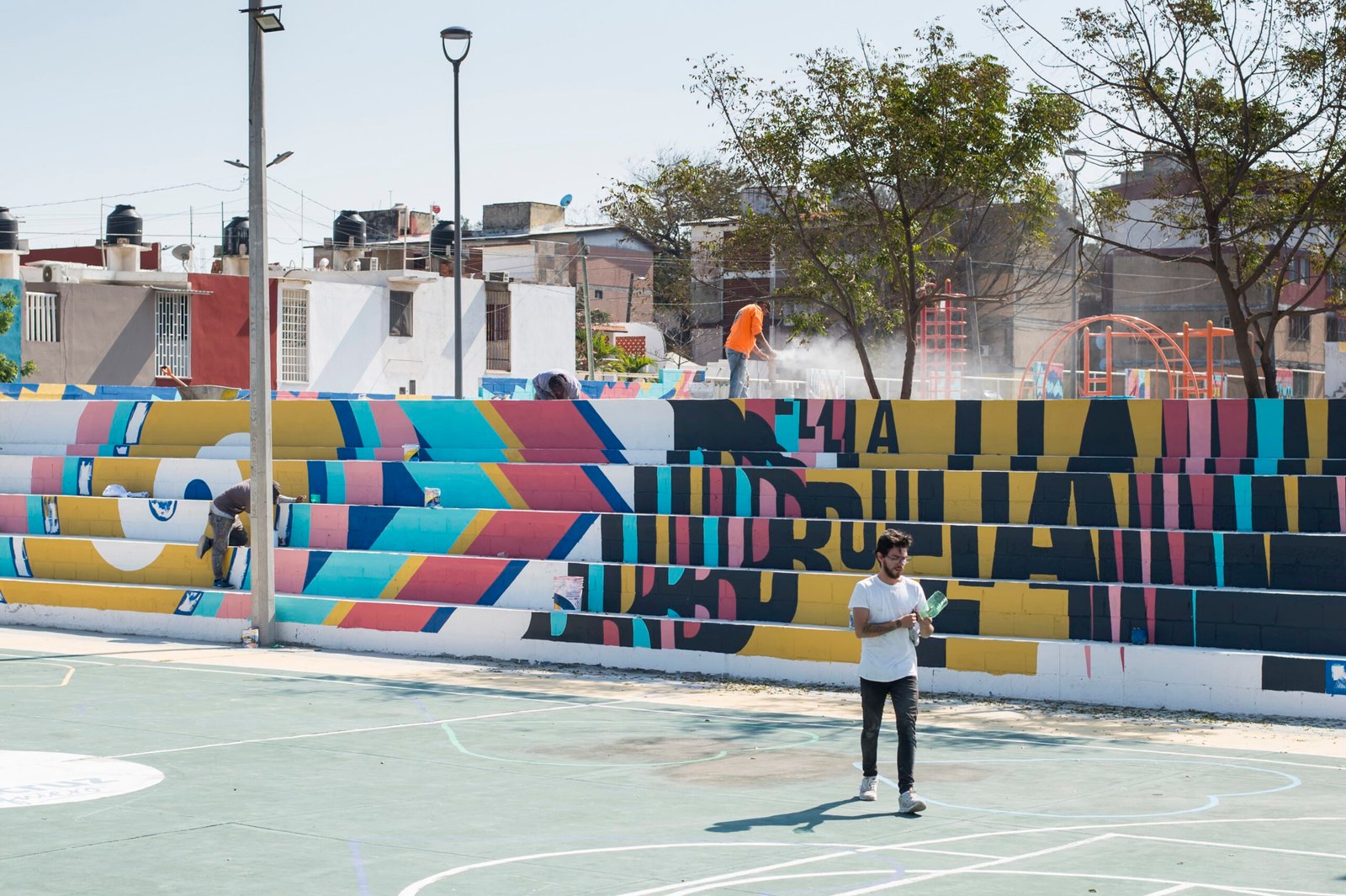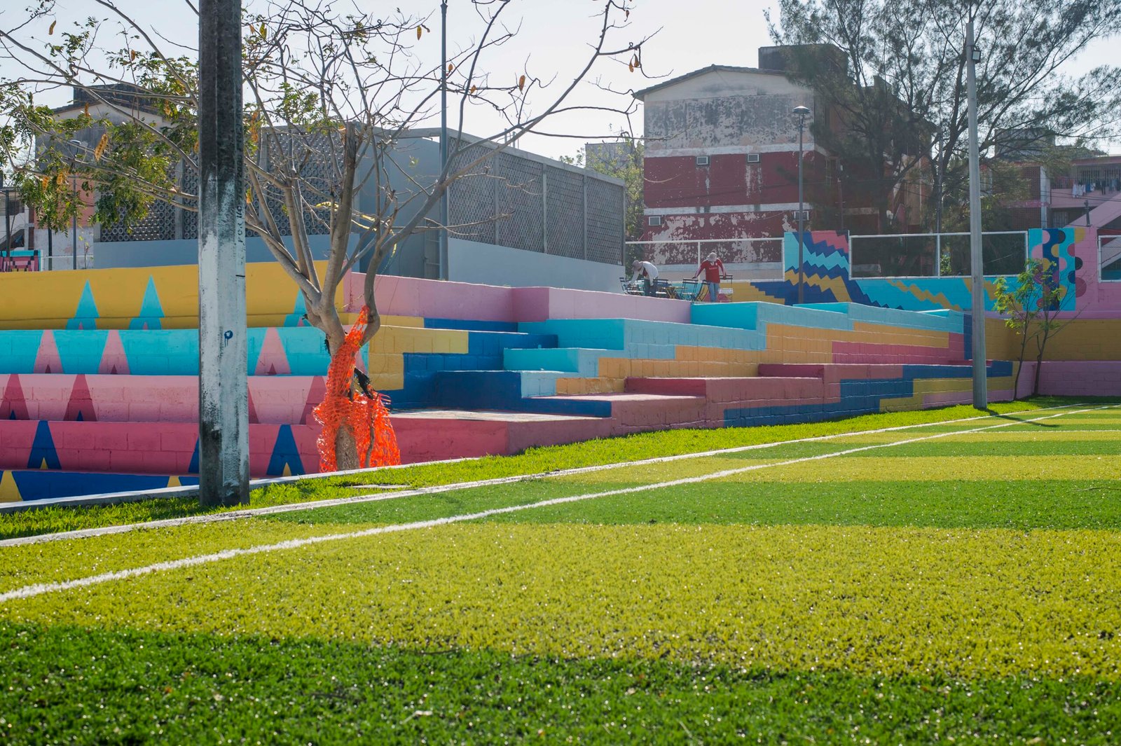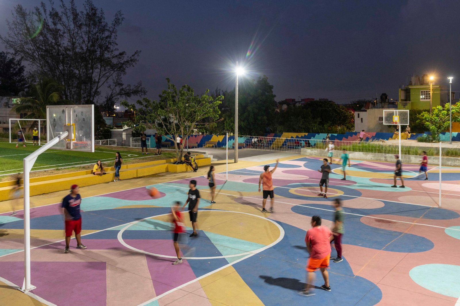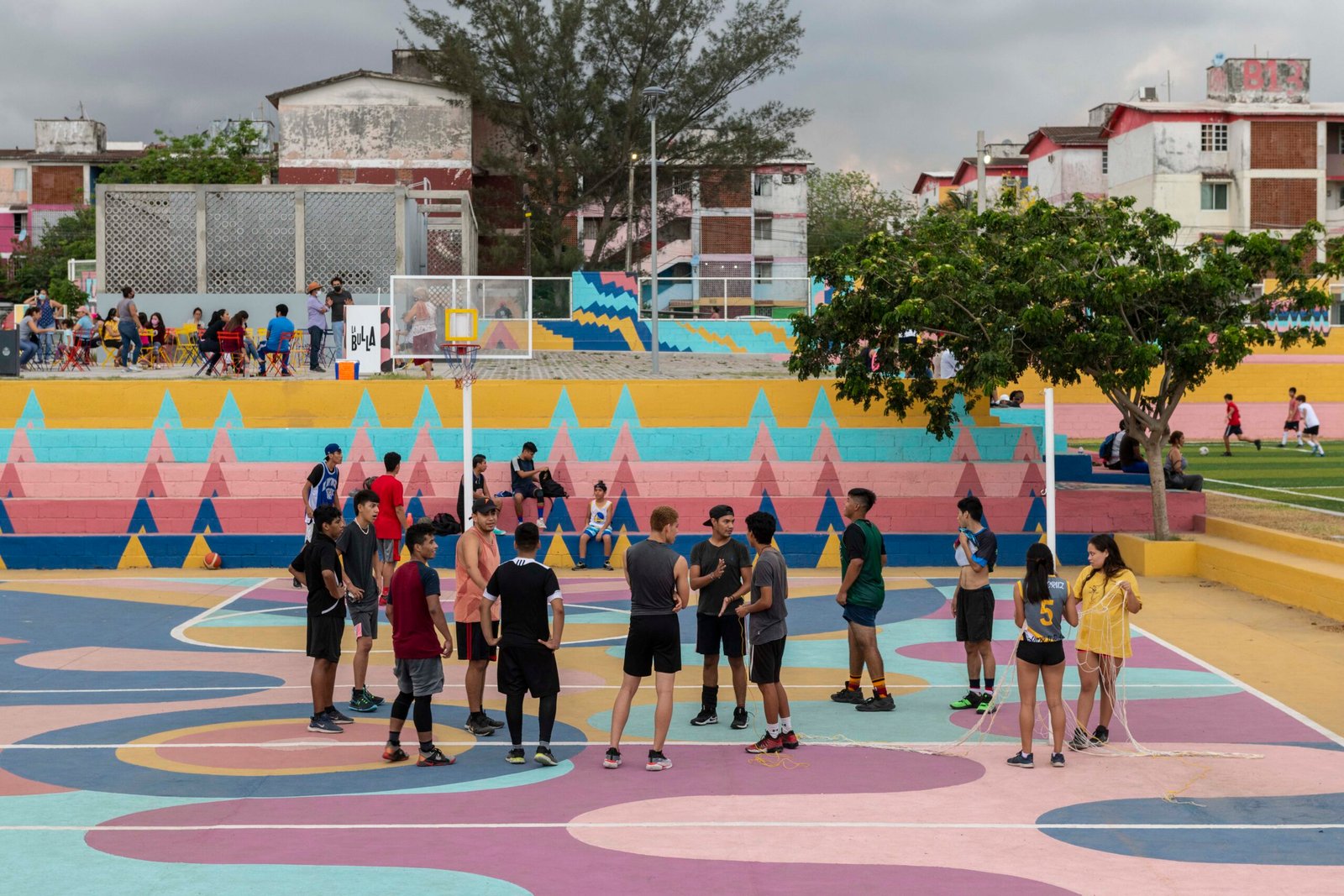 El concepto parte de los espacios existentes, más la generación de áreas de interés accesibles para todas las edades y condiciones de vida de la comunidad. En colaboración con un estudio de diseño se creó una estrategia inspirada en la vida diario de los jarochos. A través de los colores buscamos la identificación de la gente, la música, el baile, las risas, el juego de la calle, resultando un movimiento que genera patrones de acuerdo a las ondas producidas por estos sonidos. Dando como resultado “La Bulla” un espacio lleno de color donde todos son bienvenidos.