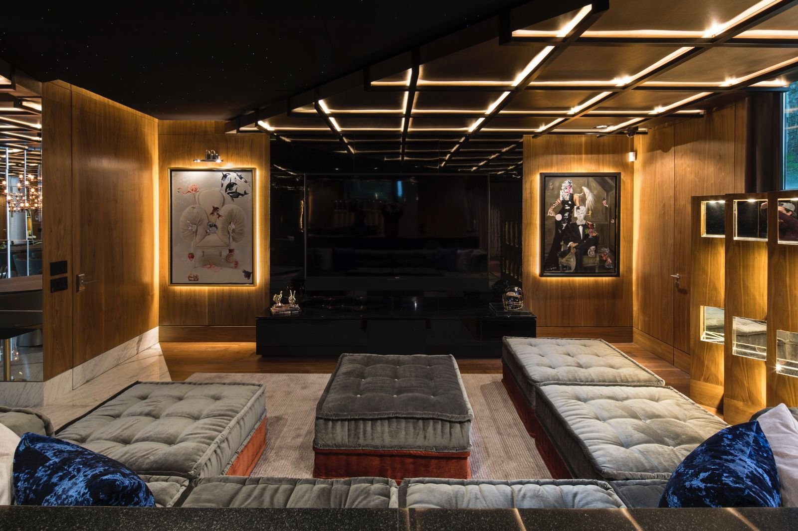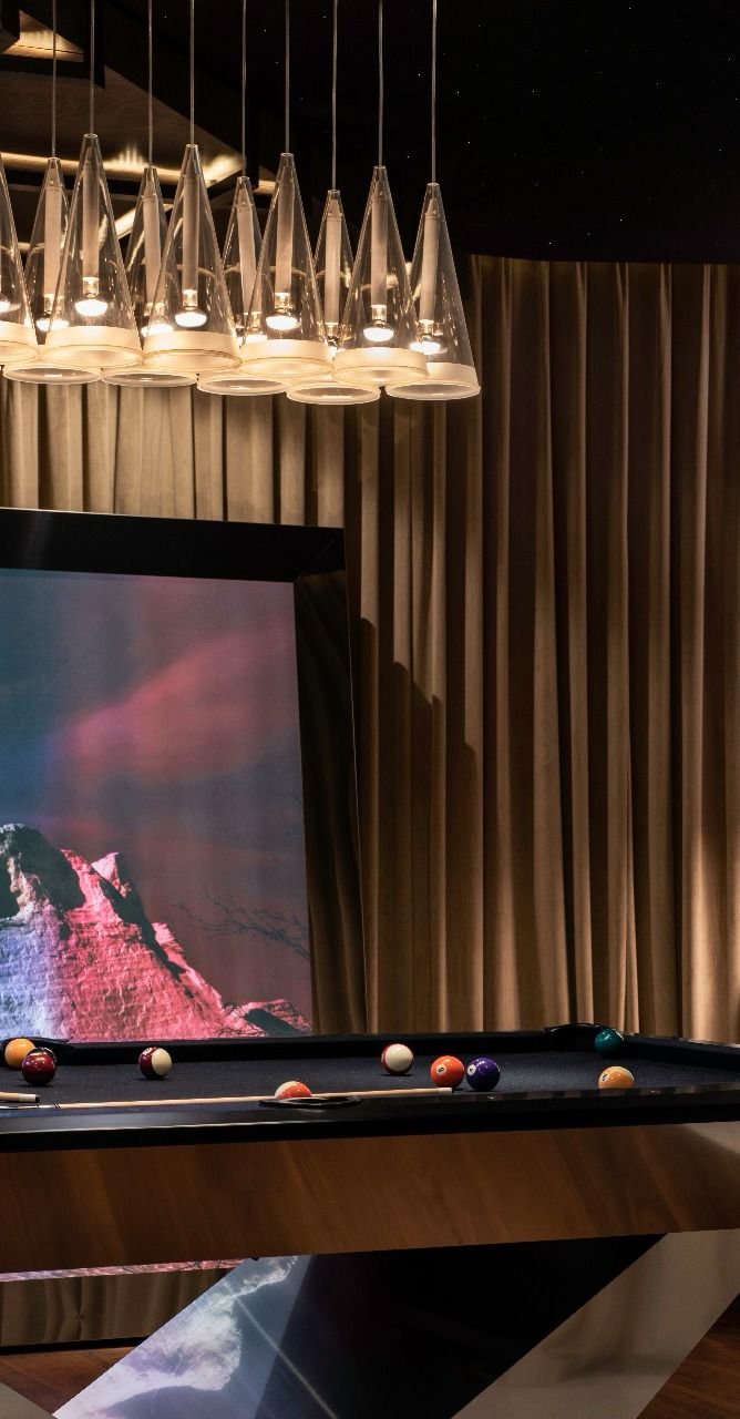 El pabellón alberga un área de comedor, bar, sala de TV y área de billar. Al aire libre se compone de una terraza con asador y un anfiteatro que a la vez funciona como escaleras para acceder al jardín posterior o principal, ya que el edificio se encuentra enterrado.