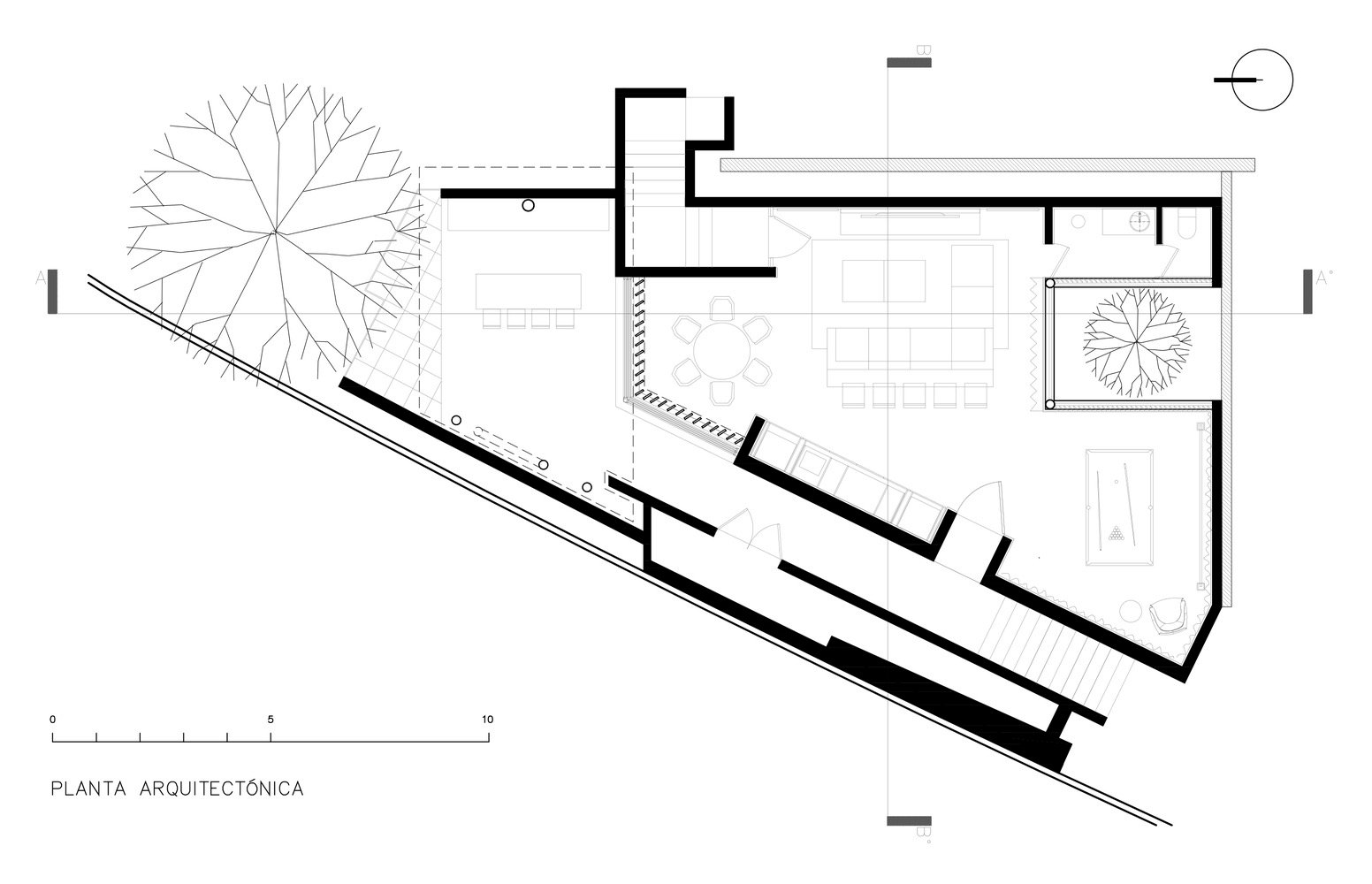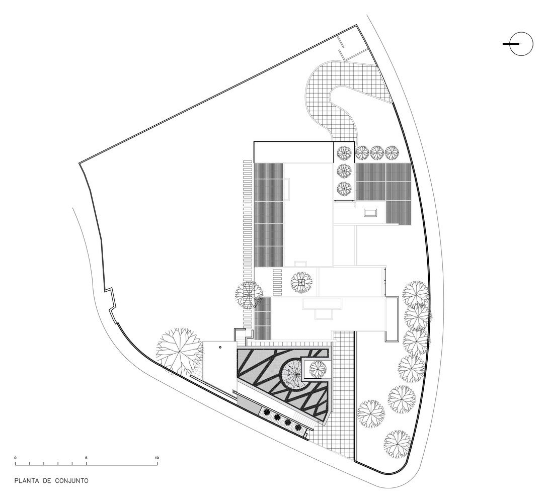 El diseño del pabellón surge de la proyección de una serie de líneas hacia el sitio de intervención, tanto de la geometría del sitio como de la casa existente. La huella del pabellón es una consecuencia directa de la lectura del contexto inmediato.