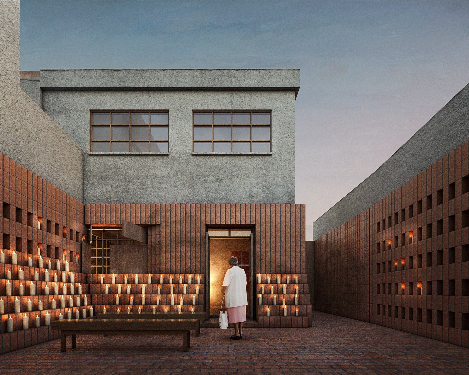 El altar, a su vez, se deconstruye con la misma materialidad hacia un patio, dando paso a un quemador donde los visitantes comparten sus peticiones