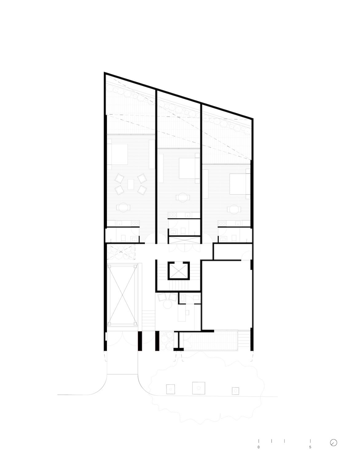 Ubicado en un predio de 27m por 15m de forma irregular, el proyecto se desplanta bajo un esquema de dos volúmenes interconectados por el núcleo de circulaciones verticales.