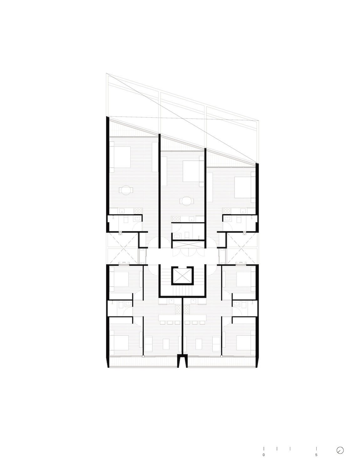 Por la naturaleza del terreno lo primero que se plantea es la separación de dos volúmenes, uno al frente y otro en la parte posterior, unidos por el núcleo de circulaciones verticales. Esto ayuda a generar unidades orientadas al norte y otras con orientación sur.