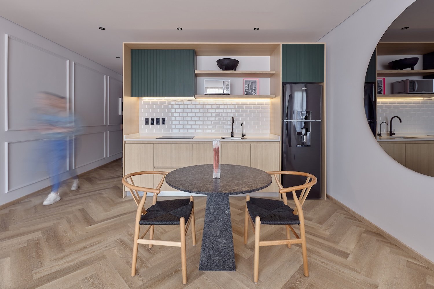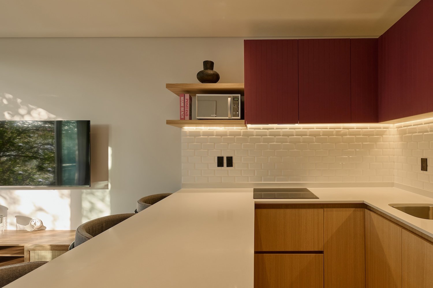 Las carpinterías son de madera clara y en varias de las tipologías un mismo mueble resuelve múltiples necesidades, como el clóset que es a la vez el mueble de la televisión. Cada tipología se acentúa con detalles en color.