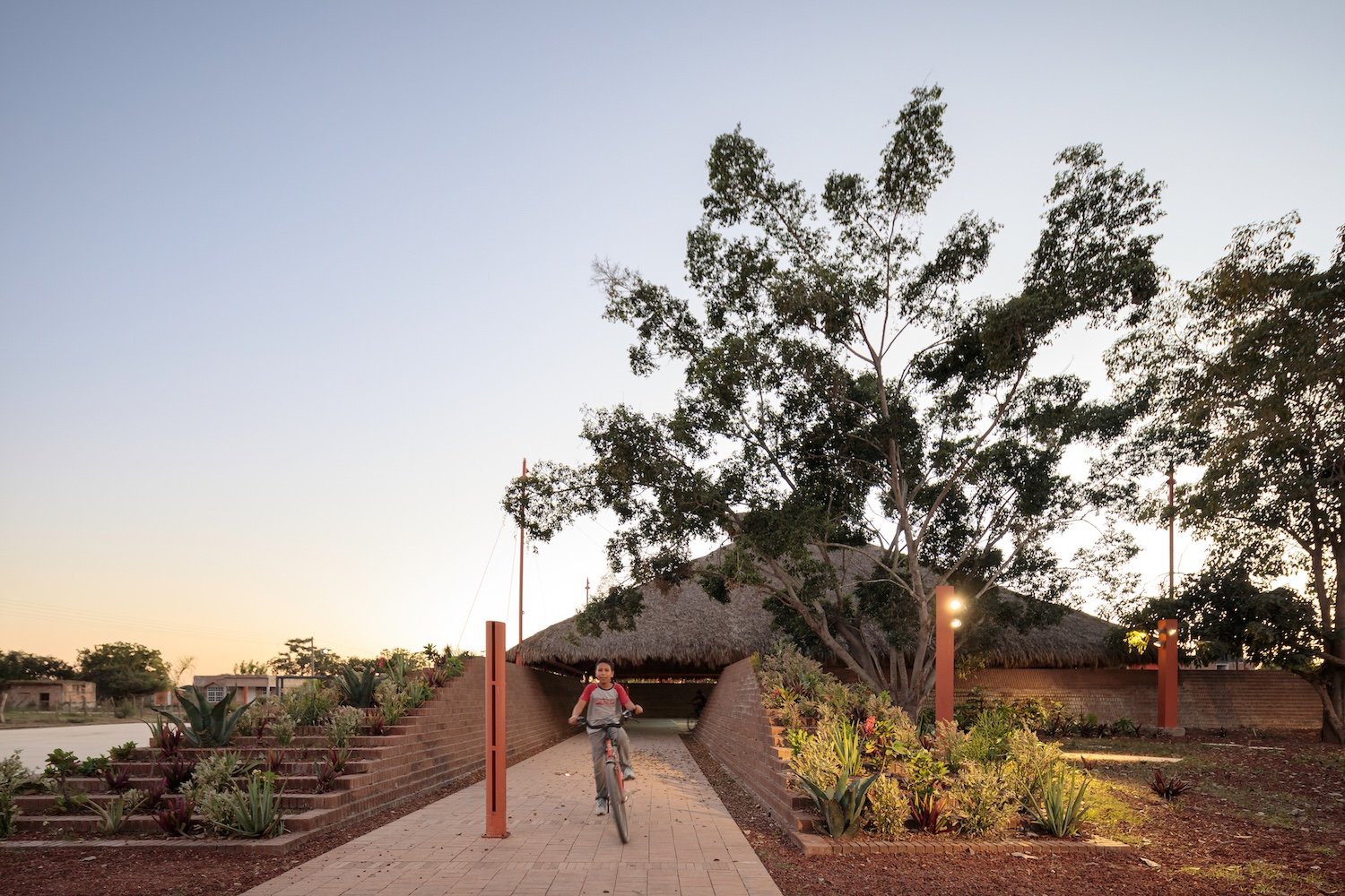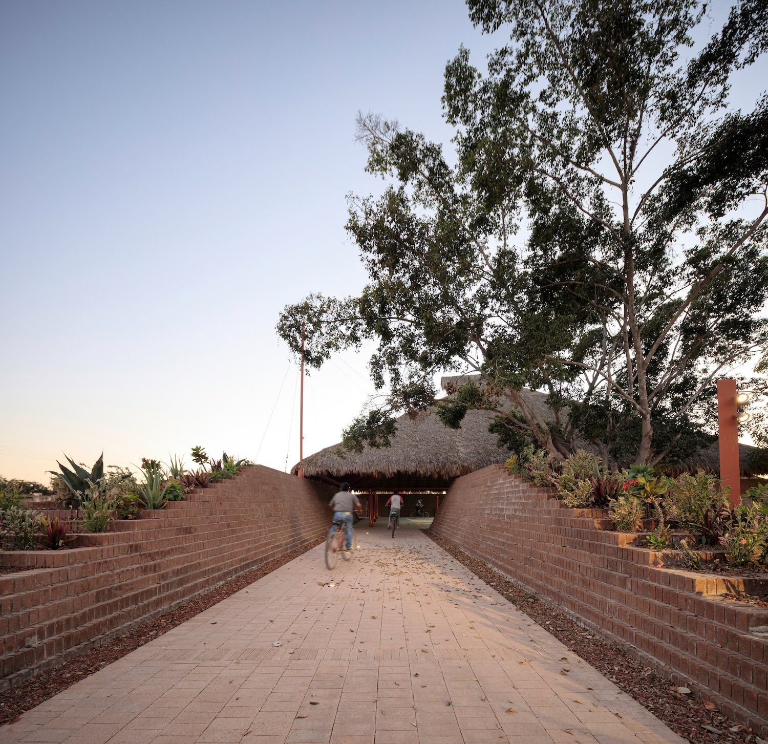 La comisión es una nueva plaza que debe integrarse con la iglesia. El objetivo del proyecto es articular el espacio abierto y la iglesia, reconociendo los diversos bordes que conforman el sitio (borde del poblado, andadores peatonales y vehiculares y la carretera) y conservando la vegetación existente. A través de un gesto diagonal, se hacen coincidir los ejes de ambos espacios y se crea la articulación entre ellos: Una pequeña plaza que formaliza el pavimento a los pies del acceso de la iglesia y que forma la primera de las múltiples plataformas que se elevan en la plaza para crear una topografía habitable. En el perímetro la topografía crea, naturalmente, un talud que define el espacio de los dos andadores perimetrales a la plaza. De este modo la iglesia se integra, en l amedida de lo posible a las dinámicas del poblado, se relaciona con el paisaje y se protege de la carretera, visual y acústicamente, con el espacio público de un foro ascendente.