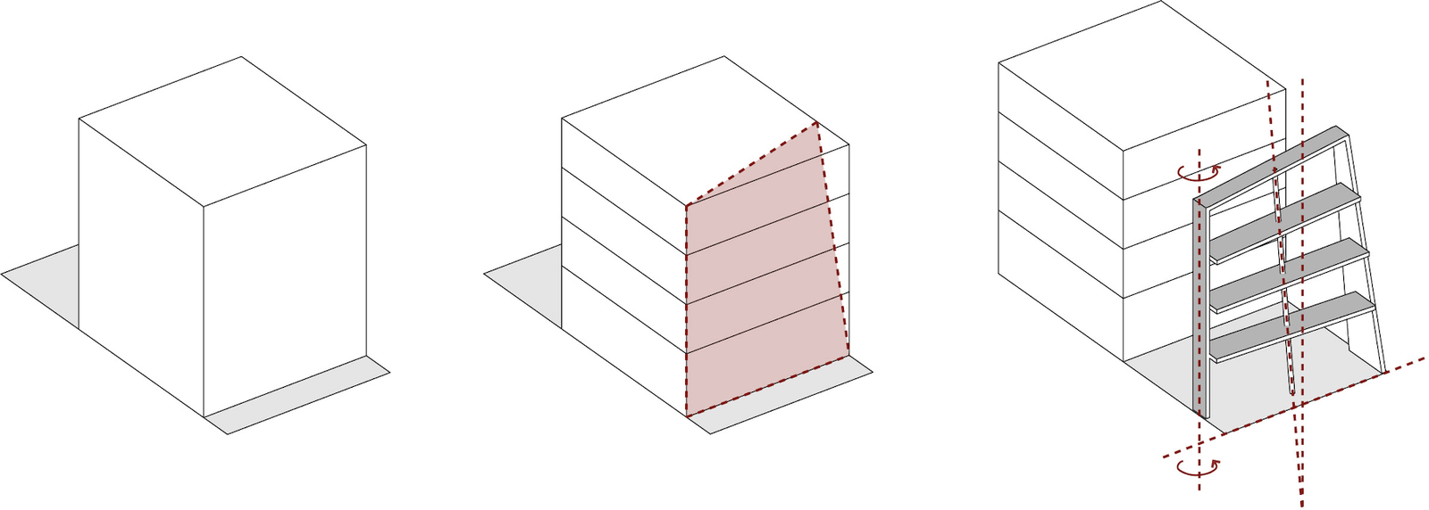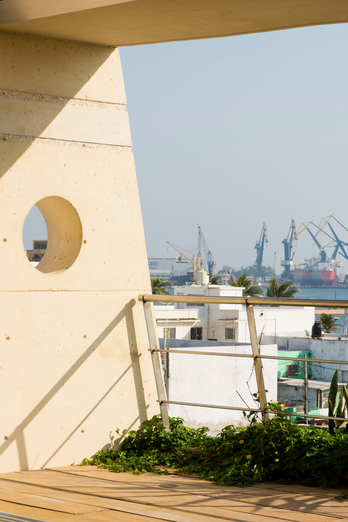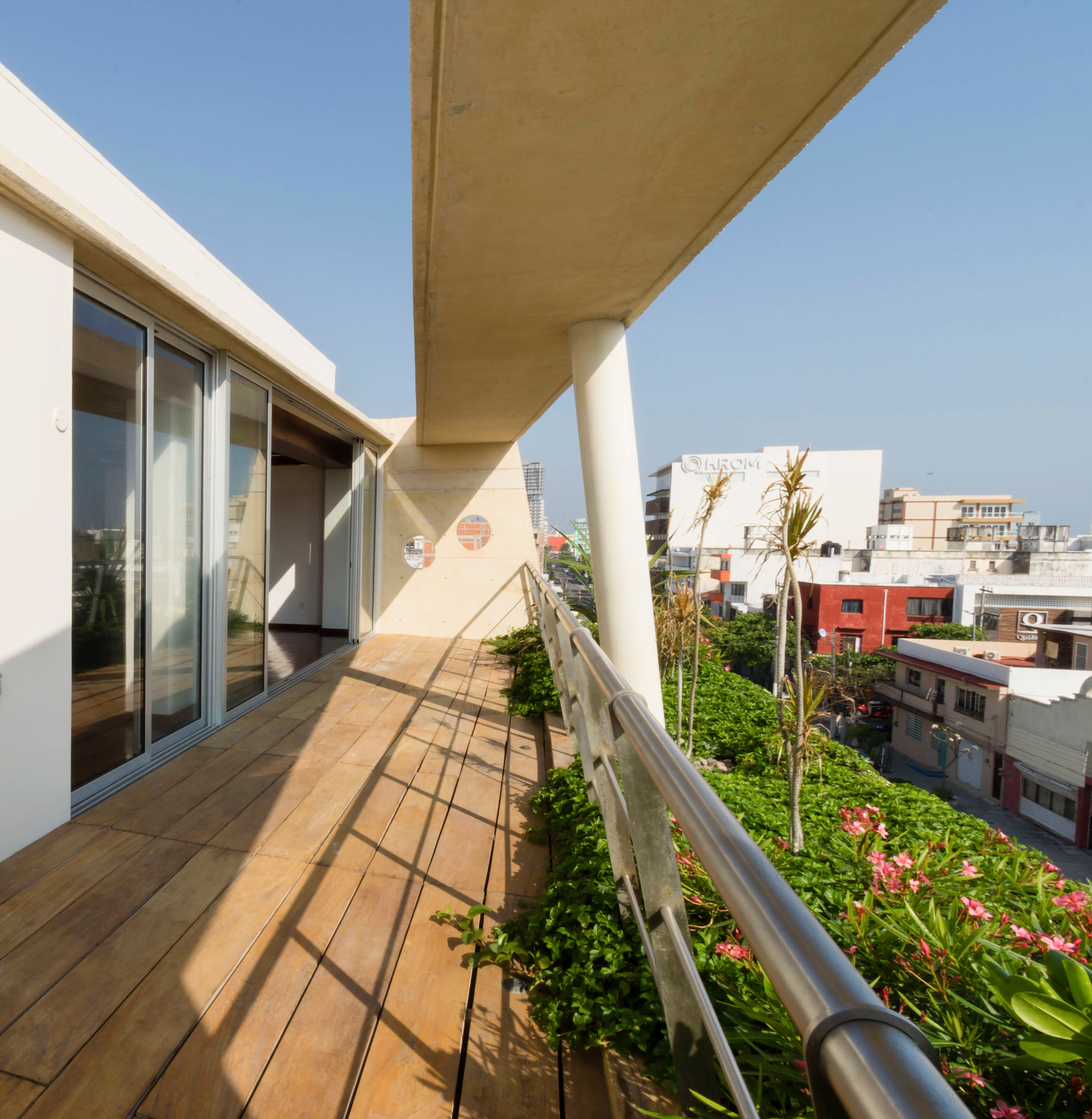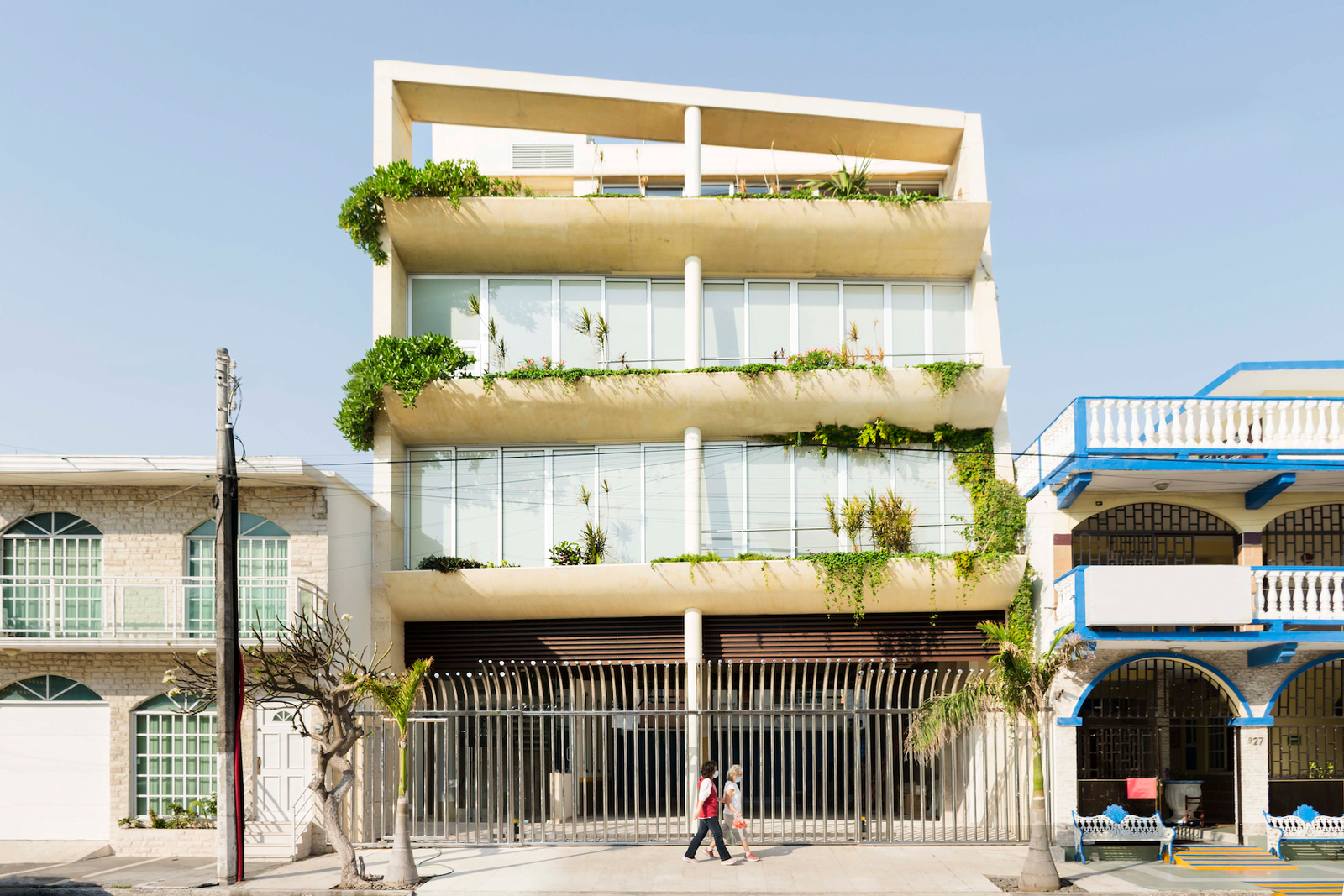 Formalmente, la colindancia izquierda mantiene un plomo vertical, mientras que la de la derecha se inclina hacia dentro del predio, junto con el paño de las losas de cada nivel a manera ascendente, tratando de generar un ritmo cambiante en perspectiva para el observador conforme avanza sobre la calle o se aproxima al edificio. La losa con la cota más alta sobre la fachada hace un gesto de cierre entre las dos colindancias, a la vez que enmarca y sombrea una terraza para la única vivienda del edificio, la cual goza de vistas privilegiadas hacia el antepuerto de Veracruz. Este gesto de enmarcar y delimitar toda la fachada del edificio con un elemento de concreto de sección constante se pensó acorde al concepto de diseño total de Gio Ponti.