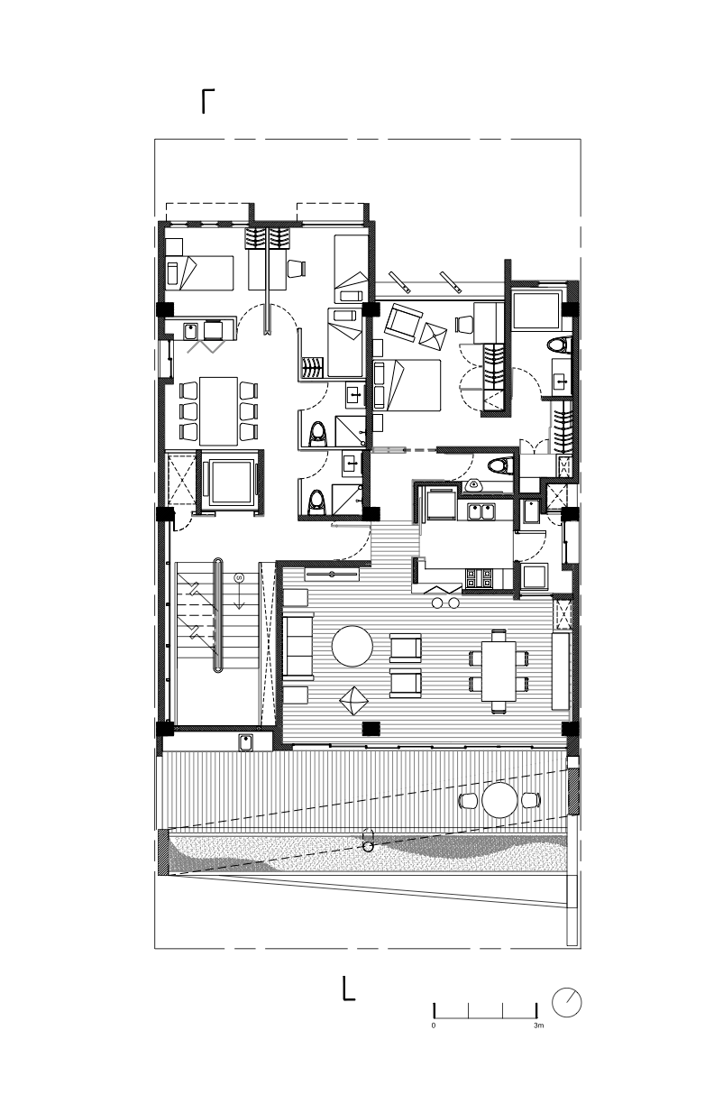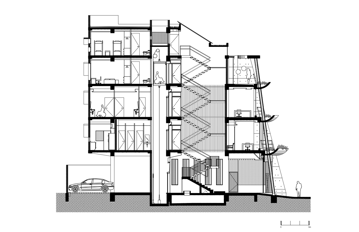 Esta fachada se va alejando del paramento hacia la calle conforme la cota asciende, y en planta baja el paramento se retrae respecto de los vecinos para formar un espacio a manera de zaguán o vestíbulo exterior, buscando generar un espacio de encuentro y transición entre lo público y lo privado. Así se pensó a manera de integrar el edificio al contextoy dar escala evitando lo disruptivo.
