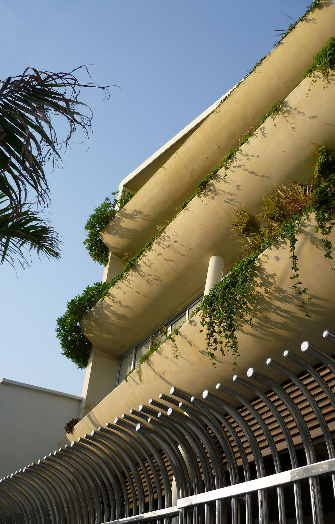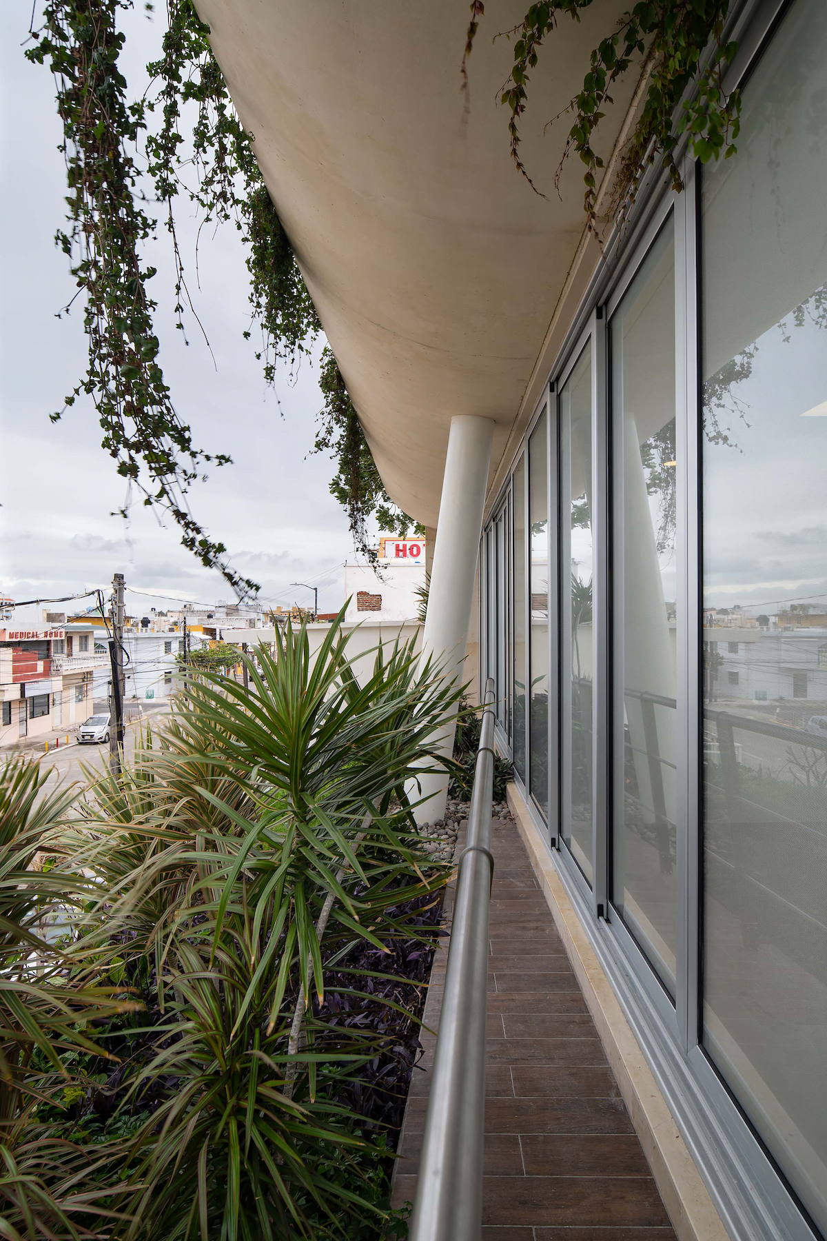 La fachada principal se distingue contundentemente por tres voladizos semi curvos que son atravesados por un puntal estructural de color blanco que remite a un mástil. Estos voladizos circulares de concreto blanco pigmentado aparente, son utilizados con el múltiple propósito de proteger del asoleamiento directo, albergar terrazas con jardinería que mejoranla vista y la temperatura, así como para cortar las visuales directas inmediatas desde el exterior.