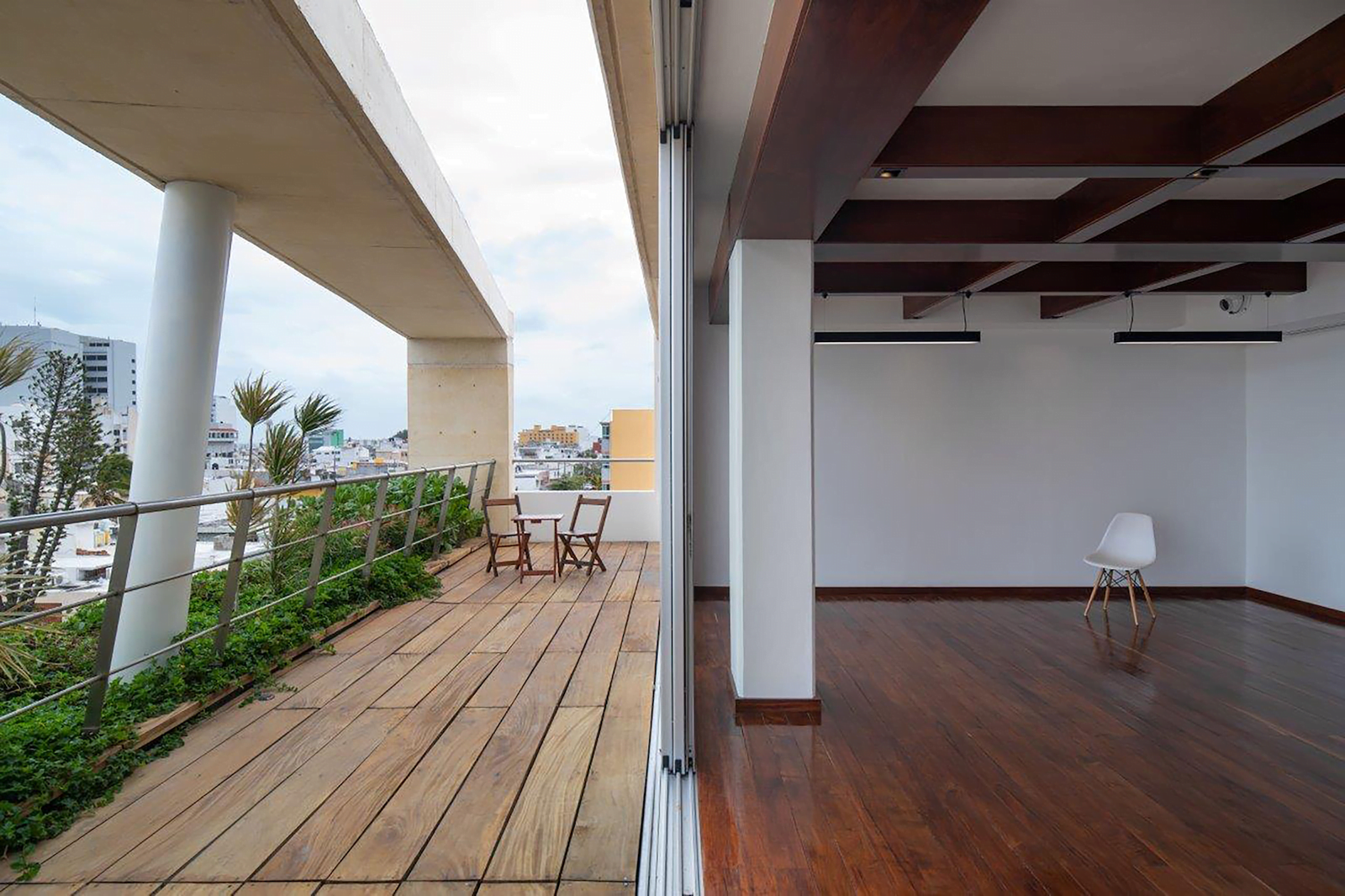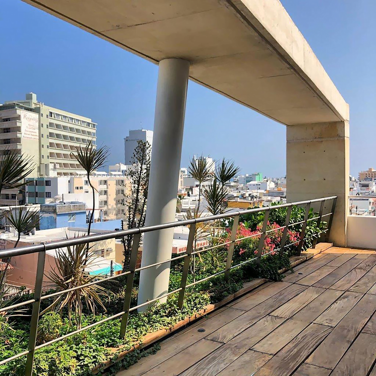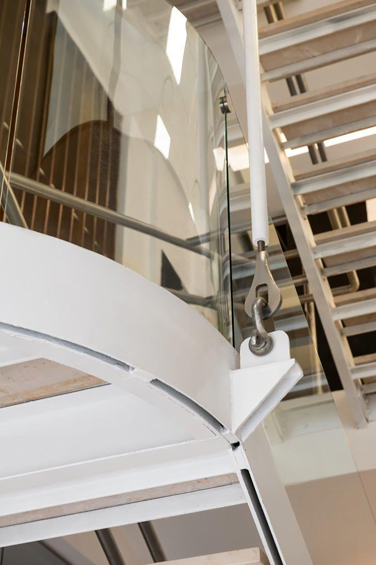 Se incluyó un elemento metálico, en este caso un puntal circular que trabaja como columna central. Este elemento se galvanizó por inmersión previamente a su colocación en la obra y se ligó estructuralmente a las trabes y losas de concretoblanco pigmentado para que hiciera su función de carga.