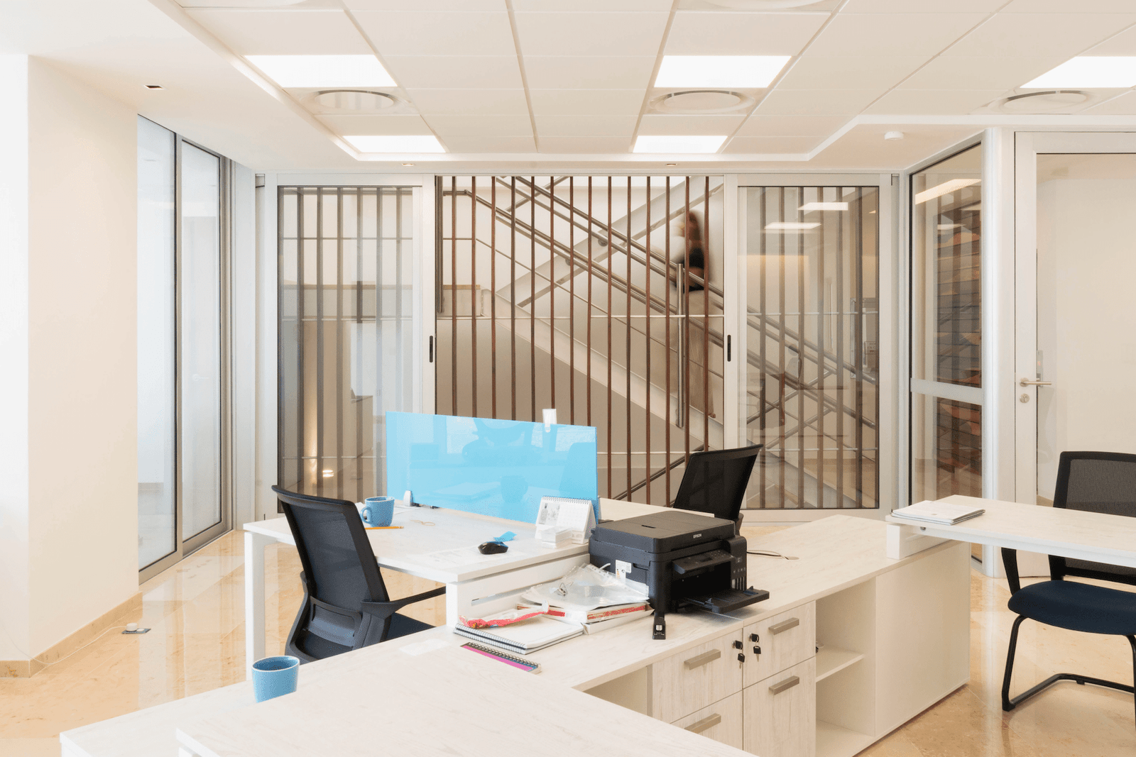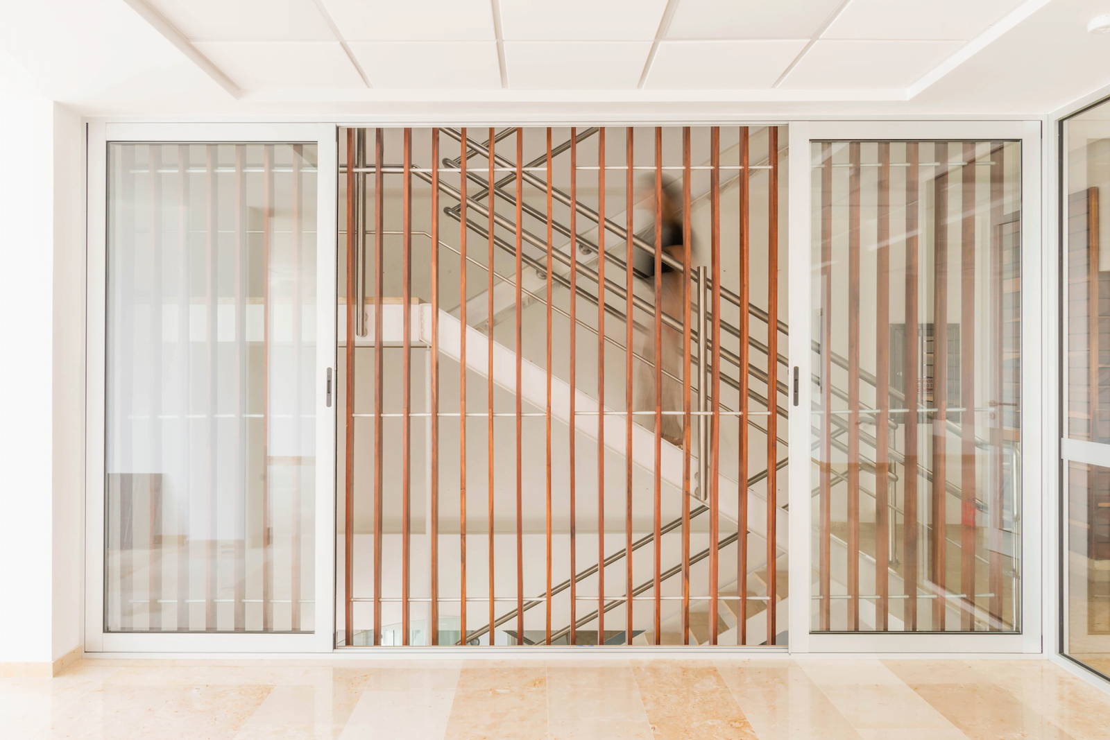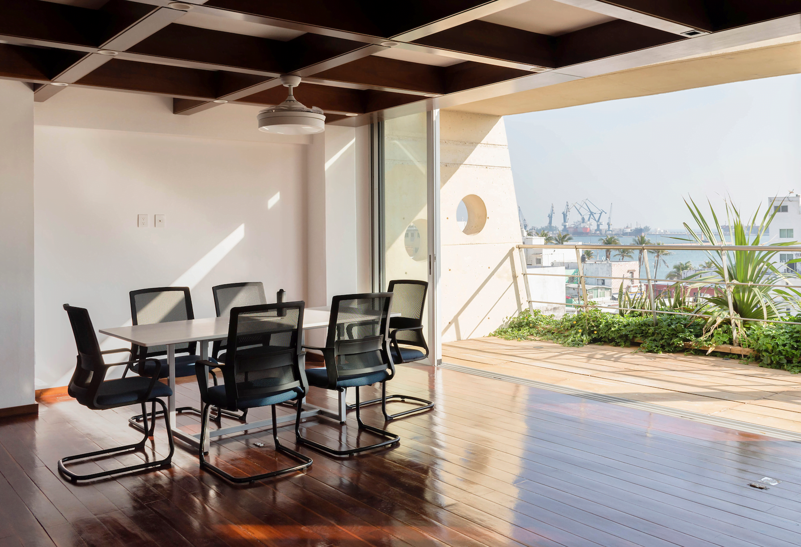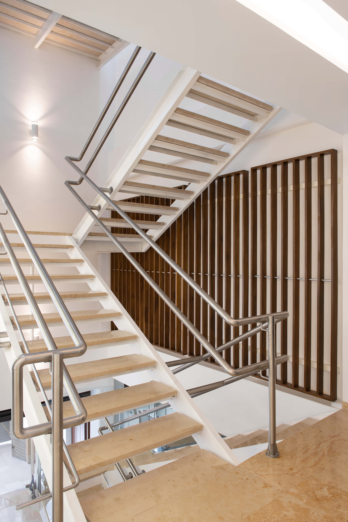 El núcleo principal de circulaciones verticales está ocupado por un elevador, ductos de instalaciones y una escalera metálica que podría estar dentro de un barco. Su primer descanso se sostiene por medio de un tensor -con un juego deconexiones que se utilizan para izar y mover los contenedores de un barco carguero-, como gesto para quién por familiaridad lo reconozca. Este núcleo principal distribuye la circulación en cada piso hacia un módulo colindante que alberga baños generales y hacia las plantas libres de oficinas, pero también funciona como elemento de ventilación, pues se generó un tiro de ventilación, tomando aire del exterior a través de ventanas en la planta baja y de los canceles de piso a techo en los pisos intermedios, desfogando el aire caliente hacia la parte superior apoyado por otro flujo de ventilación en sentido horizontal, que se logra abriendo dos ventanas situadas en la parte más alta de este espacio de circulación de cuatro pisos de altura, generando un efecto de chimenea. A la cancelería de piso a techo en los pisos intermedios se le colocaron celosías de madera como protección hacia el vacío y como cortantes de vistas desde el pasillo de acceso, permitiendo así ventilación e iluminación natural gracias a este tiro vertical que a la vez es circulación vertical.