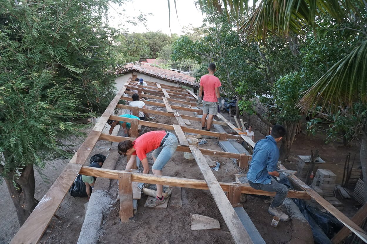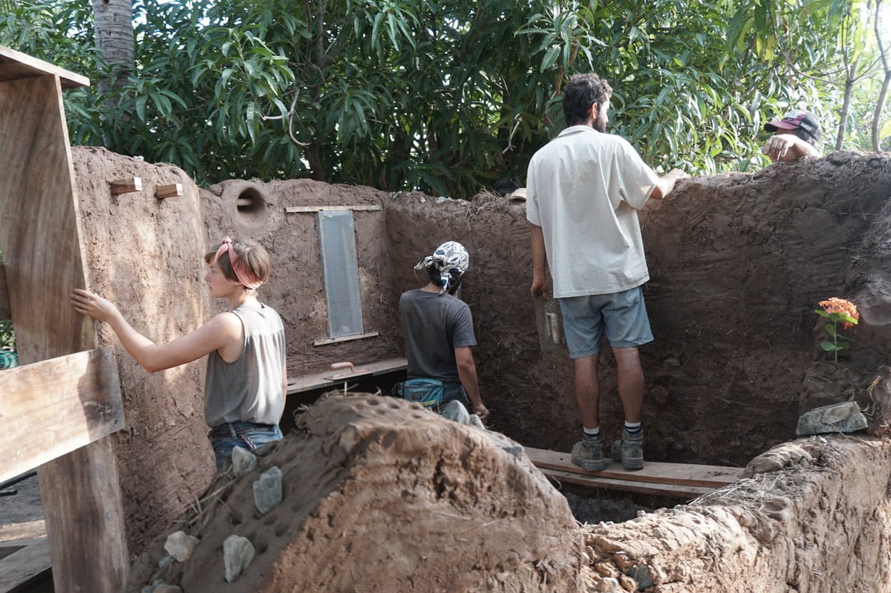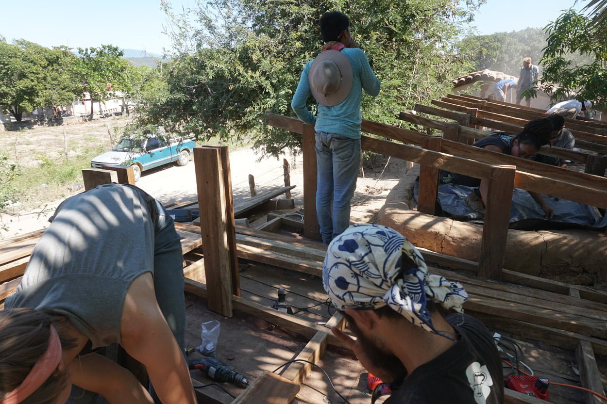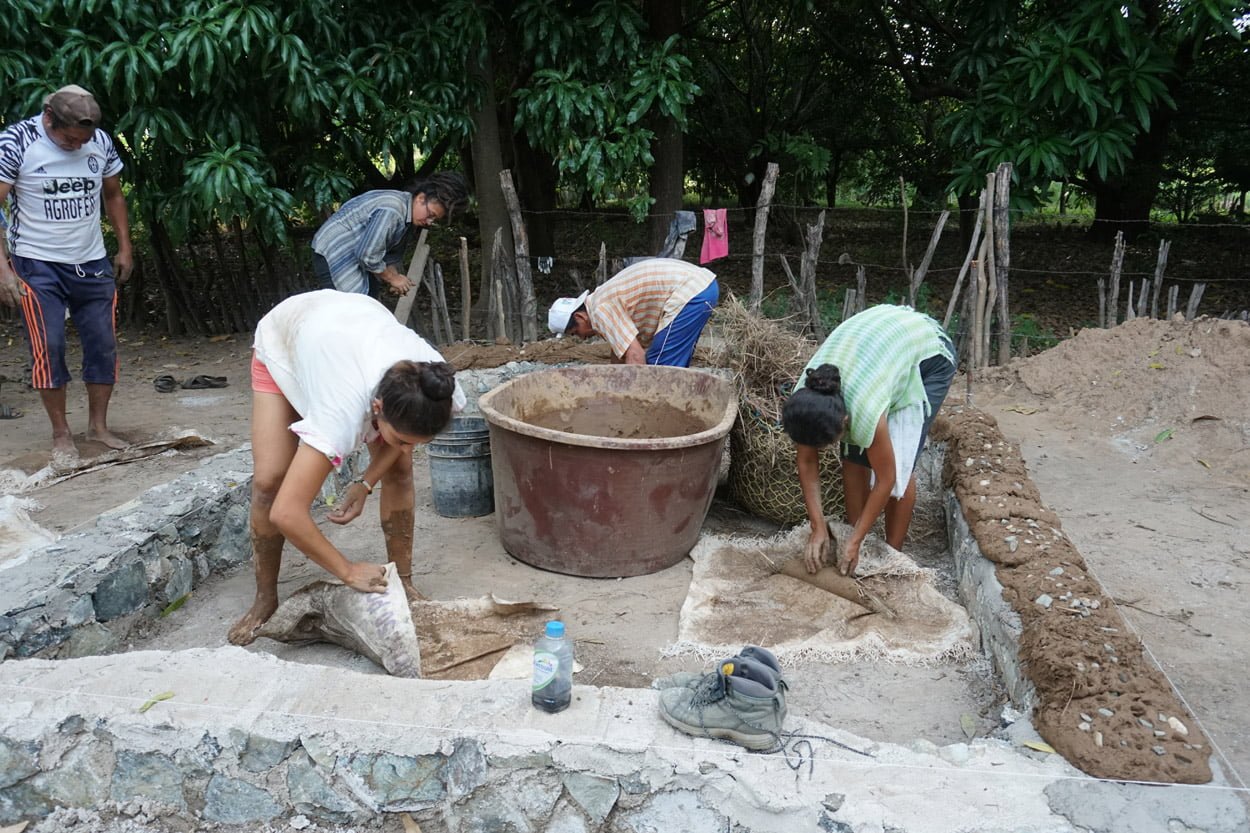 Voluntarios, familias y profesionales trabajamos en el lugar en cada etapa y aspecto de la construcción, desde la recolección de los materiales de libre acceso en el territorio (suelos arcillosos, las fibras naturales y piedras de cimentación) hasta las actividades que rodean al programa: hospedaje, la comida, logística y la construcción misma. Es así que Programa VACA A.C. sirve como una plataforma de apoyo a familias en condiciones de alta vulnerabilidad, que sobreviven la pobreza multídimensional y al mismo tiempo es una escuela de buenas prácticas de arquitectura sostenible. Voluntarios y familias refuerzan, aprenden y desarrollan conocimientos constructivos replicables y de bajo costo.
