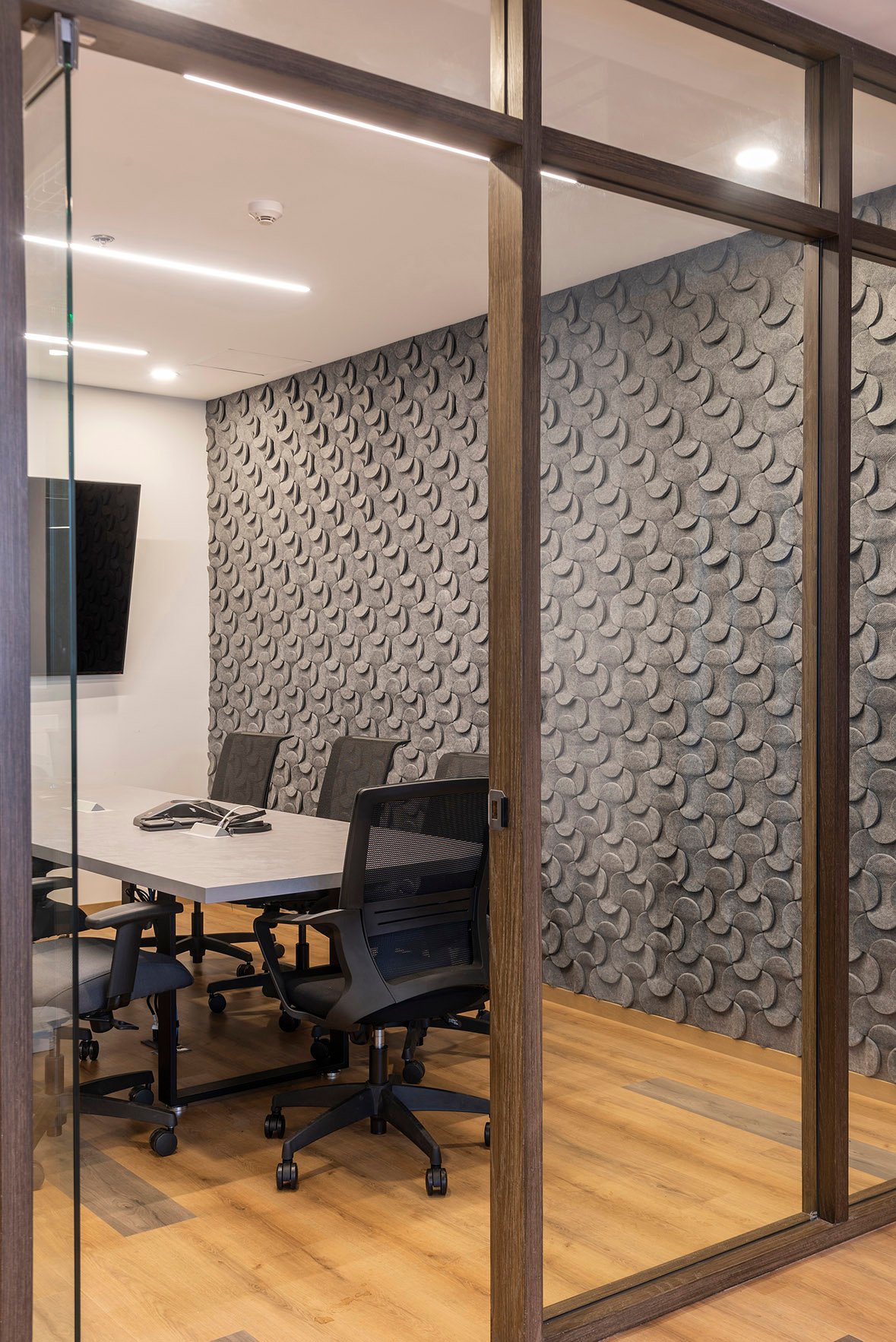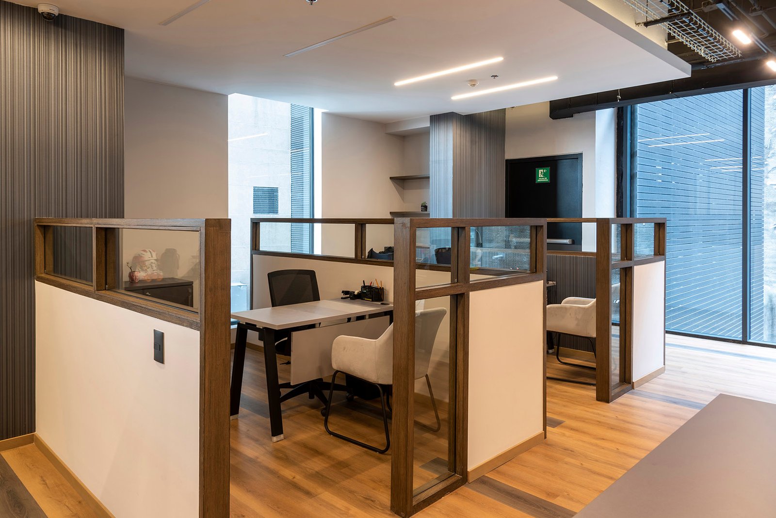 La paleta de acabados y colores también responde a los lineamientos establecidos, habiendo revisado previamente con los usuarios que no hubiera alguna incomodidad o molestia. Se instalaron pisos de SPC que además de ser muy resistentes y fáciles de limpiar, tienen cualidades acústicas correctas para los ambientes de trabajo. También se incorporaron muros recubiertos con Tektil y mobiliario de Estudio M para lograr la continuidad con el primer espacio y un resultado eficiente y productivo.