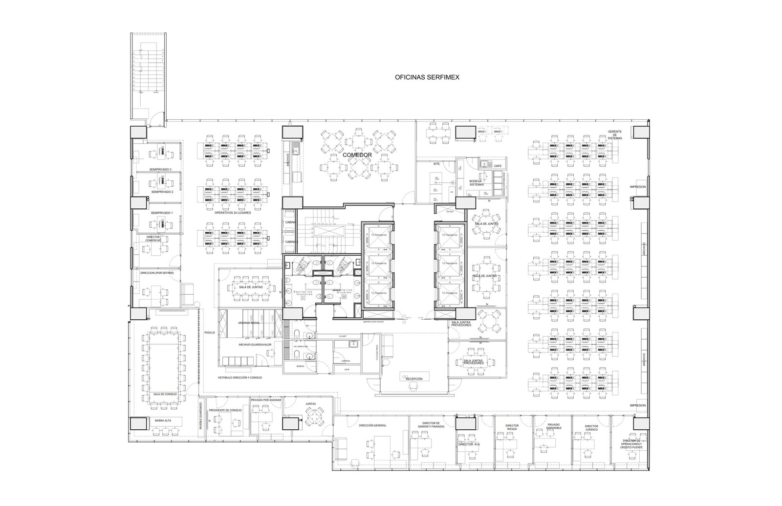 El éxito de la empresa Serfimex nos llevó a retomar el espacio adicional que quedó pendiente en la primera fase y presentar una propuesta para el crecimiento del área comercial. Con base en los parámetros definidos para el proyecto original surge la propuesta para Serfimex 2.0 que comprende: área operativa, zona de gerentes, una sala de juntas y cabinas para el trabajo individual o llamadas telefónicas con mayor privacidad.