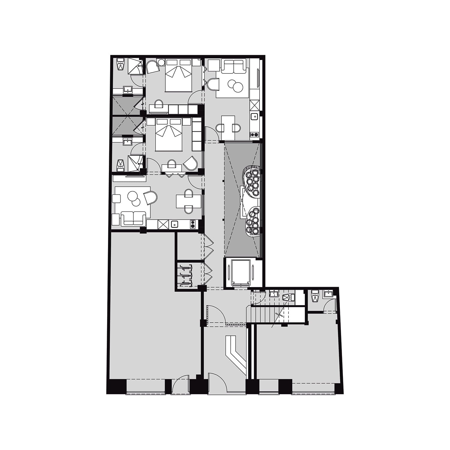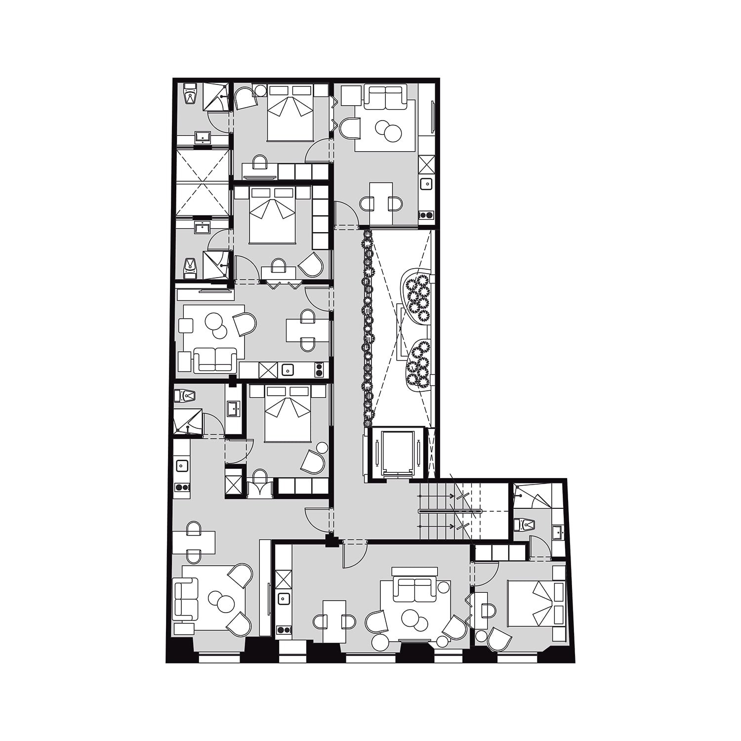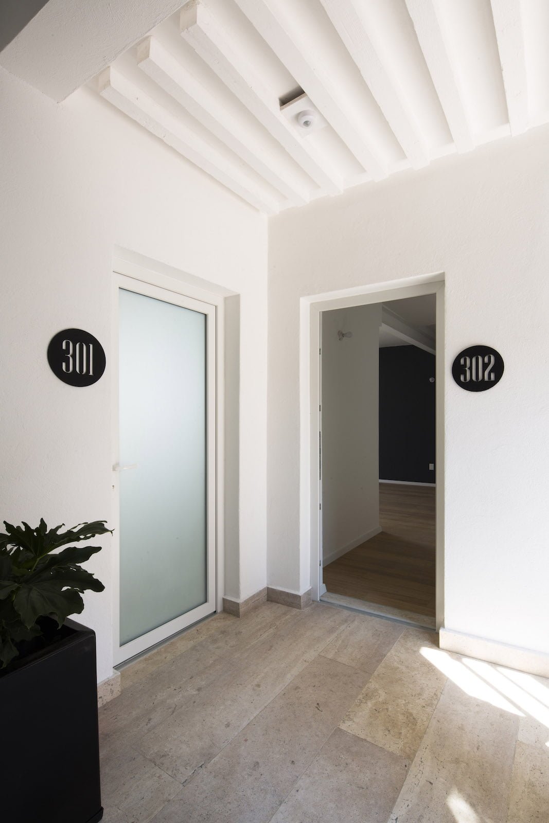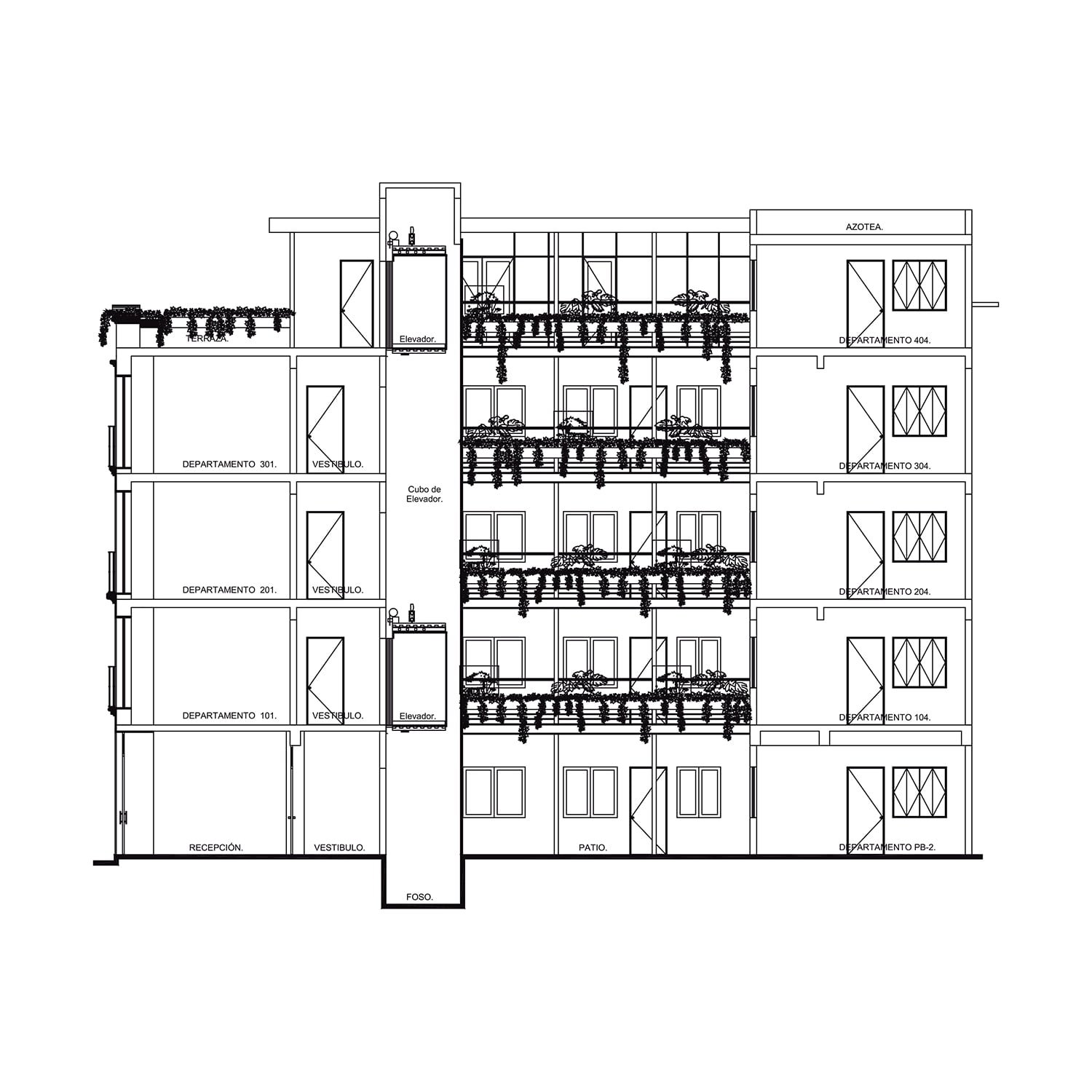 Bajo la idea principal de optimizar el espacio sin hacer sacrificios de confort, el proyecto cuenta con un lobby principal en planta baja, un patio central al que se le ha incorporado una fuente que recorre todos los niveles del edificio y acompaña el núcleo de circulación vertical (elevador y escaleras principales). De este modo se conectan todos los departamentos y se aíslan del ruido exterior logrando que la fuente sea el elemento sonoro que ambienta cada uno de los espacios interiores. Así el proyecto corona la parte superior con una terraza abierta y un centro de amenidades: gimnasio, servicios, asador, un salón principal y el roofgarden con una vista privilegiada de la Ciudad de México, éste es sin duda el espacio de convivencia más atractivo del proyecto.