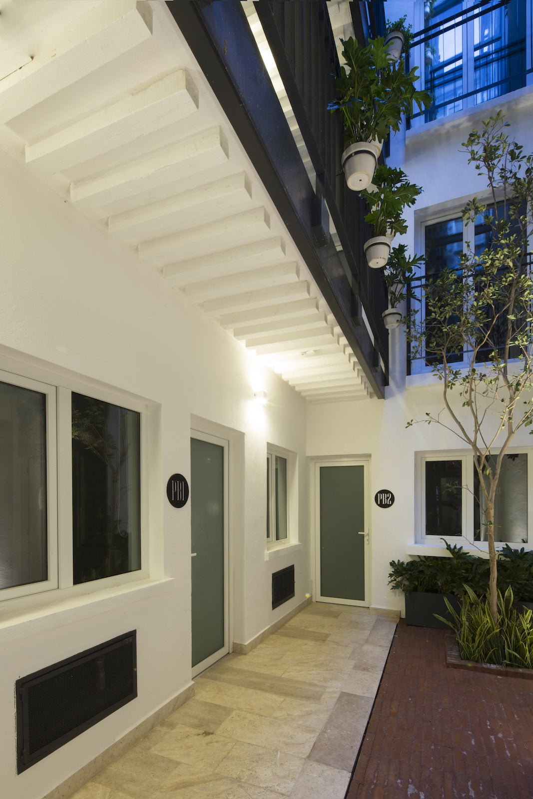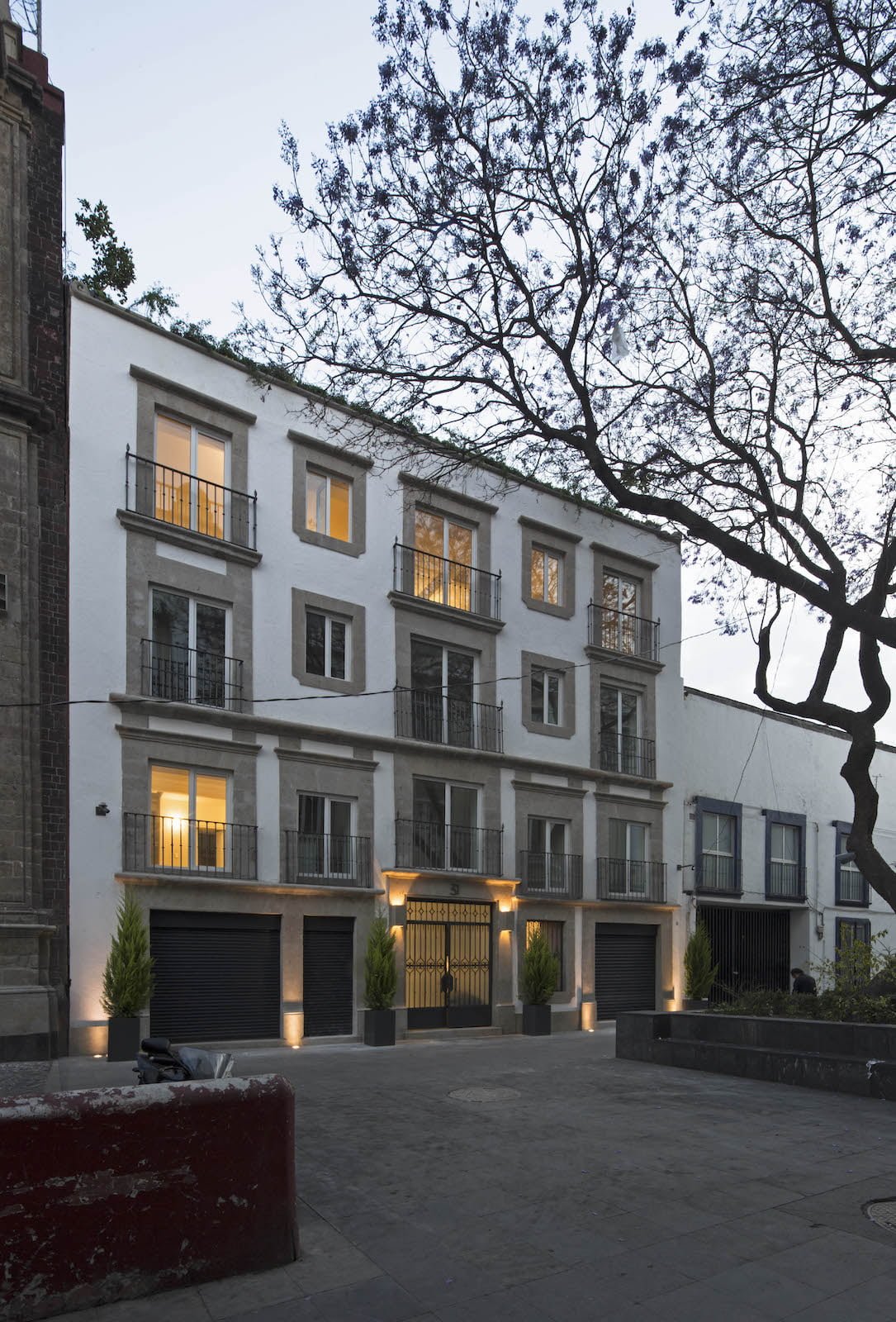Esta recuperación exitosa que contó con el aval de dependencias oficiales se mesura en acabados y en detalles arquitectónicos poniendo como punto de énfasis la arquitectura en su distribución original, la optimización de recursos y la sencillez de gestos constructivos en muros y plafones en color blanco, beige y acentos de color negro en la herrería. Correspondencias francas a los edificios aledaños y su discreta presencia. Tres elementos acentúan un gesto de ruptura por medio del color: la vegetación que colma las vistas desde el patio central y su tratamiento en piso, un mural en el lobby en color dorado y el abundante jardín del roofgarden que acompaña una jacaranda exterior que domina la calle de San Ildefonso.