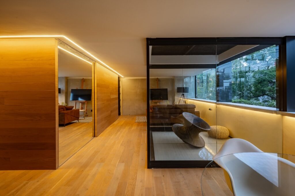 Pedro Martínez arquitecto Un departamento de estilo contemporáneo, el proyecto busca transmitir elegancia y sofisticación, calidez como prioridad y adoptar las vistas exteriores como propias, tanto de contexto urbano y naturales como el cerro de la silla por decir un ejemplo. Ubicado en San Pedro Garza García, N.L, con una superficie total de 460 m2,