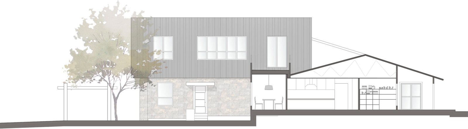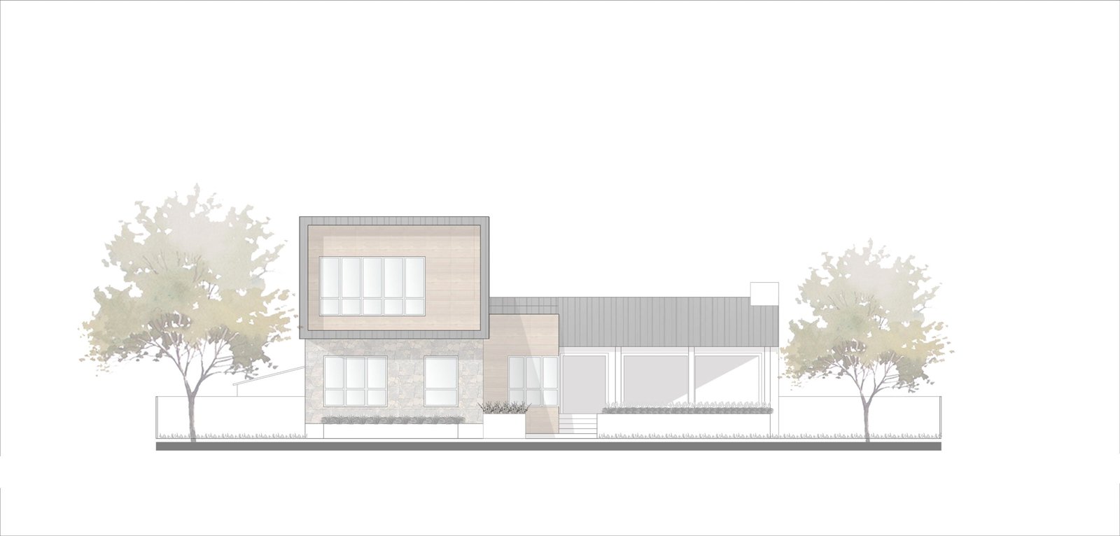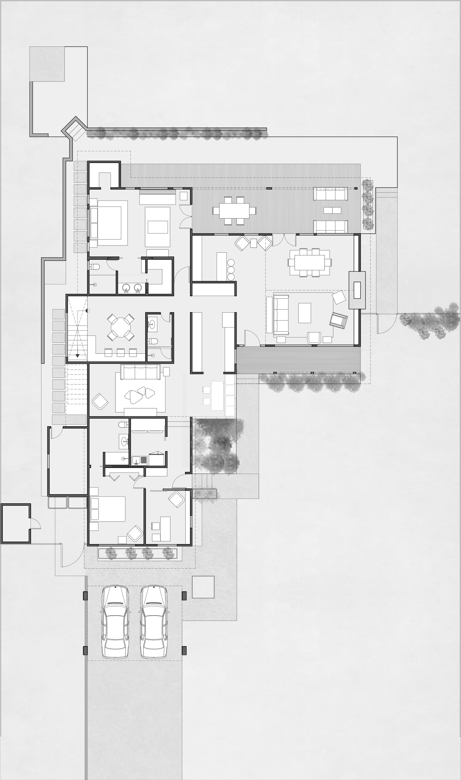El proyecto cuenta de dos plantas. En la planta baja se desarrolla gran parte del proyecto en donde se encuentra el área común que consta de sala, comedor y cocina, las cuales se abren hacia dos terrazas, una hacia el patio frontal de la casa y la otra hacia un patio trasero. Esta planta, también cuenta con dos recámaras, un estudio y una sala familiar. Todos los espacios interiores interactúan con el espacio exterior, haciendo a la naturaleza parte del proyecto.