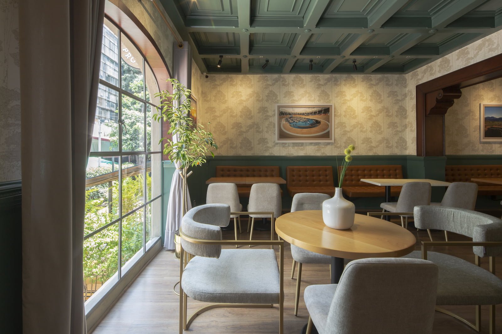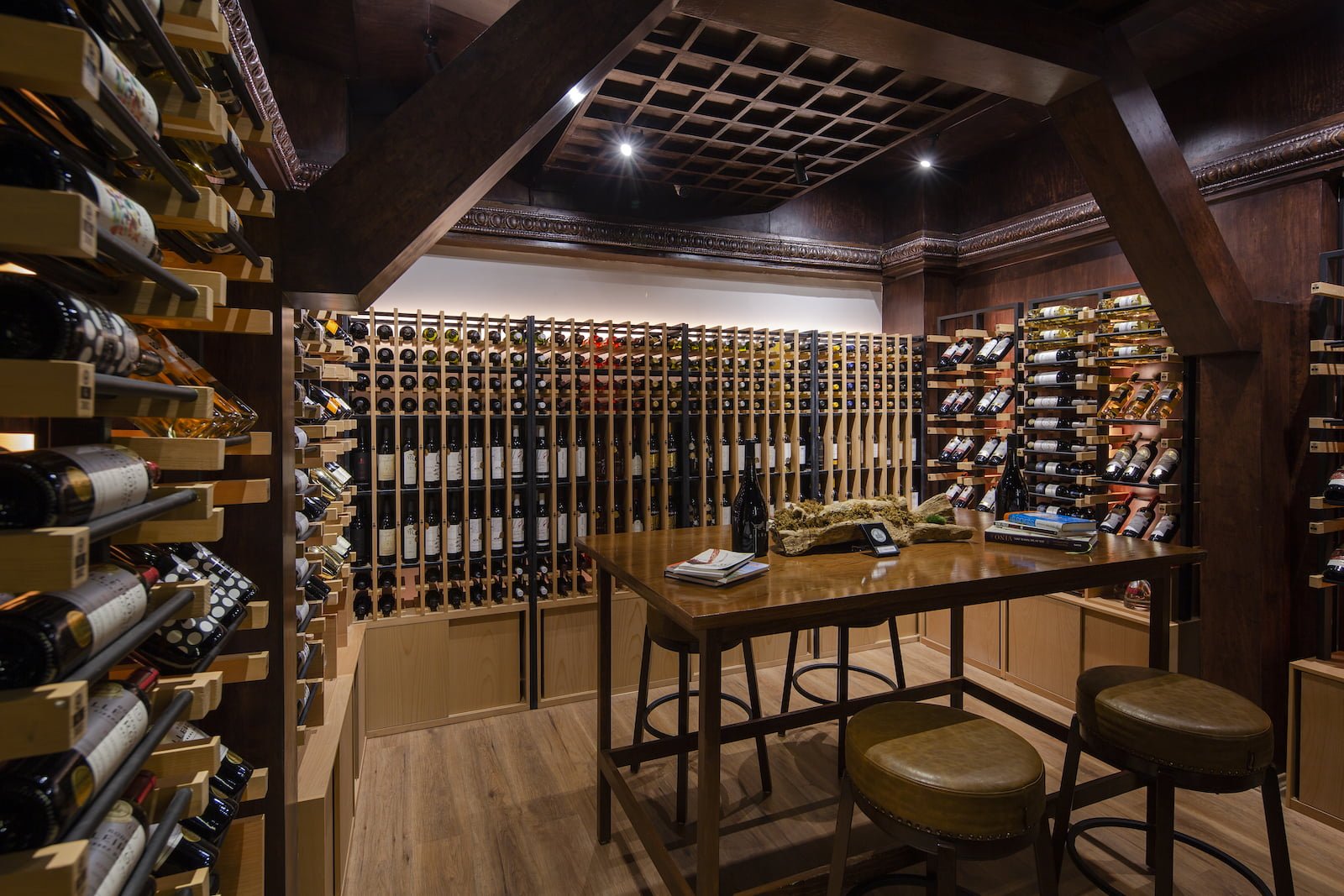 Dividido en 6 zonas. La recepción, con luz natural que hace la transición entre el salón y la enoteca ahí encontramos un muro que exhibe distintas recomendaciones de copeo por semana. El primer salón que se percibe íntimo y acogedor con iluminación puntual hacia las mesas y en la contrabarra, aquí resaltan las repisas con copas y columnas recubiertas de corcho y exhibición de botellas. El salón Ningxia, un espacio con iluminación roja, dedicado al vino de origen chino, ambientado de acuerdo con la estética tradicional de este país en donde resaltan elementos como los jarrones o la textura de escamas de dragón que logran una envolvente mística oriental. Una barra de té diseñada para disfrutar de las mejores selecciones de hojas de la Escuela Mexicana del Té. La Enoteca o wine library con un espacio central a doble altura, en donde percibimos tres escenas de luz, el reto principal fue la preservación del vino evitando iluminarlo directamente y al mismo tiempo darle gran presencia y carácter al espacio. La escalera es un elemento de transición iluminado en donde se exhiben copas y decantadores a través de la cual se asciende a la planta alta en donde se buscó conservar el plafón de madera como elemento arquitectónico para ello se intervino solo en puntos precisos para colocar luminarios discretos y eficientes.
